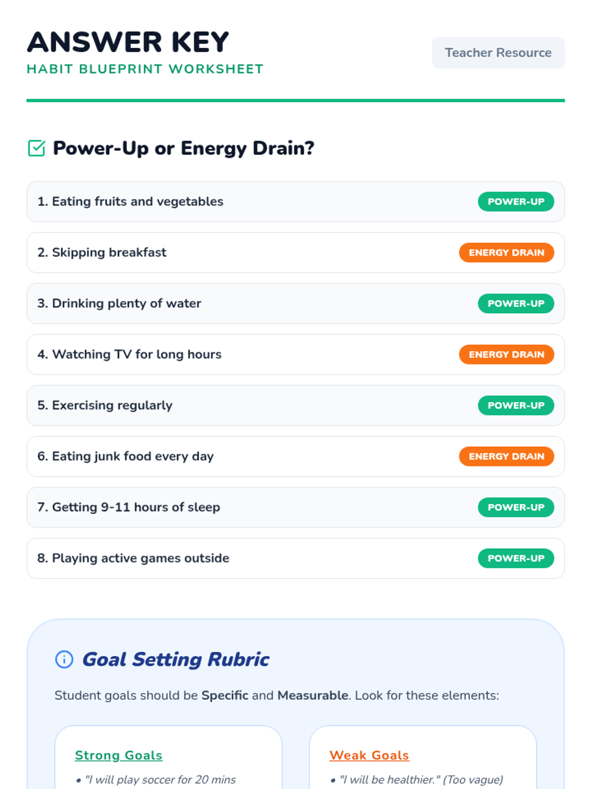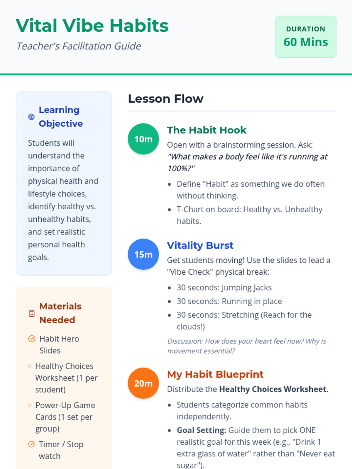 A comprehensive lesson for Grade 5 students on physical health, identifying habits, and setting personal lifestyle goals through interactive activities and games.