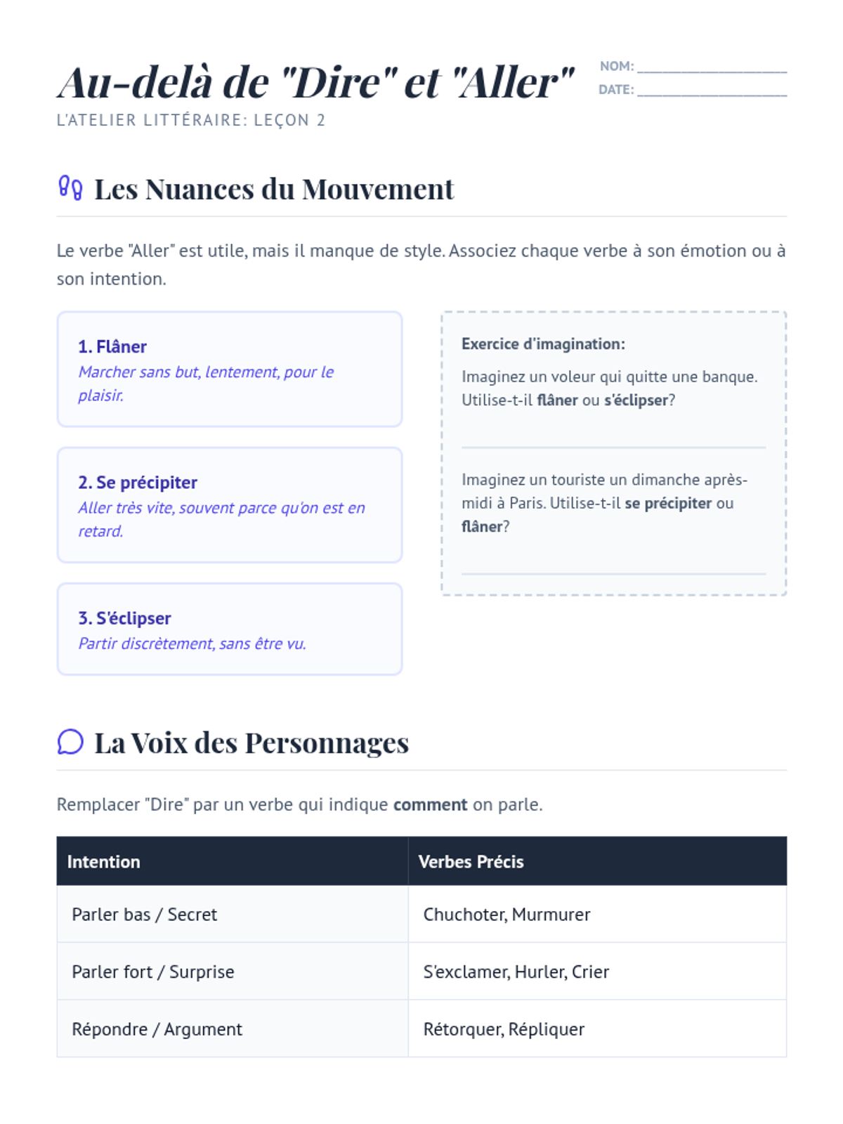 Focusing on narrative precision, students explore synonyms for 'dire' and 'aller' to add nuance to their storytelling.