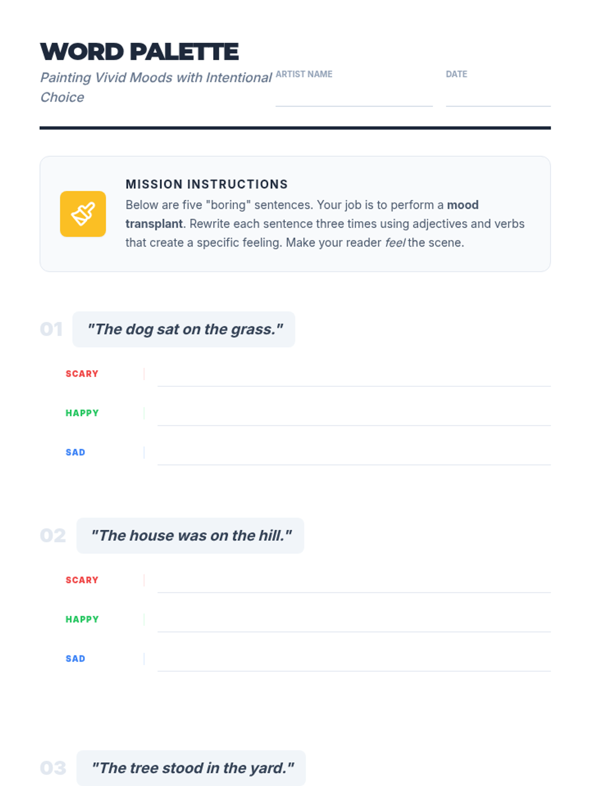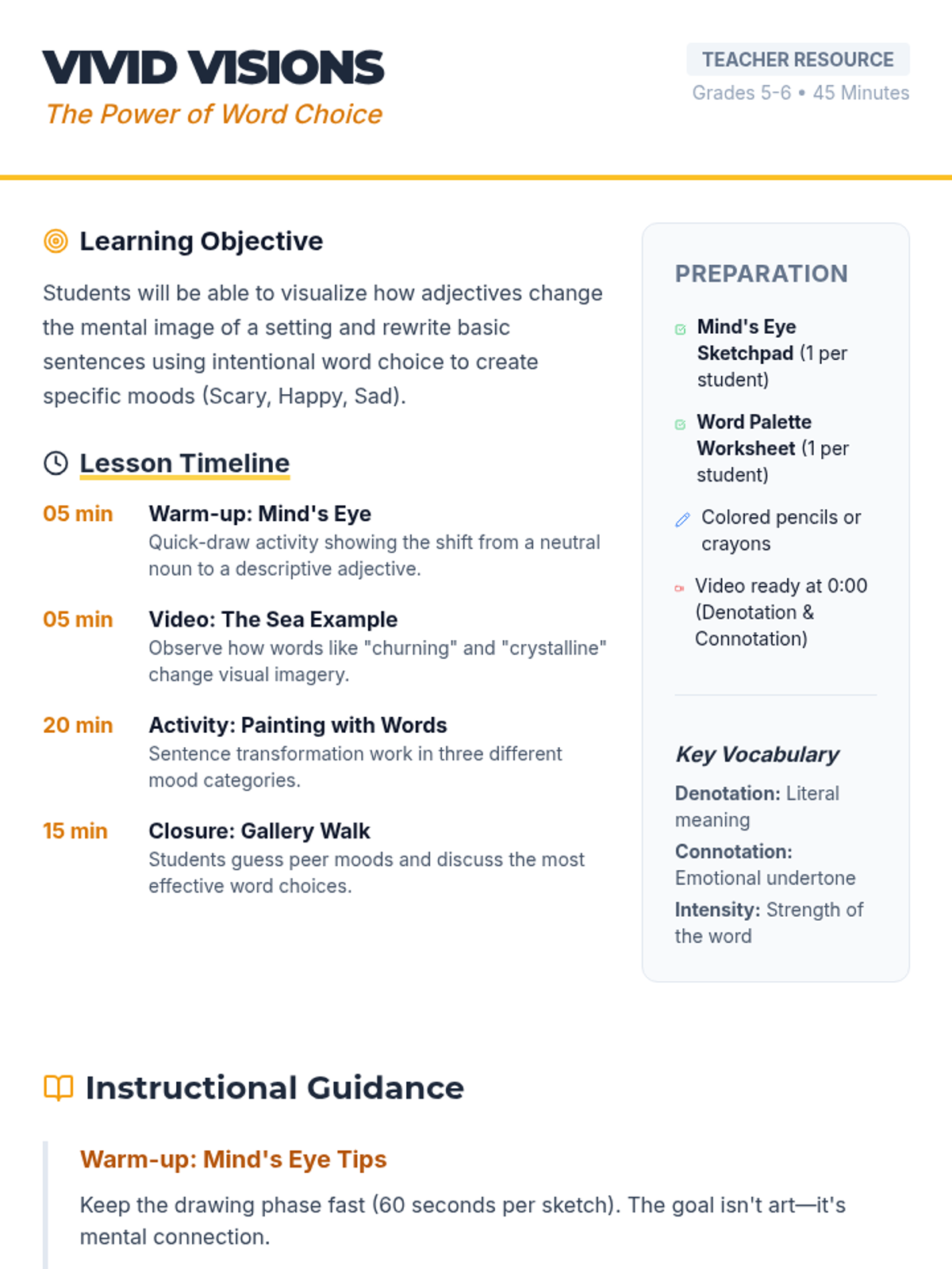 Students will discover how intentional word choice, specifically adjectives and connotations, transforms a reader's mental image. They will practice rewriting simple sentences into vivid descriptions that evoke specific moods: scary, happy, and sad.
