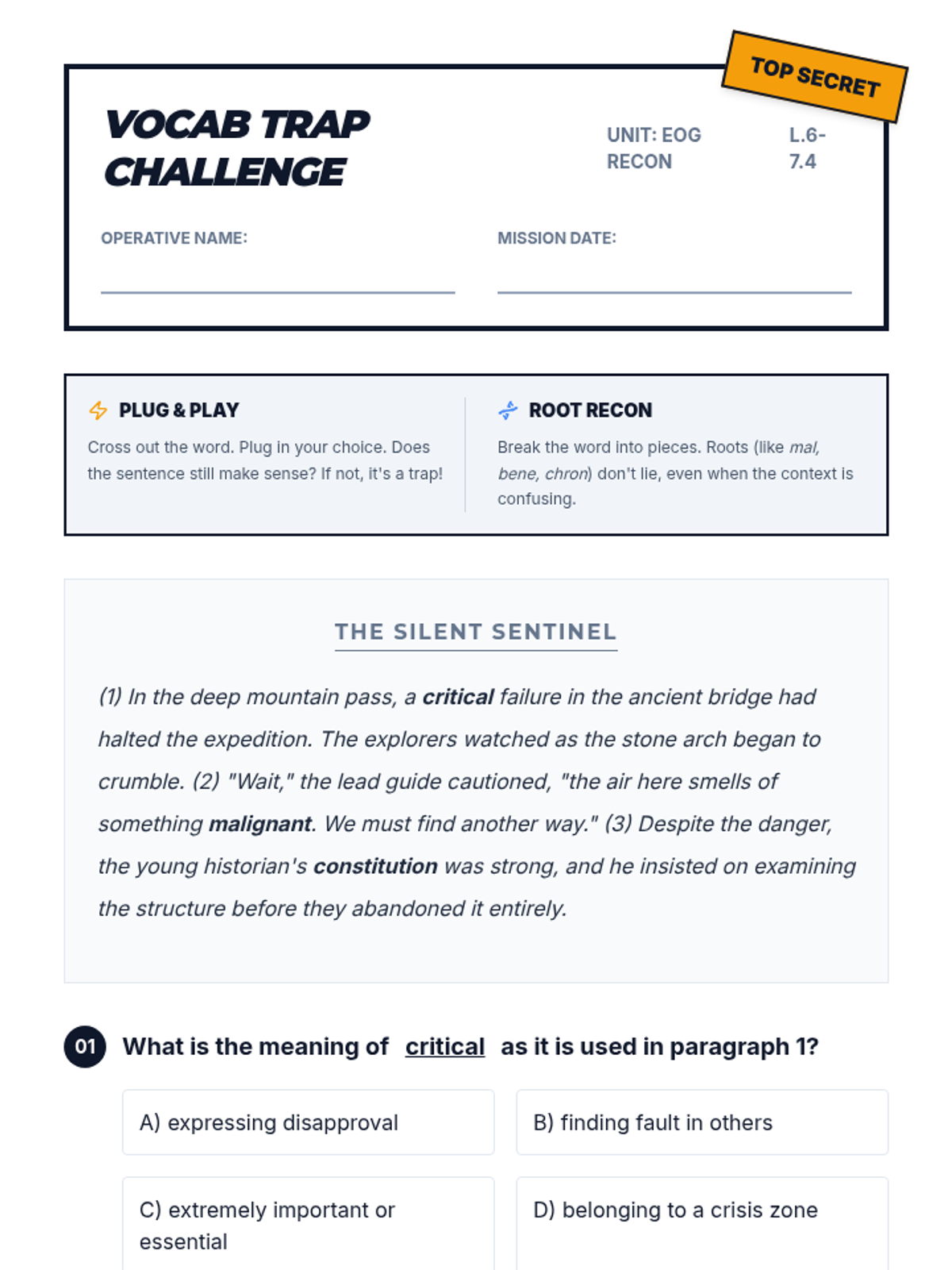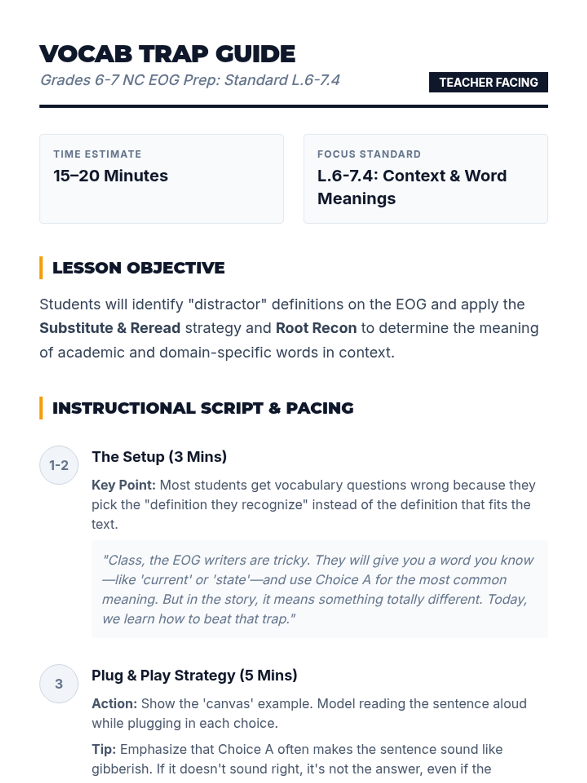 A targeted mini-lesson for Grades 6-7 focusing on L.6-7.4, teaching students to avoid common definition pitfalls and use context/roots to decode EOG vocabulary.