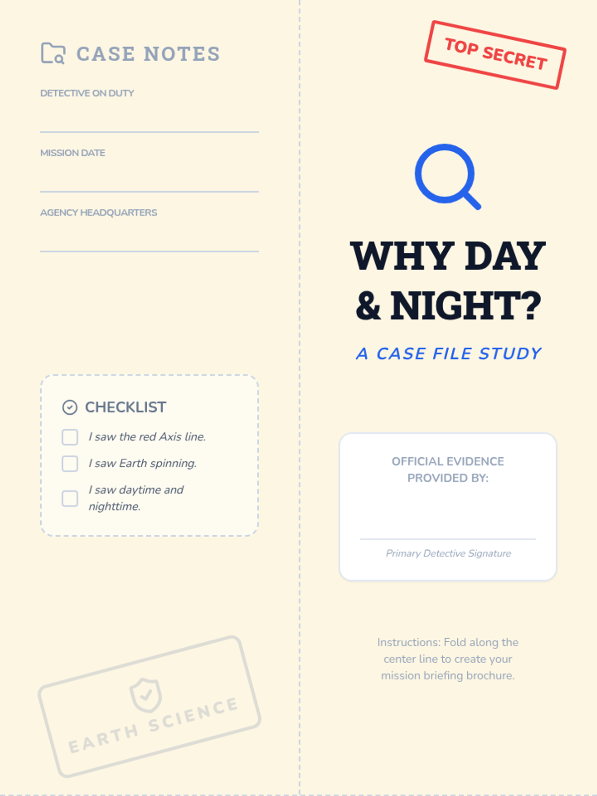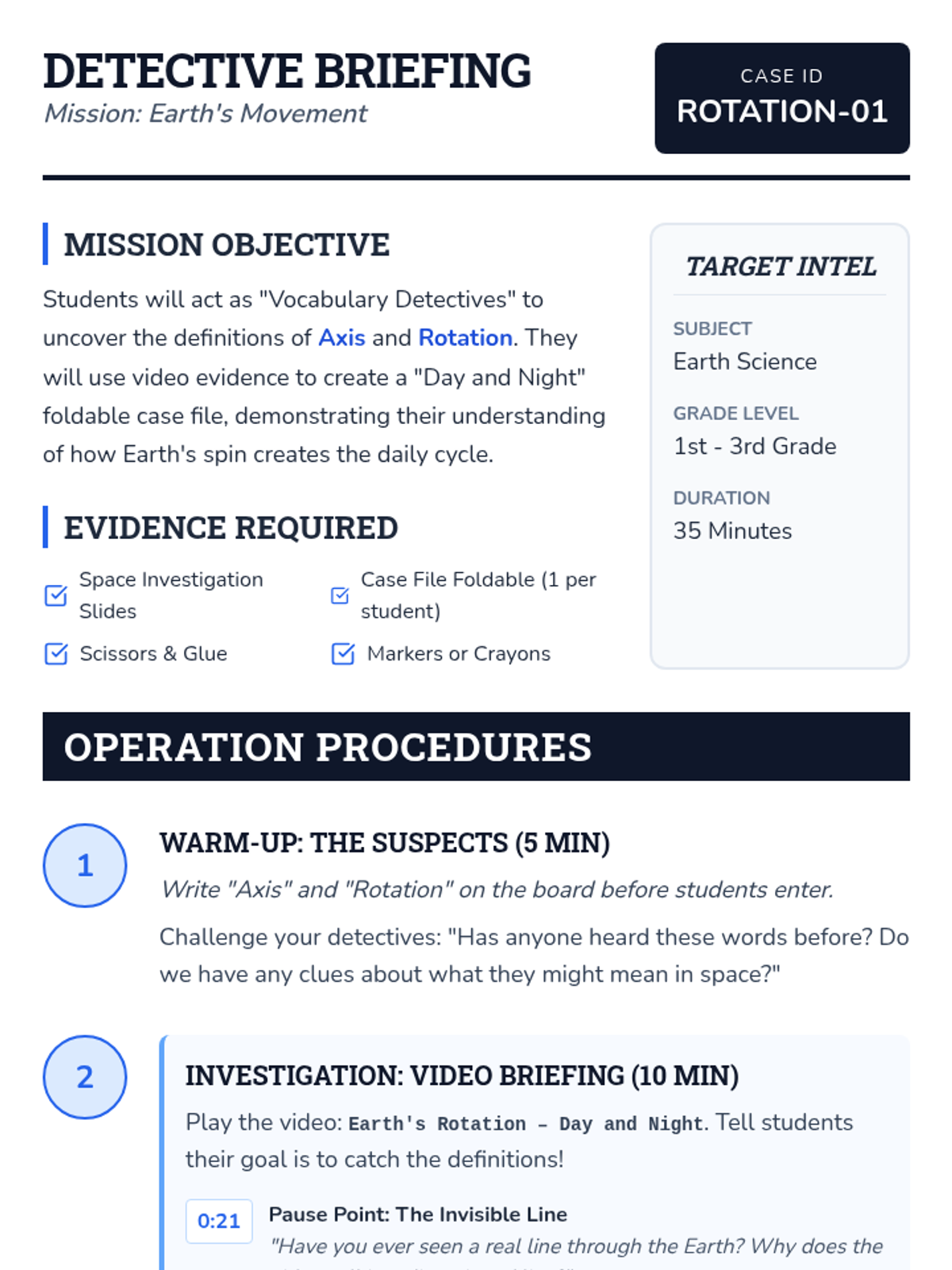 A primary science lesson where students act as 'vocabulary detectives' to discover the concepts of Earth's axis and rotation through a video investigation and a creative foldable project.