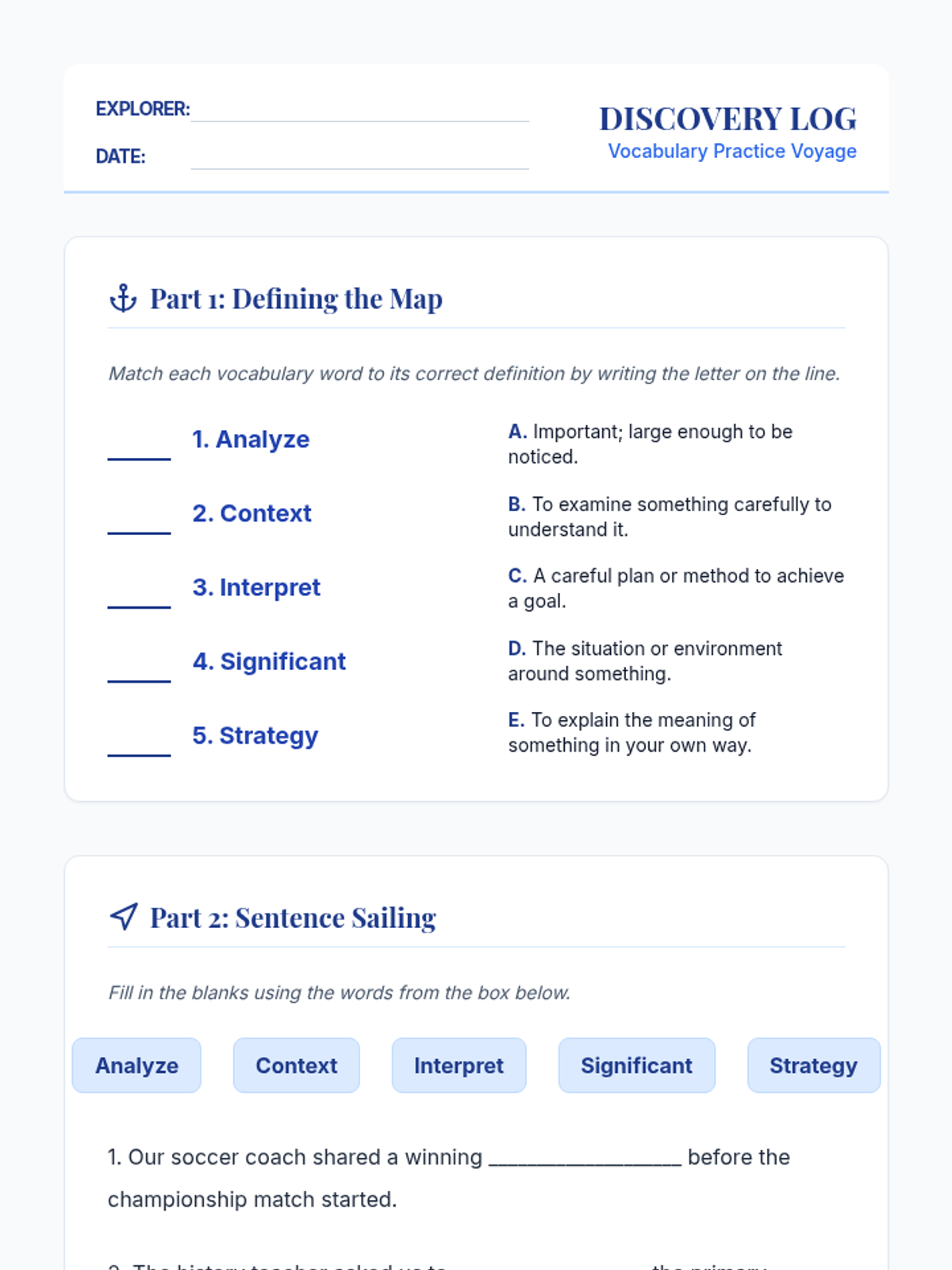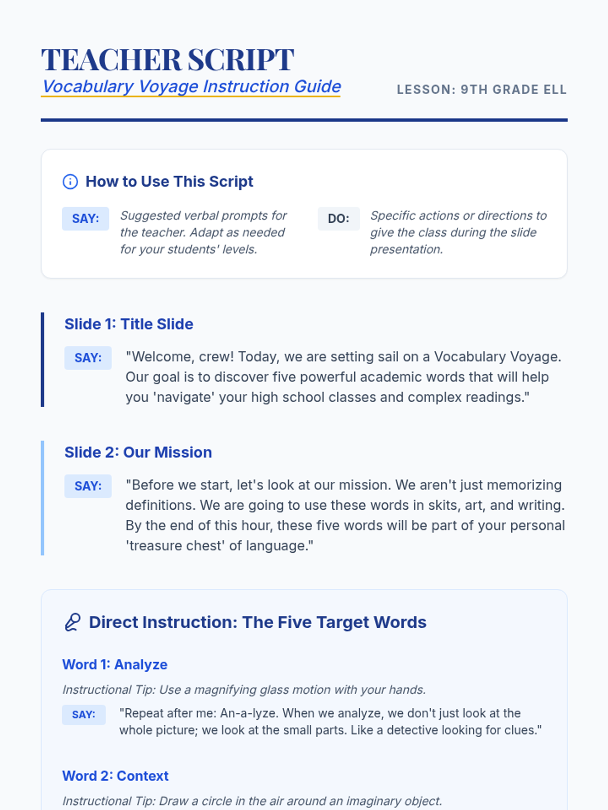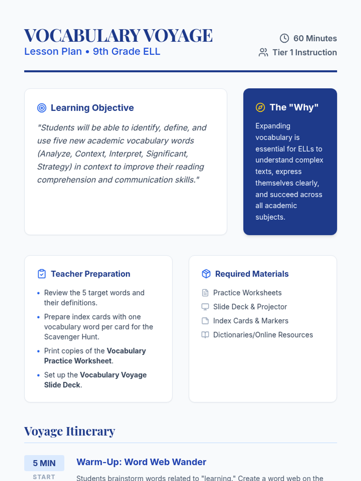 An interactive 9th-grade ELL lesson focused on mastering five essential academic vocabulary words through exploration and creative collaboration.