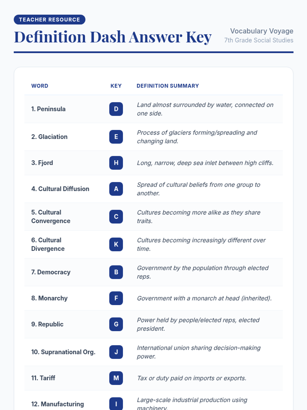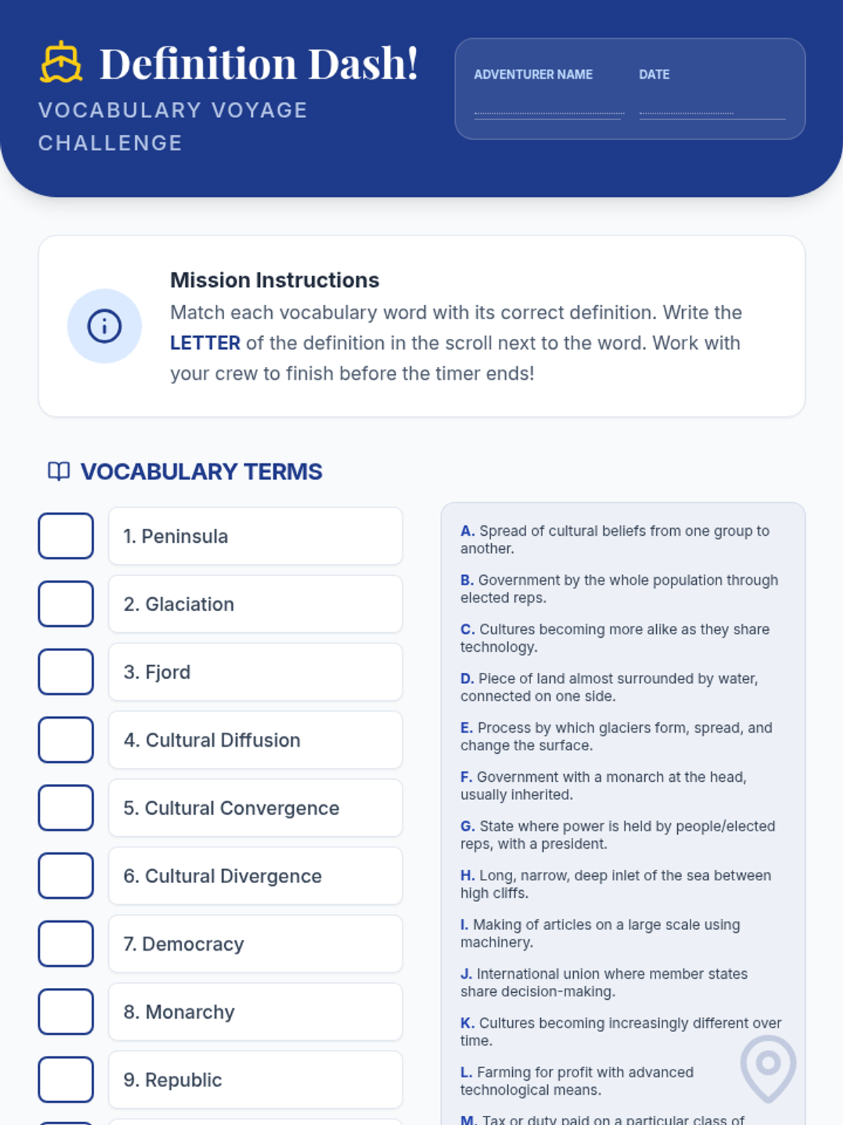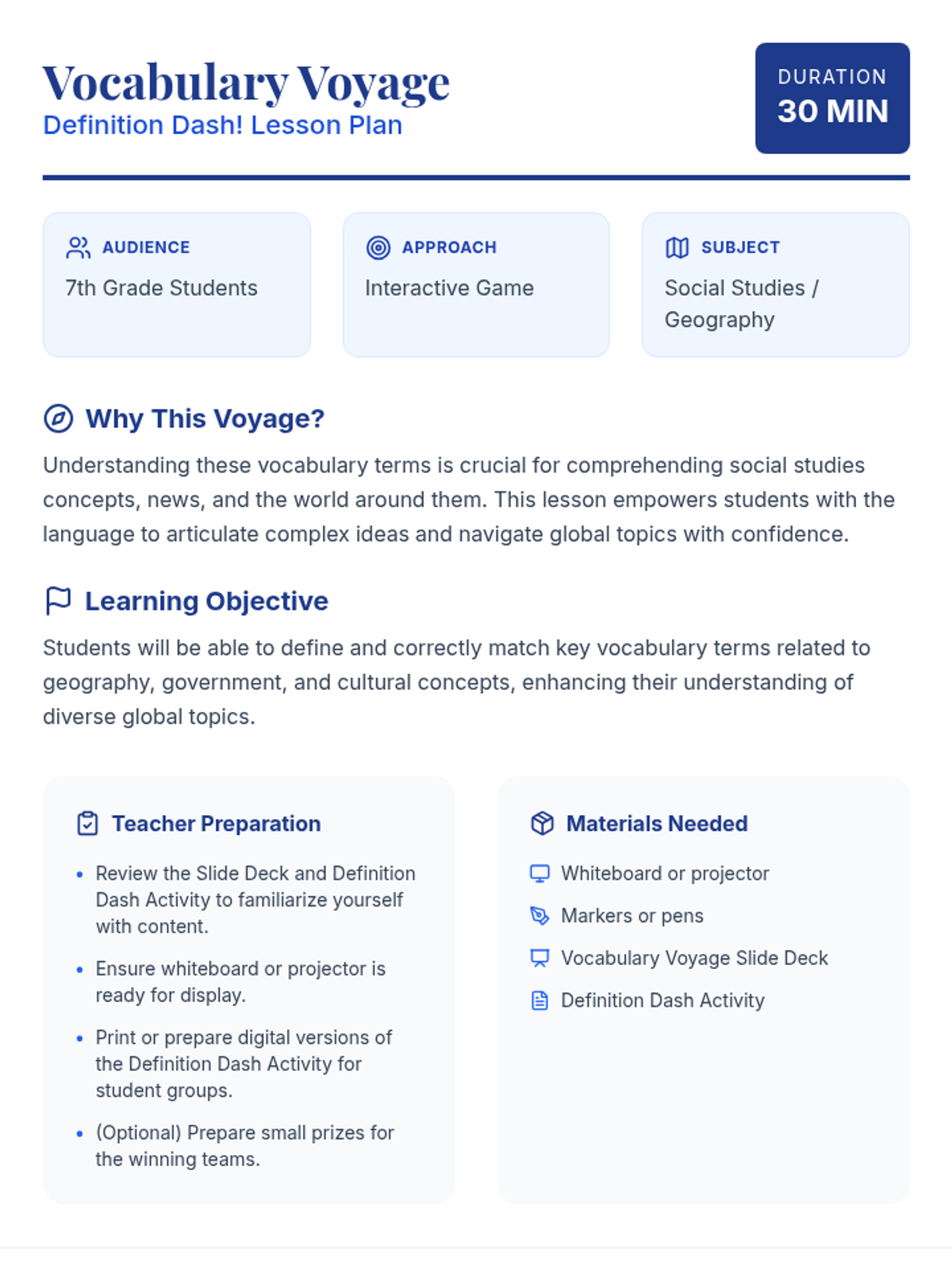 A fast-paced 30-minute Tier 1 lesson for 7th-grade students to master key geography and government vocabulary through an interactive matching challenge.