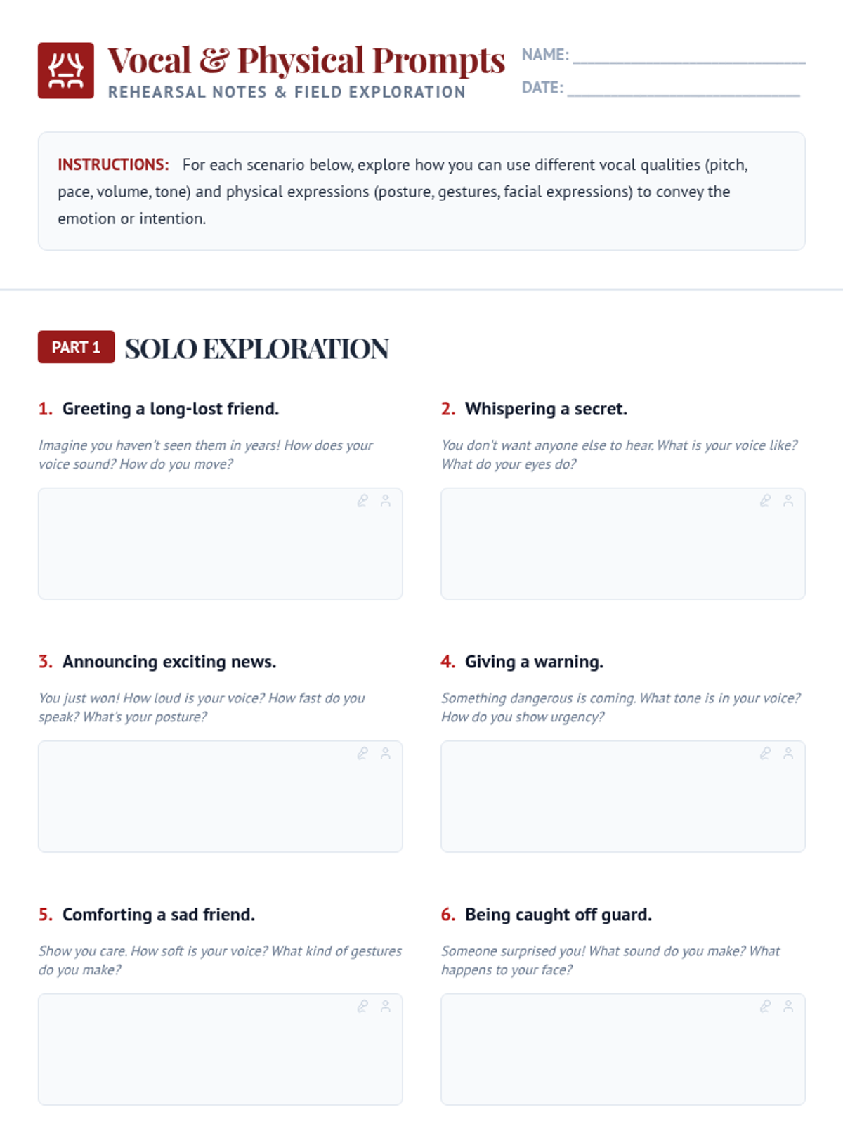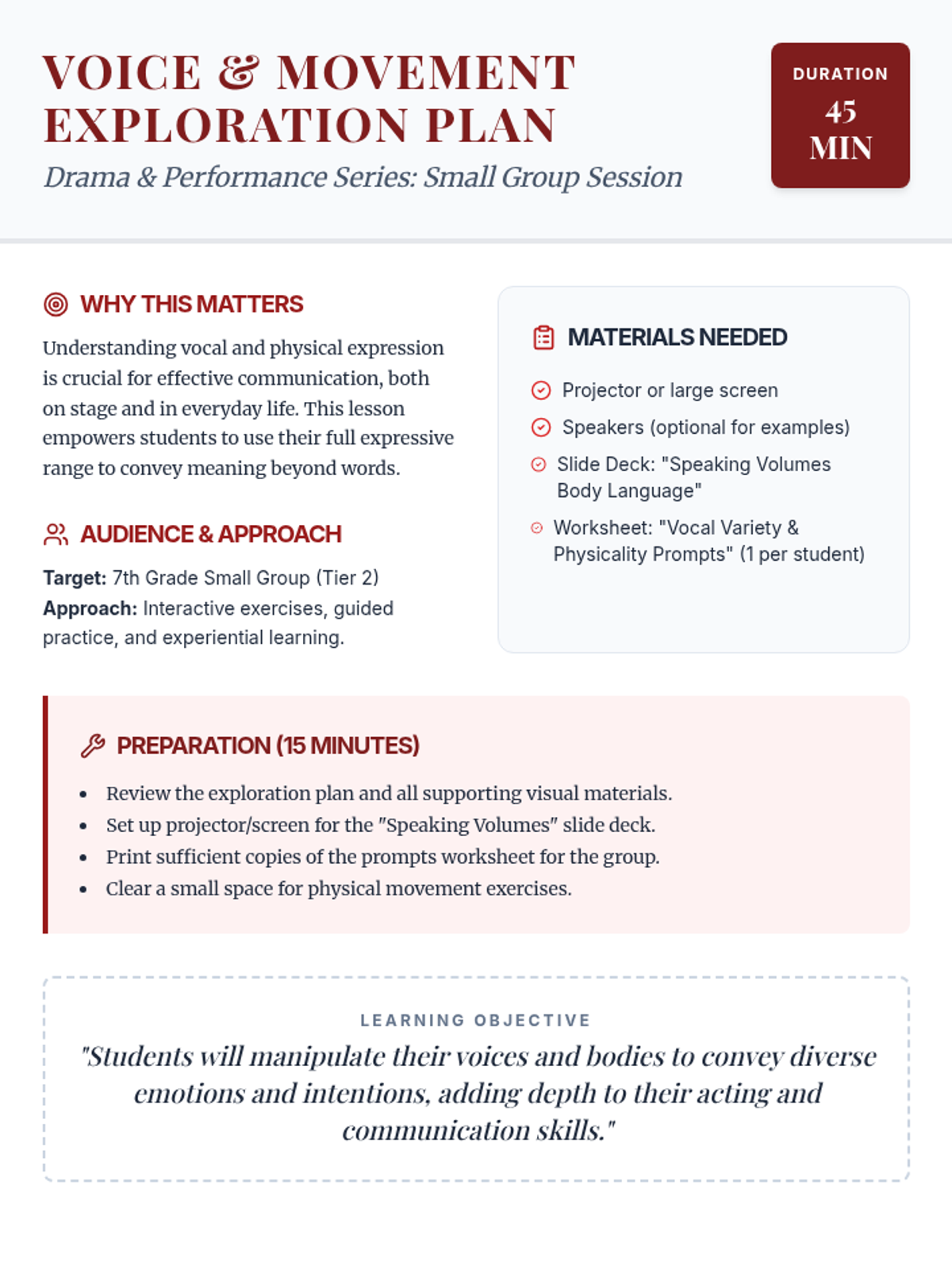 Explore the power of vocal expression and physical storytelling in this 7th-grade small group lesson. Students manipulate pitch, pace, volume, and tone alongside posture and gestures to convey deep emotion and character intention.