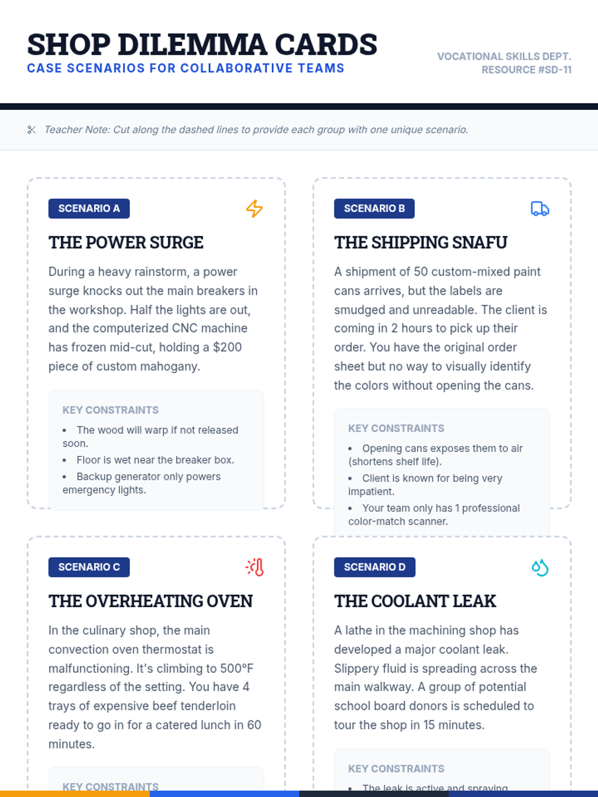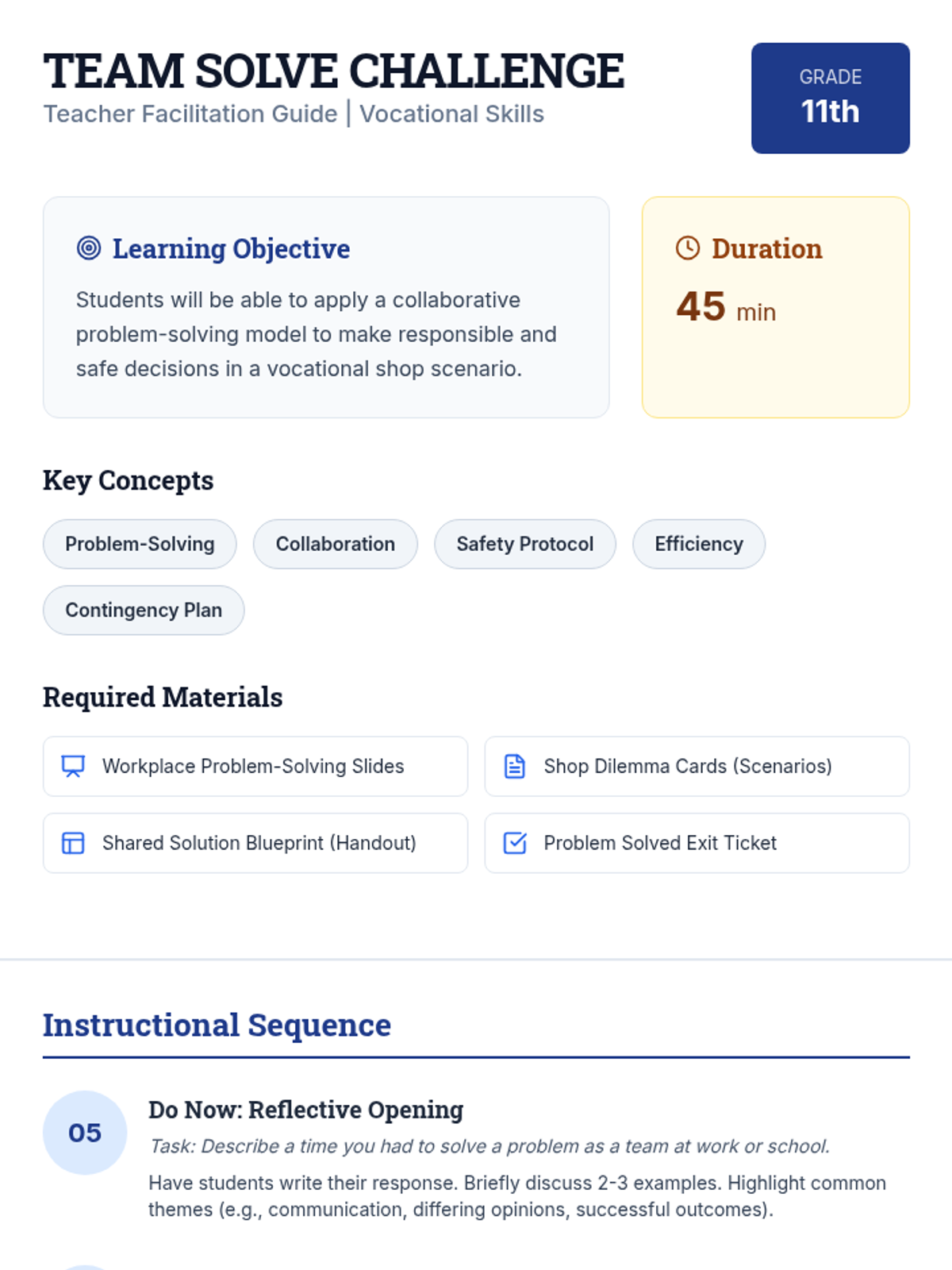 An 11th-grade vocational lesson focused on collaborative problem-solving in a workshop setting. Students learn a structured model for safe and efficient decision-making when faced with workplace challenges.