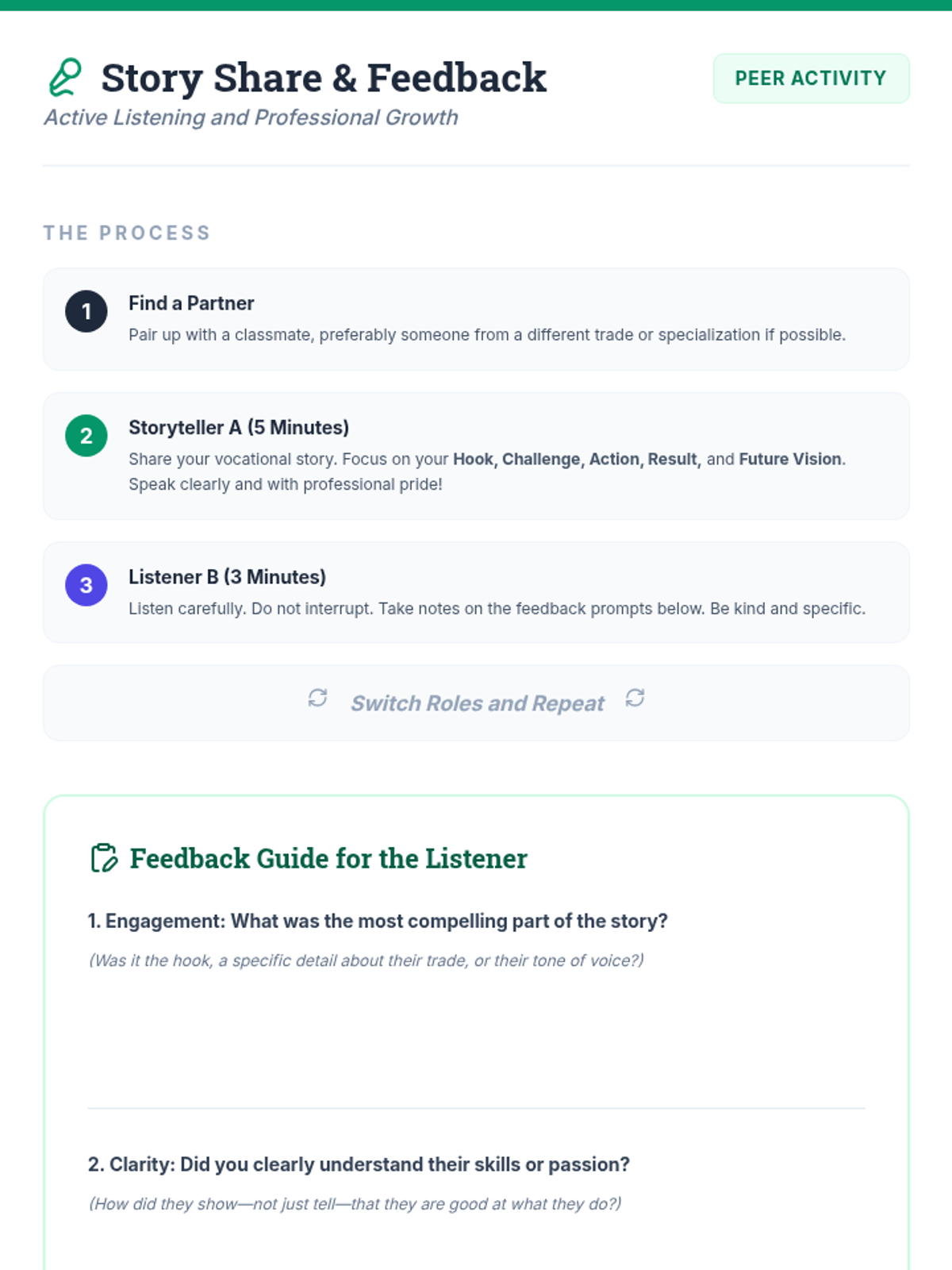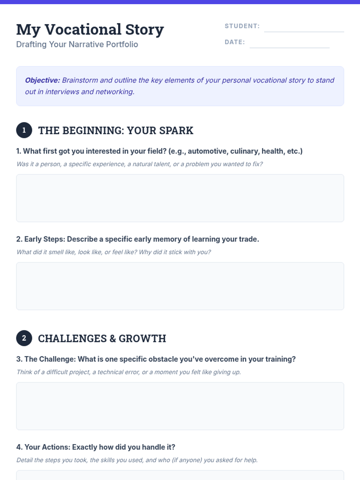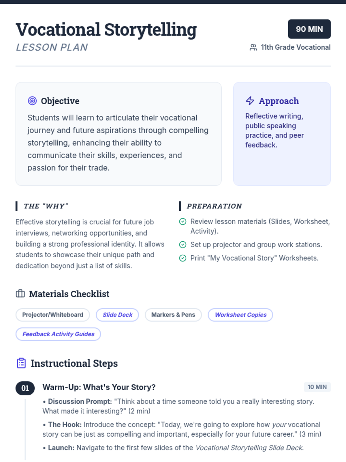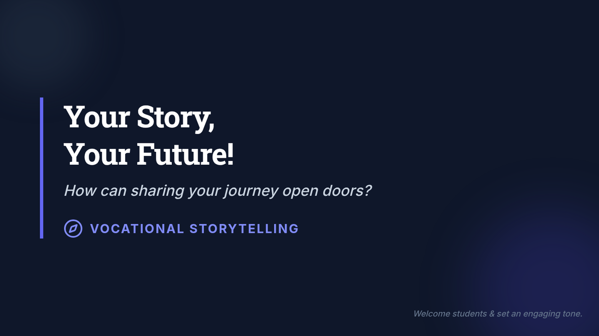 This lesson empowers 11th-grade vocational students to craft and share their unique career narratives, focusing on articulating their skills, passion, and future goals for professional networking and interviews.