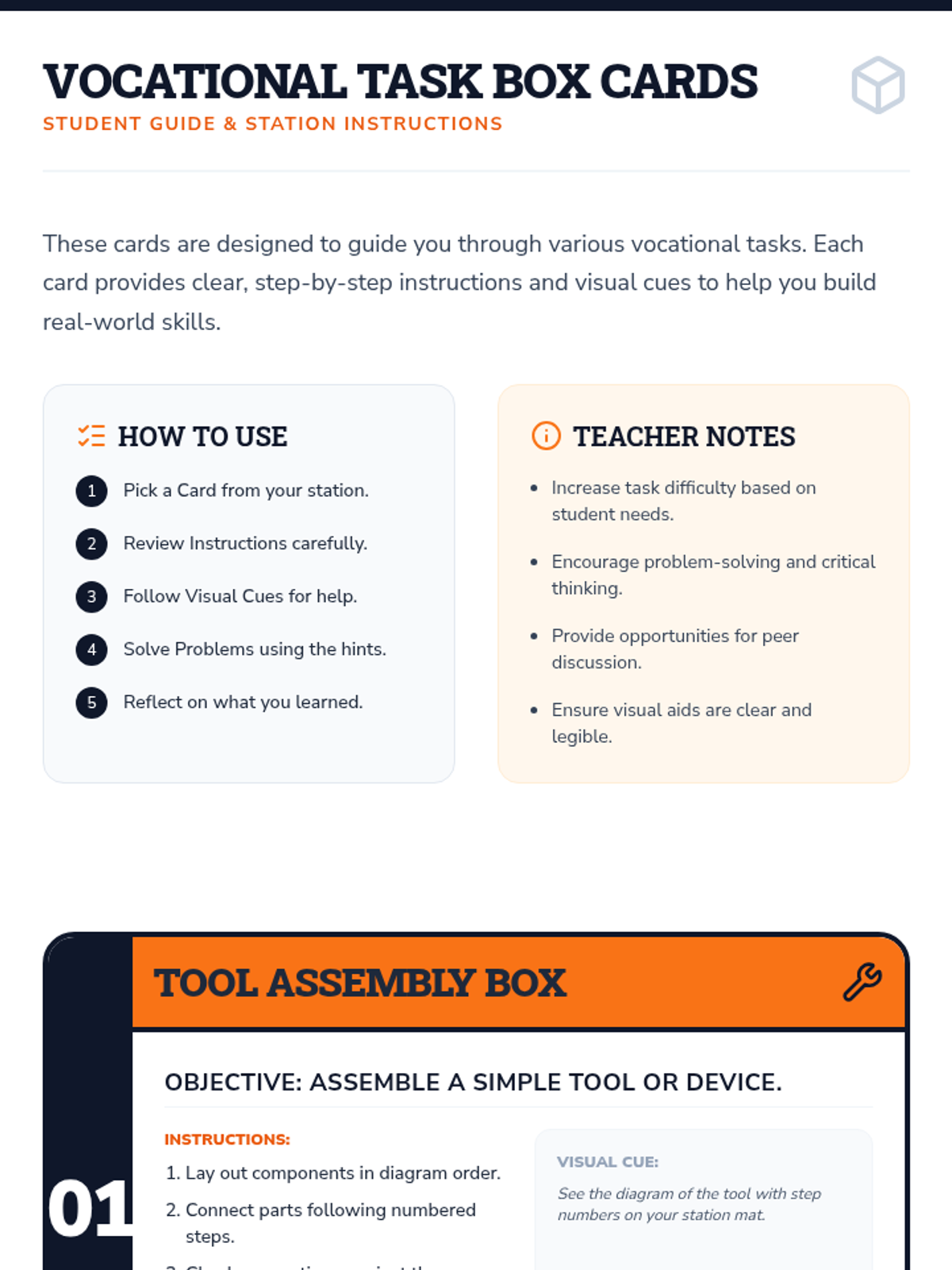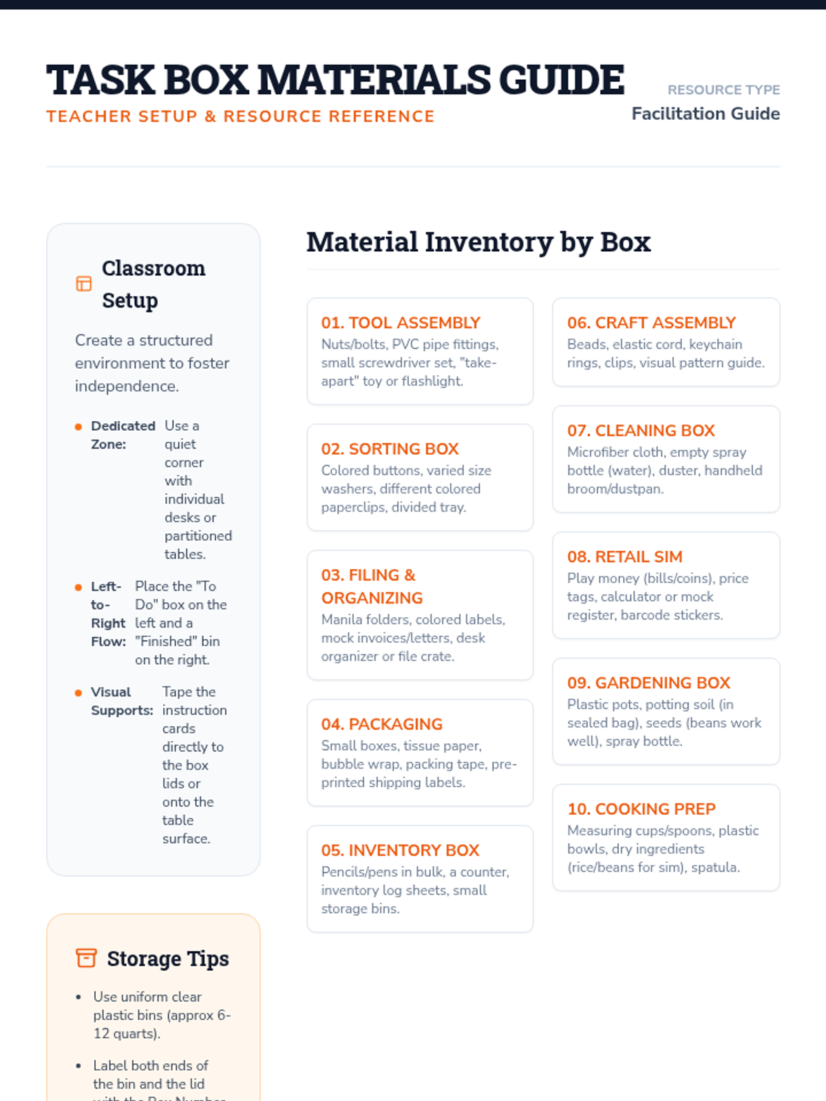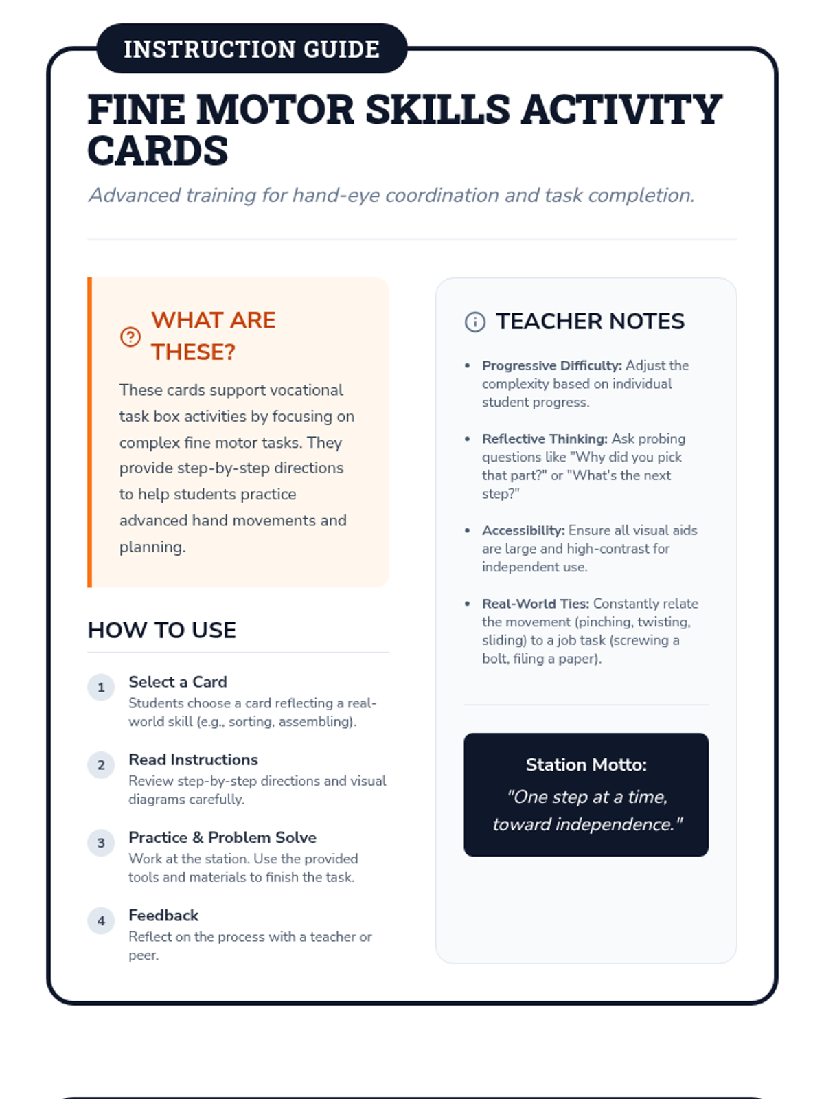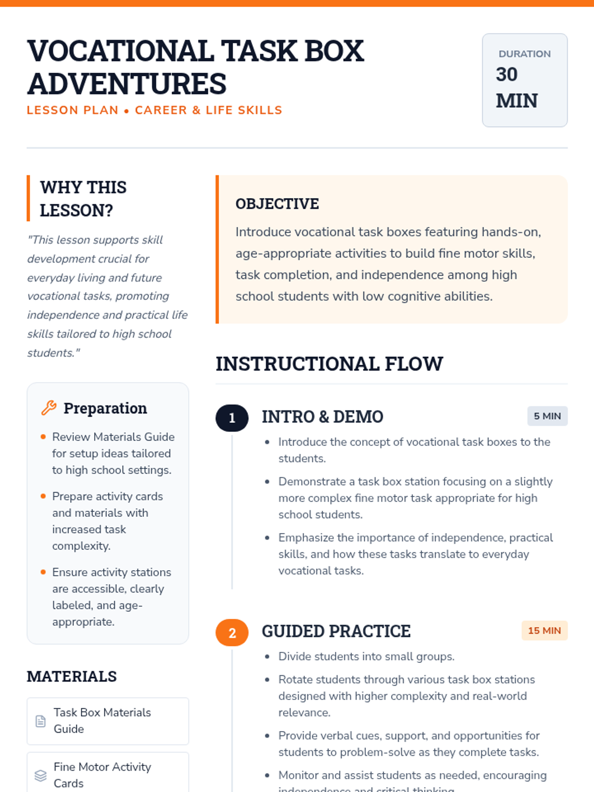 A 30-minute introductory lesson for high school students with low cognitive abilities, focusing on developing fine motor skills and independence through structured vocational task boxes.