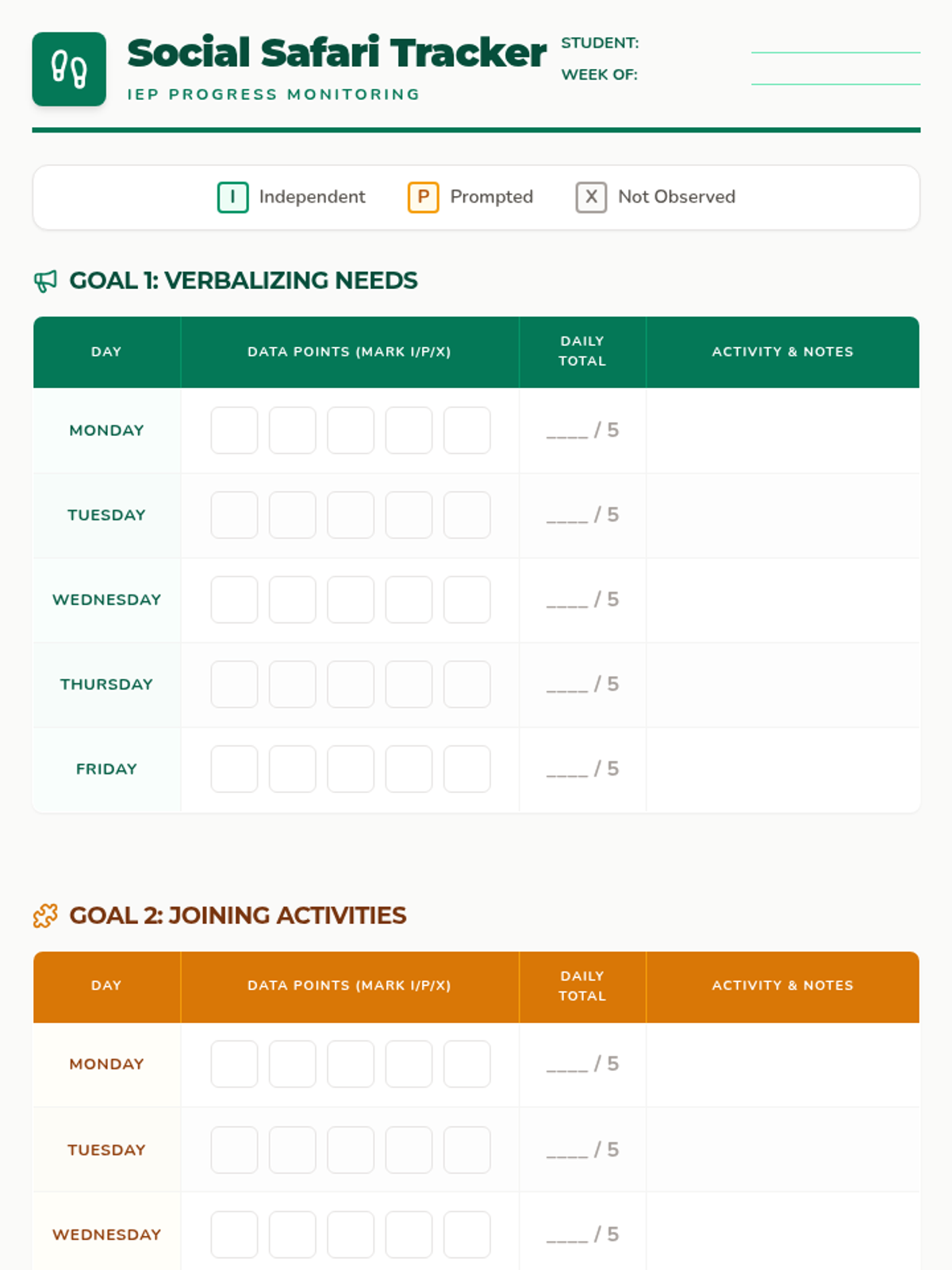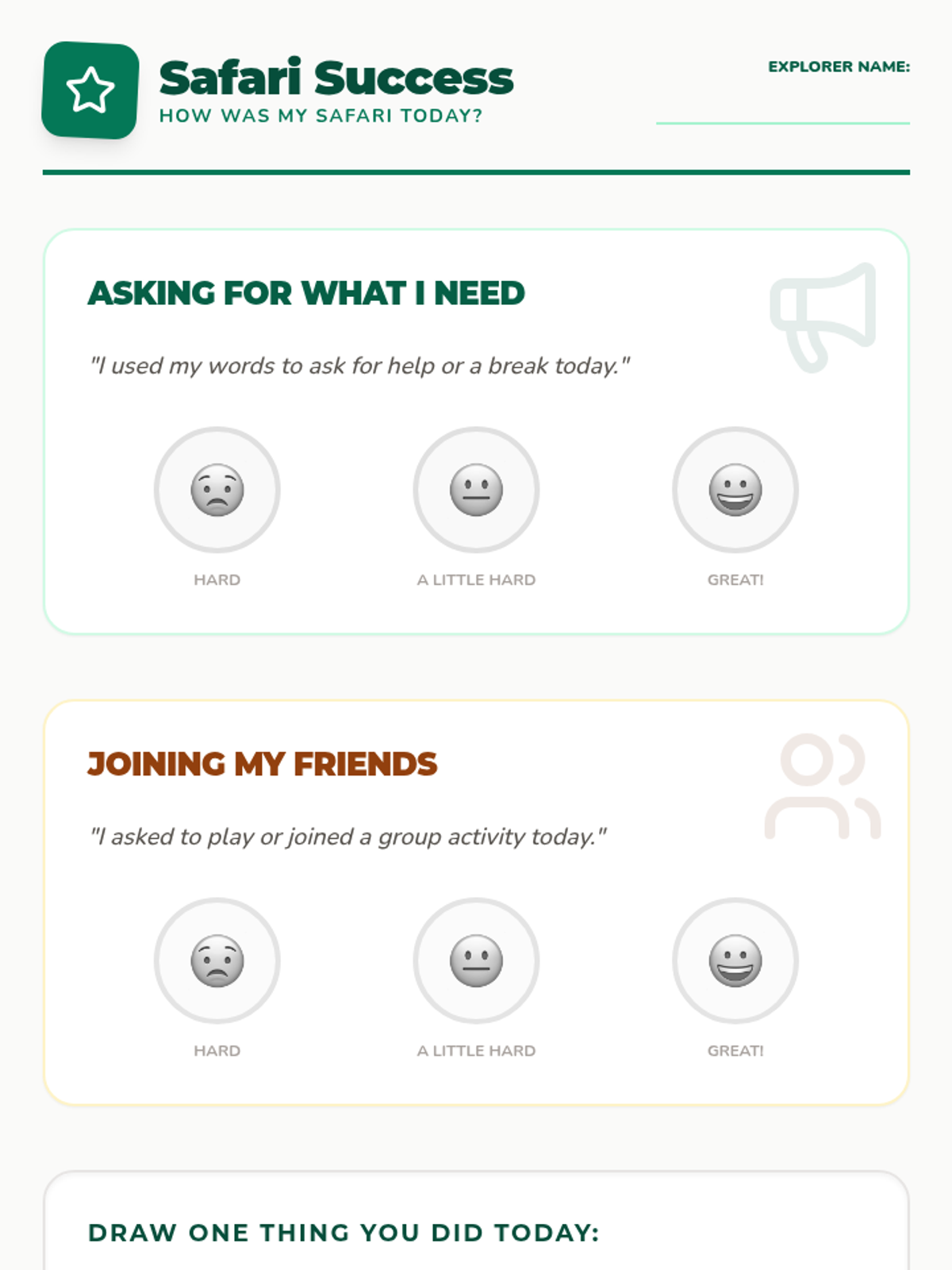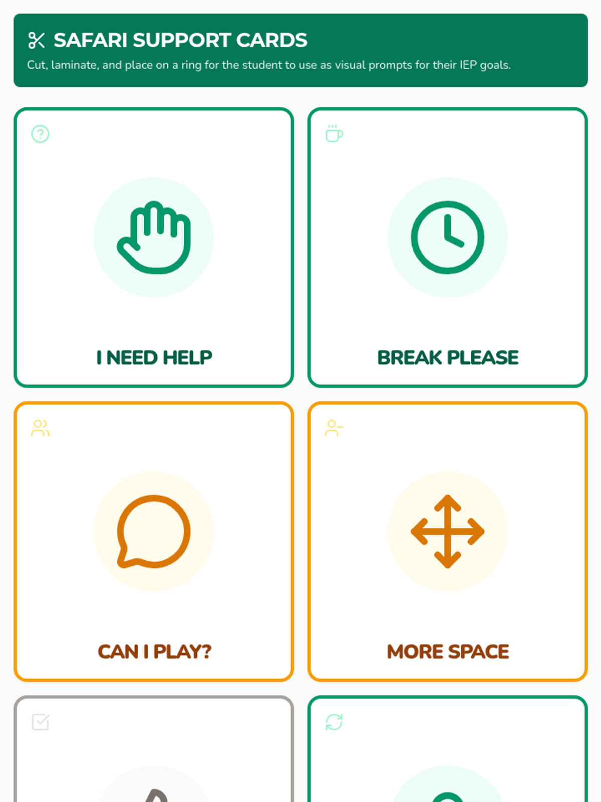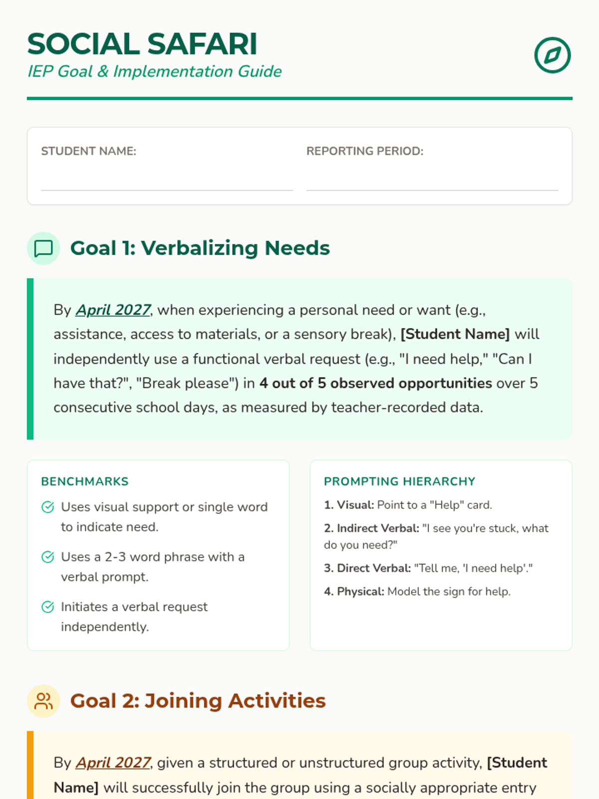 A set of IEP support materials for a kindergartener working on verbalizing needs and joining group activities, featuring a cohesive safari theme.