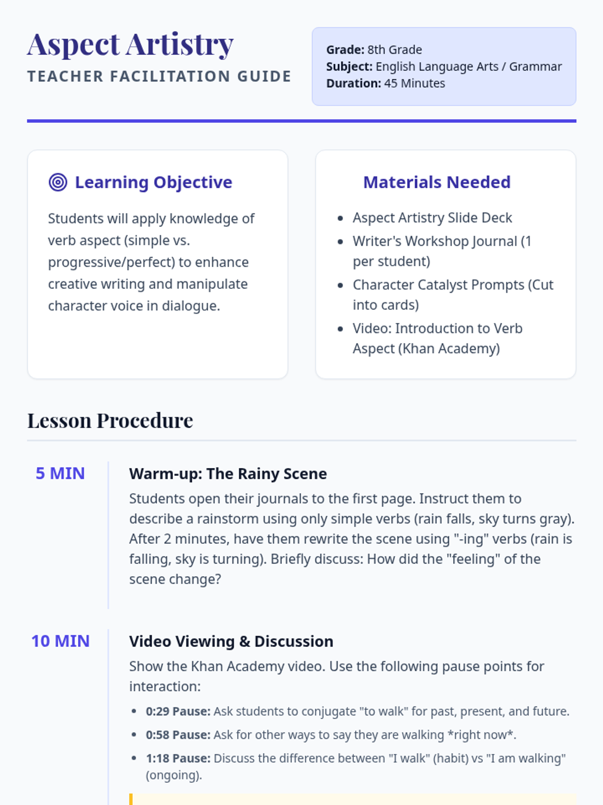 An 8th-grade grammar and creative writing lesson that explores verb aspect as a tool for character voice, moving beyond simple tenses to nuanced expression.