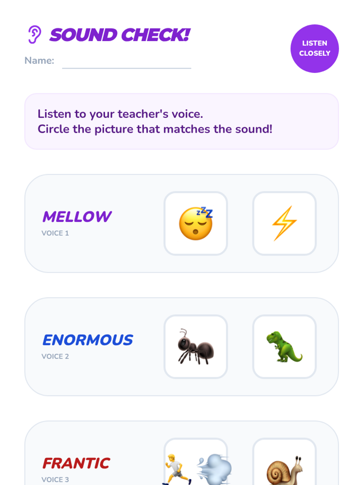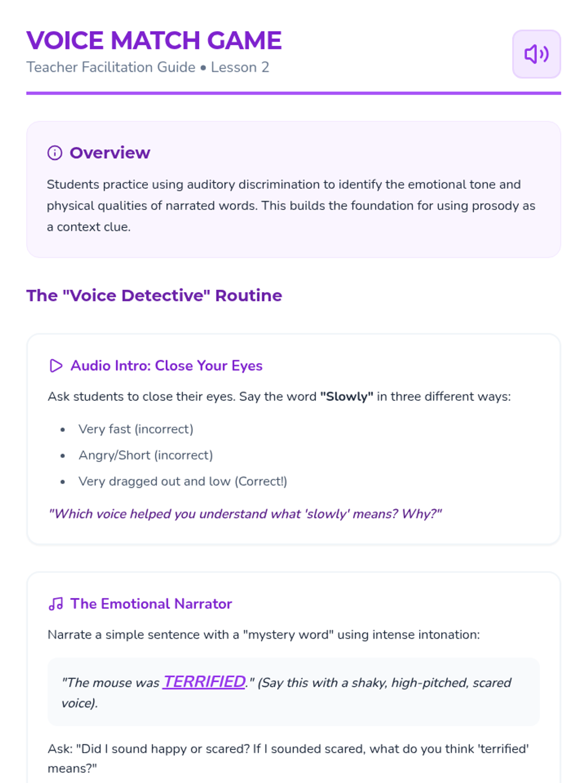 Students focus on audio narration to understand vocabulary. They explore how the narrator's tone, volume, and speed provide clues to a word's meaning.