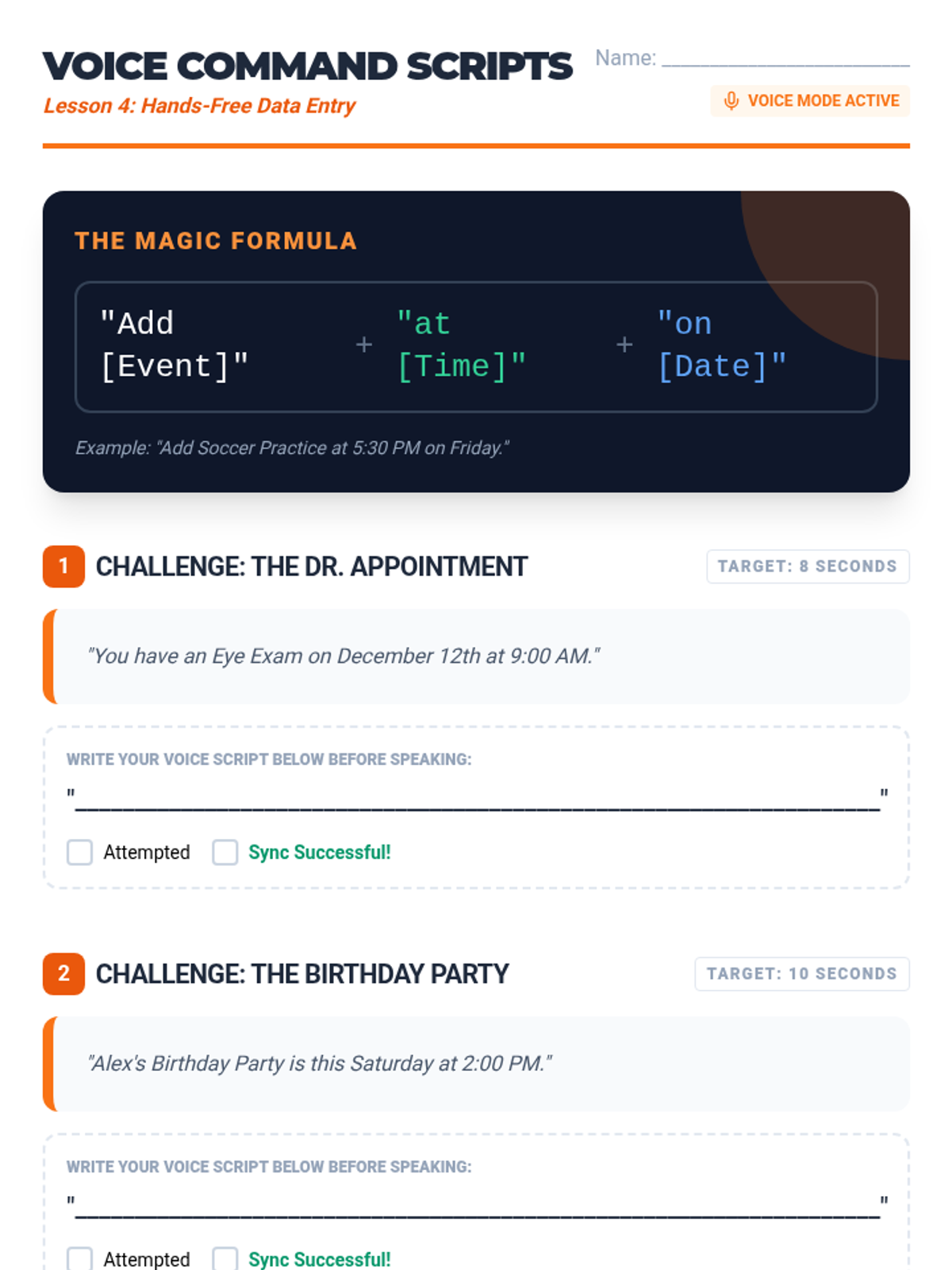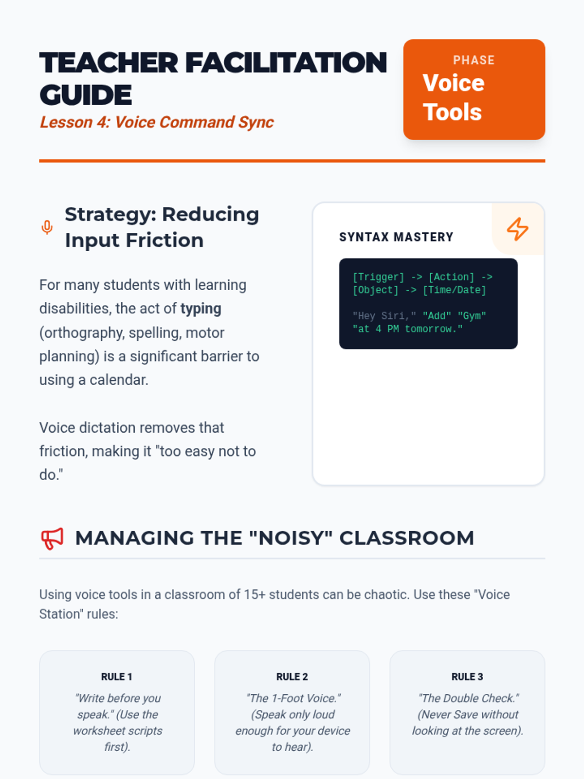 Students learn and practice using voice assistants to add events hands-free, focusing on specific syntax for accuracy.