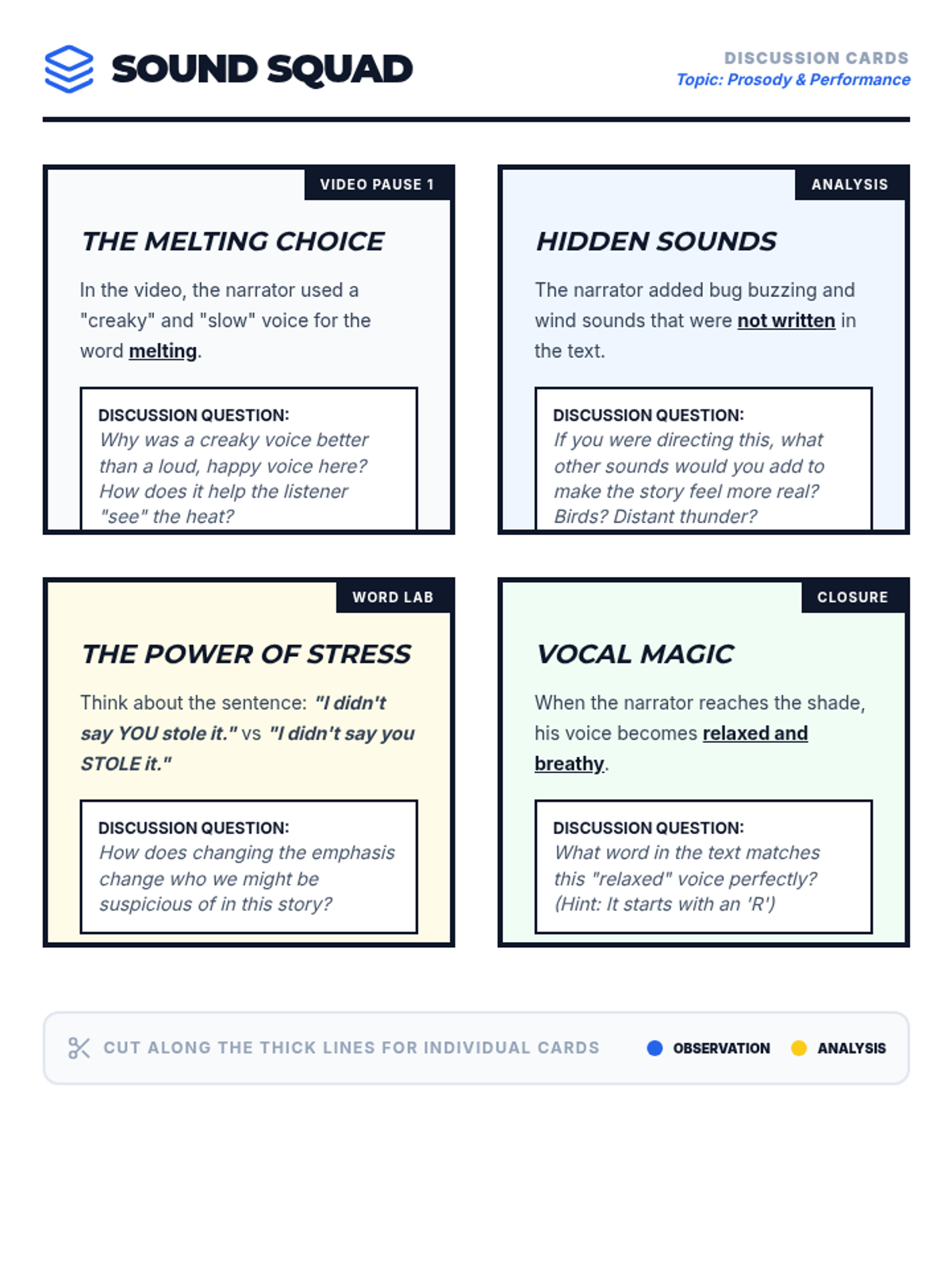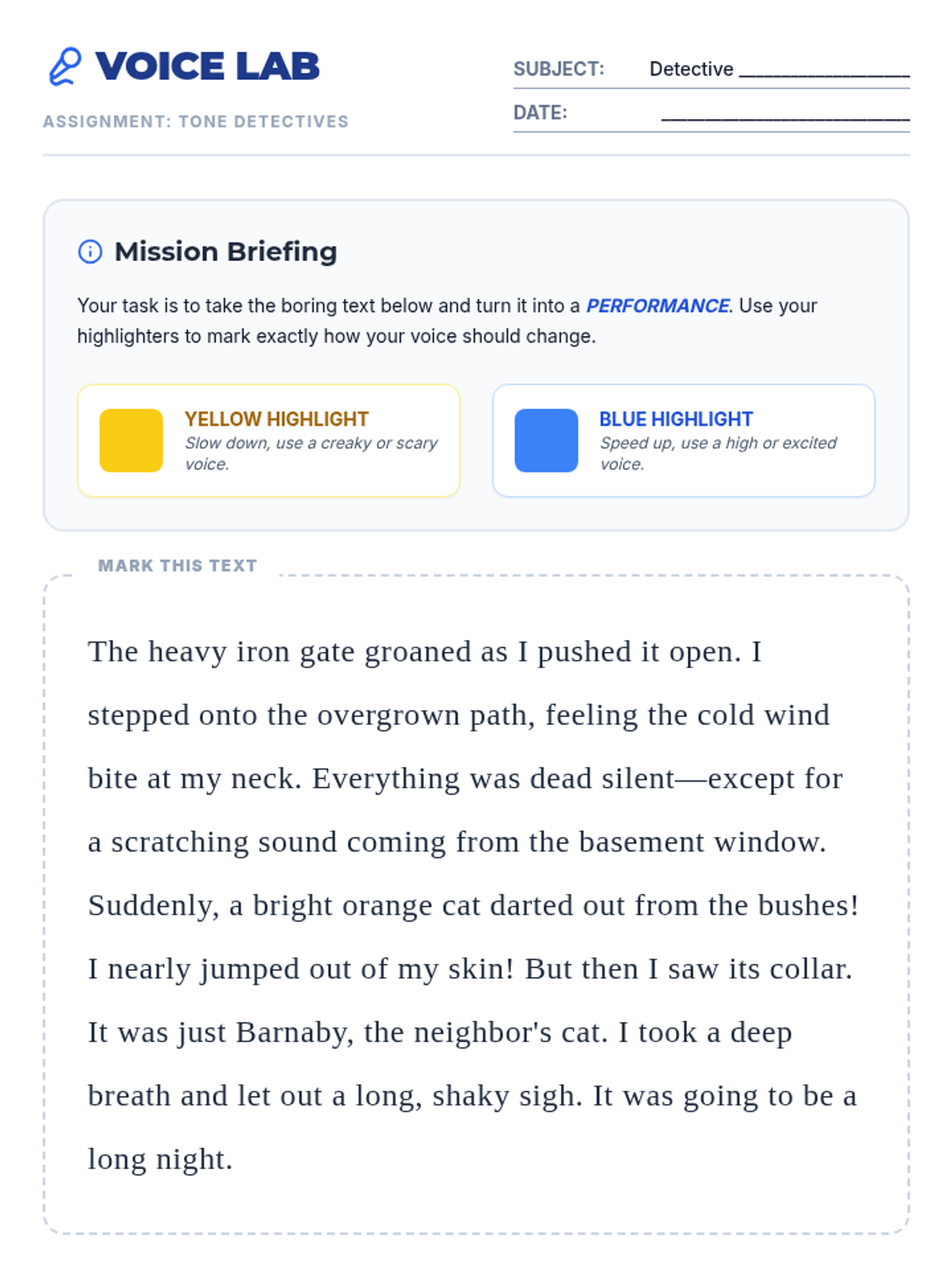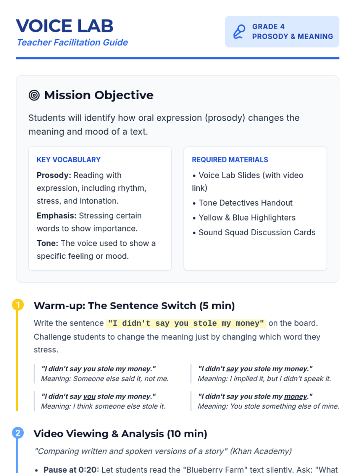 Students explore how oral expression (prosody) changes the meaning and mood of a text through a 'Voice Lab' theme. The lesson includes a warm-up activity, video analysis of performance versus text, and a 'Tone Detectives' marking activity.
