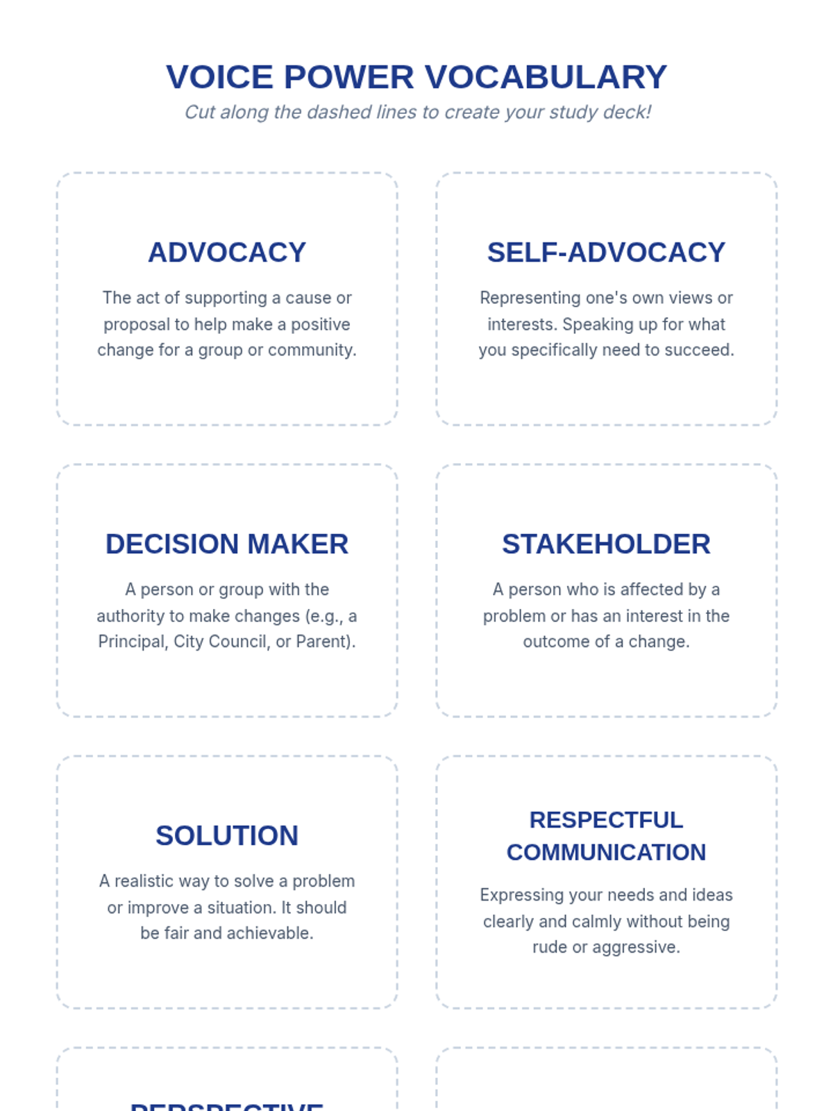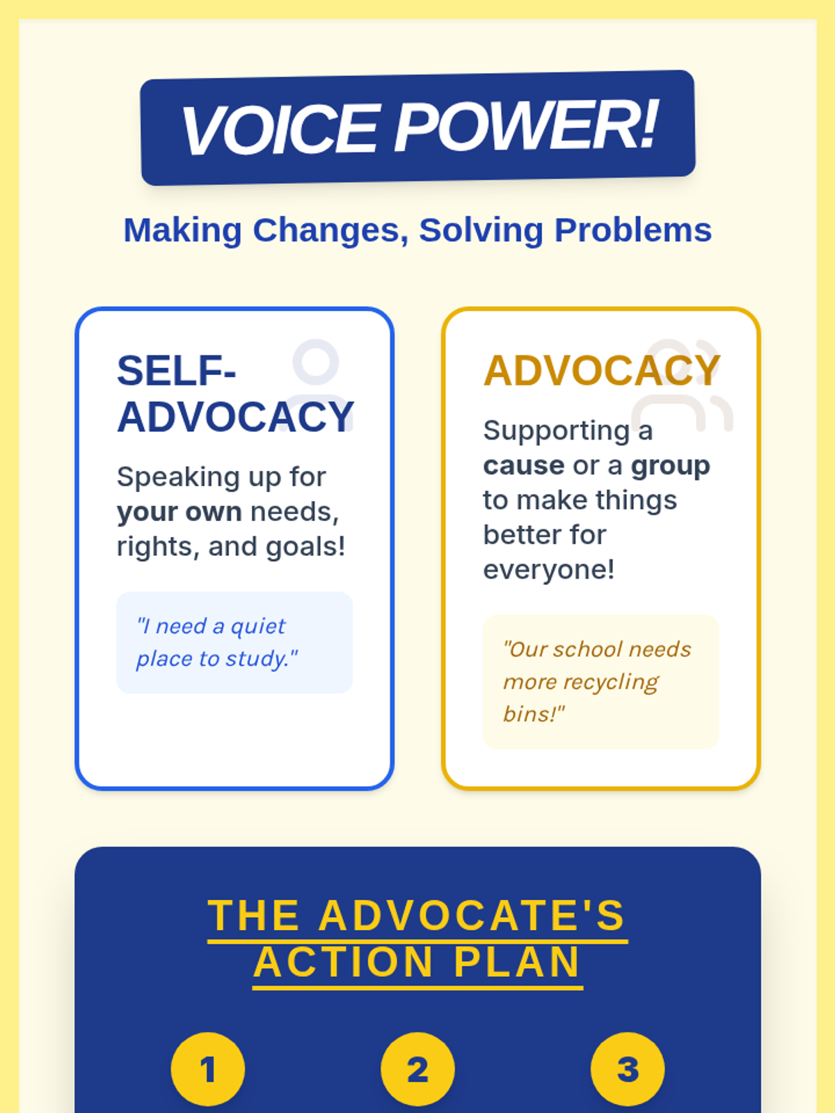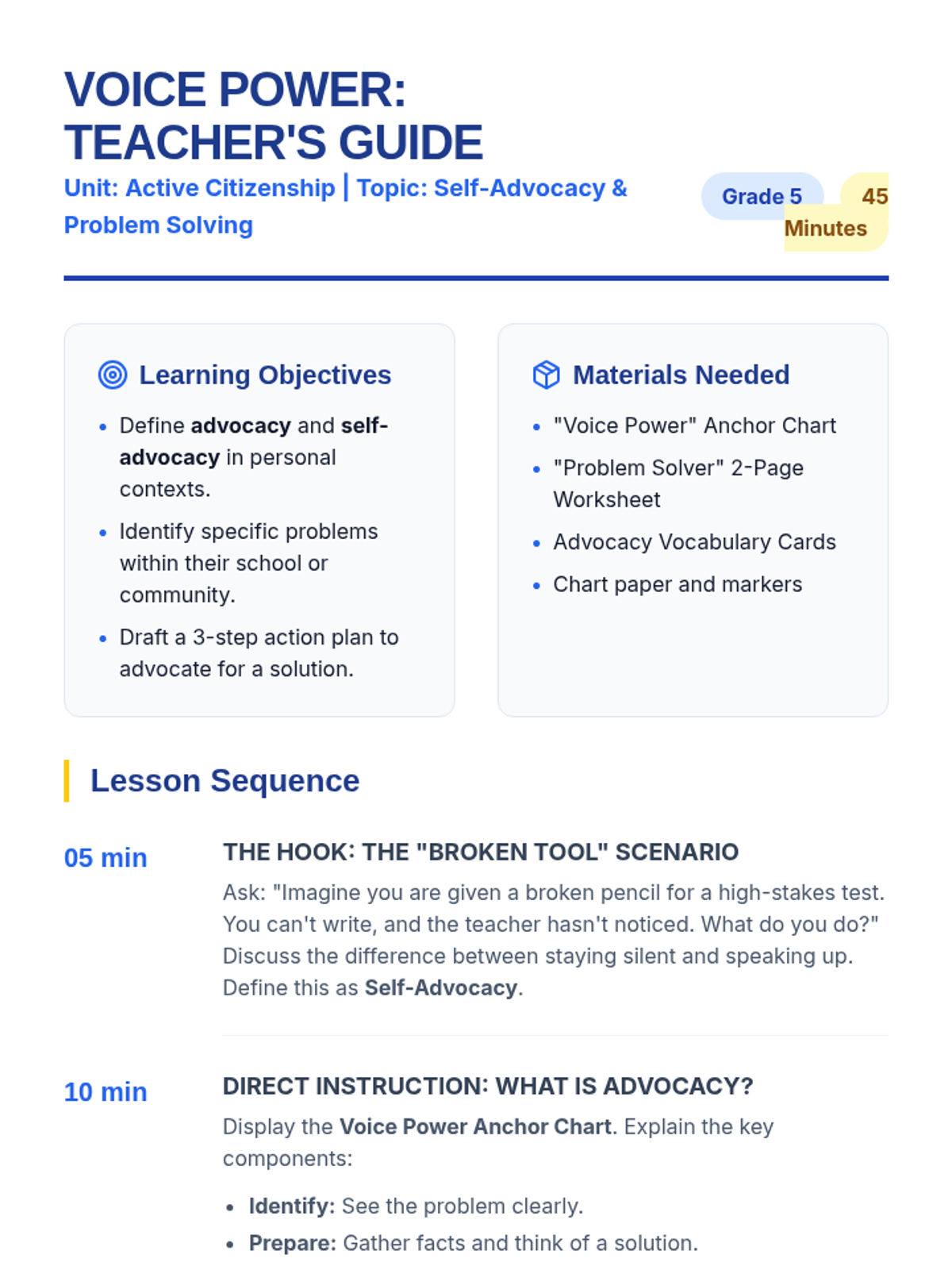 A comprehensive lesson on self-advocacy and problem-solving for 5th graders, teaching them how to use their voices to create positive change in their lives and communities.