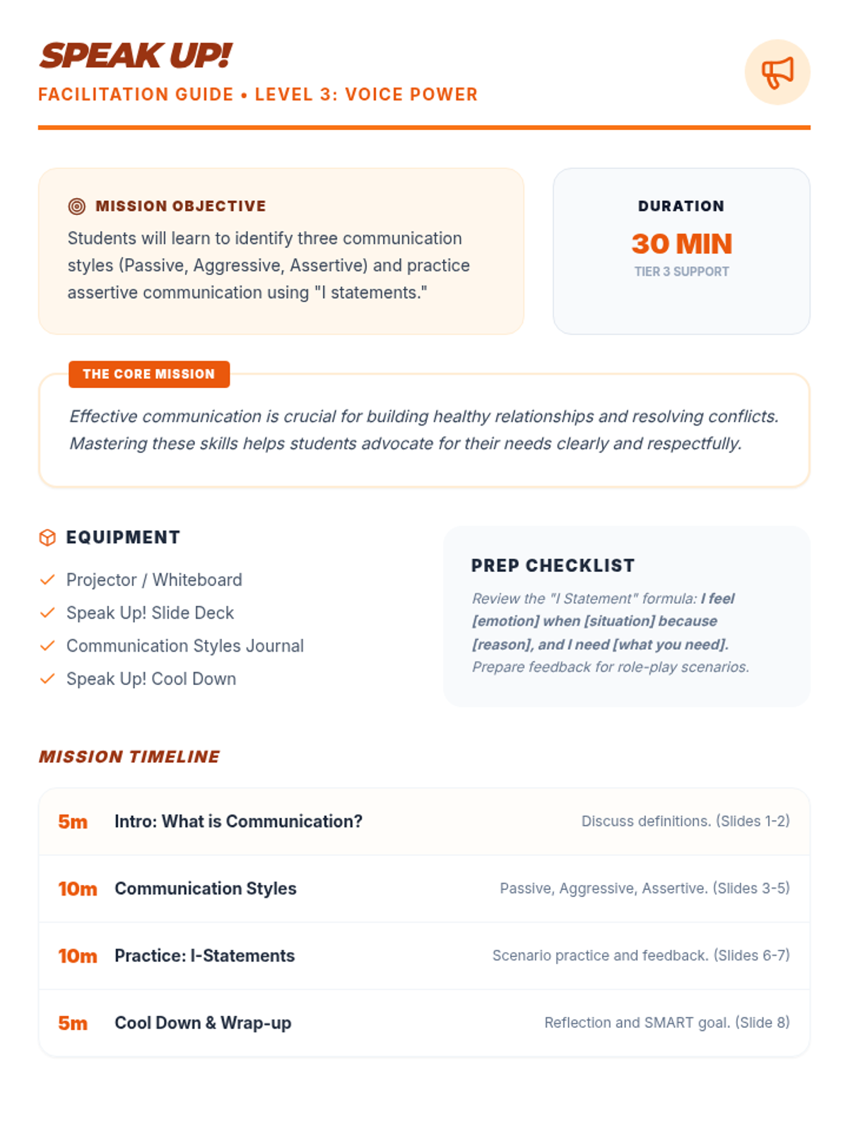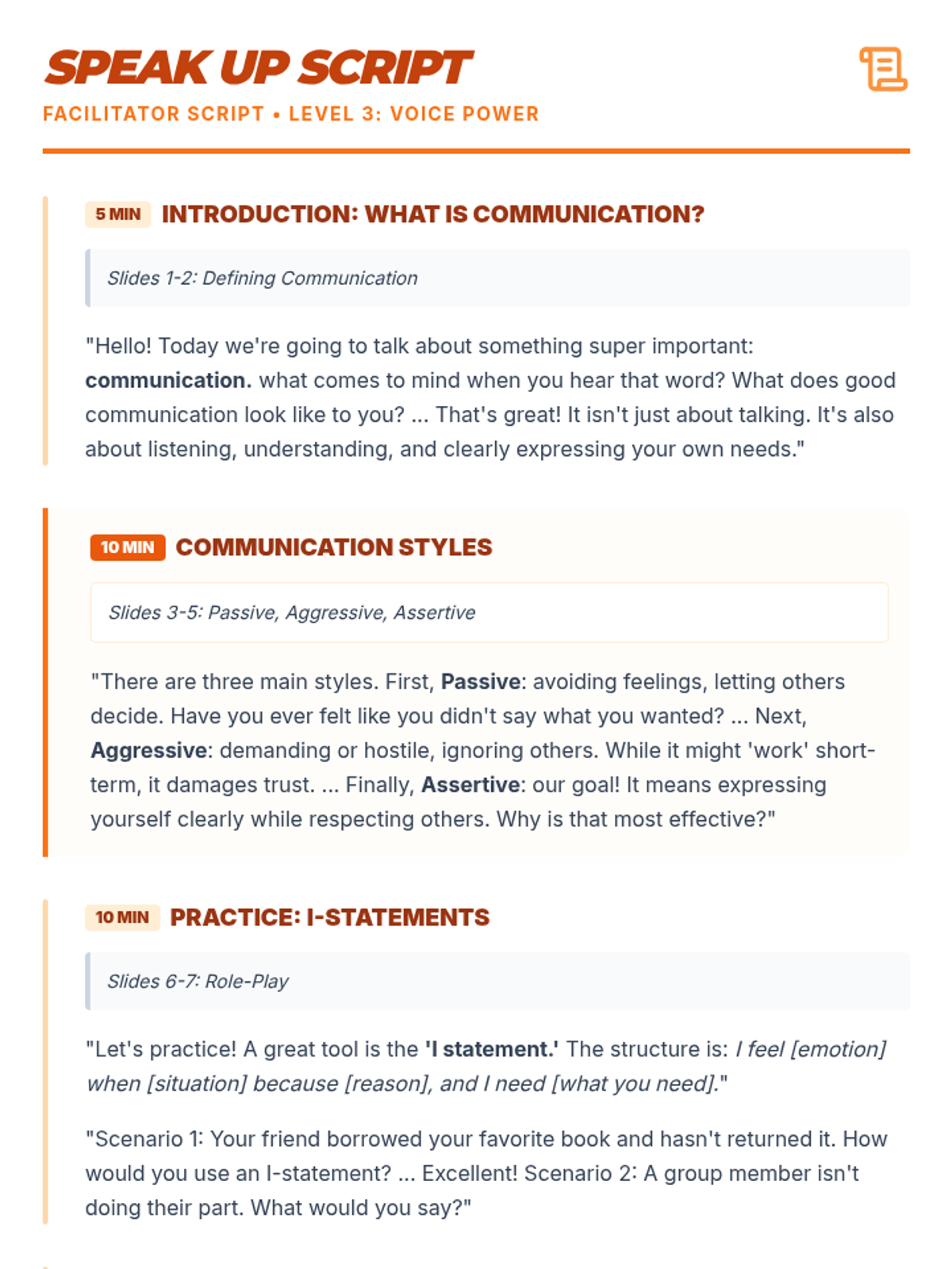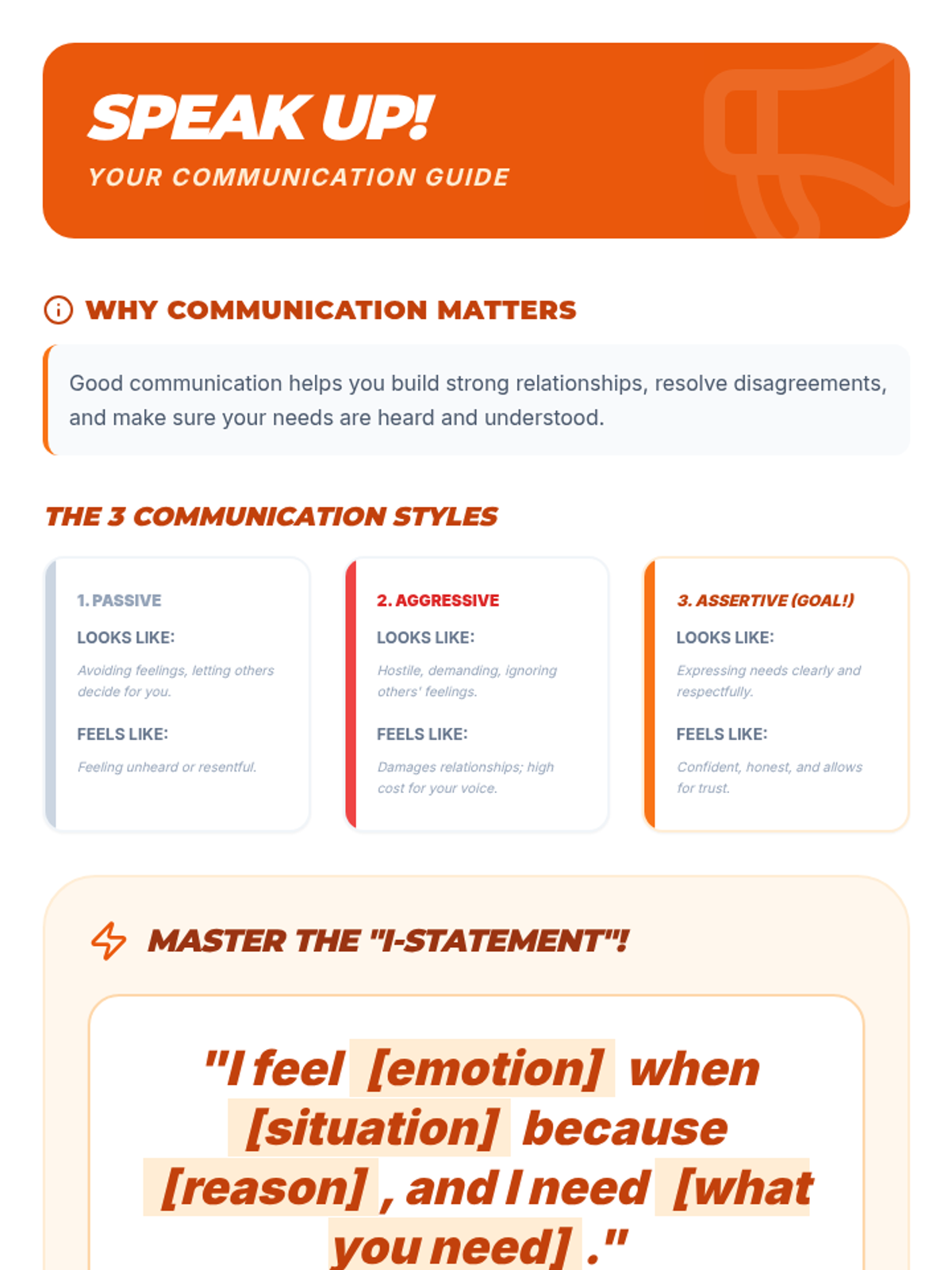 Focuses on the three communication styles and the use of 'I statements' for assertive and respectful self-expression.