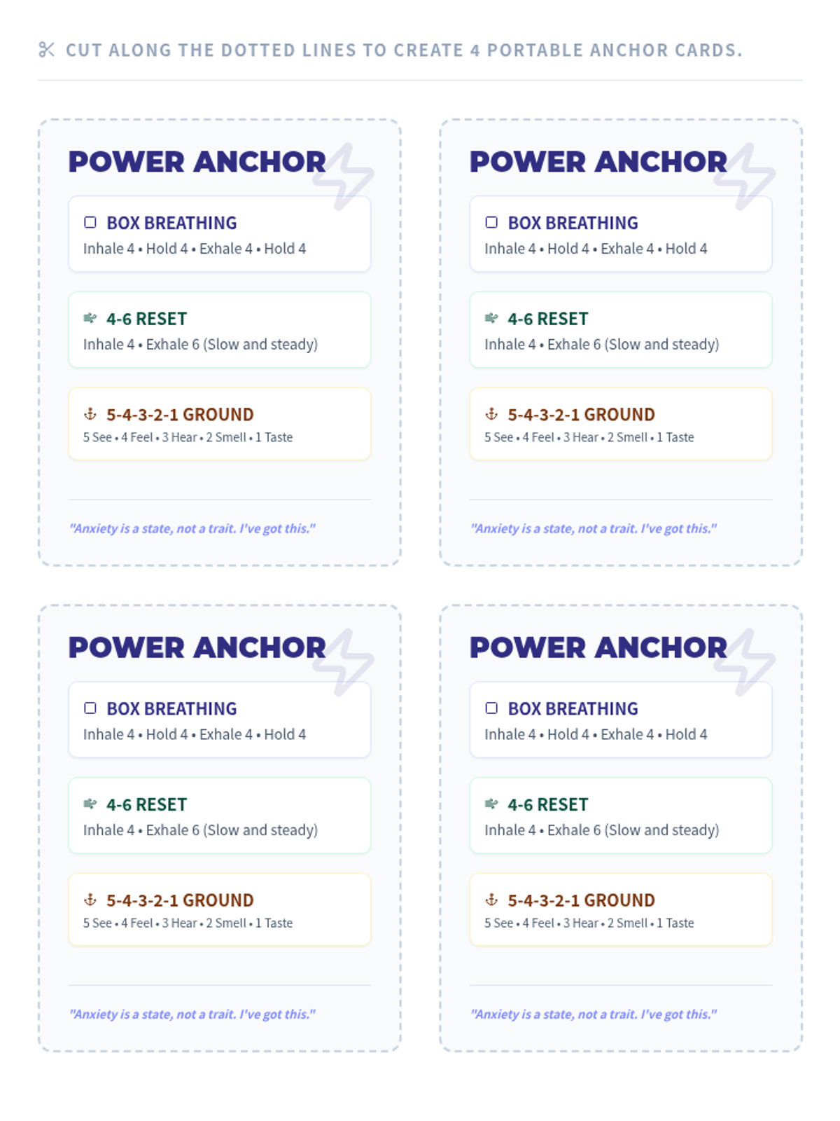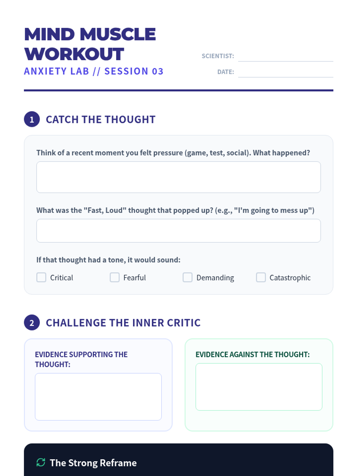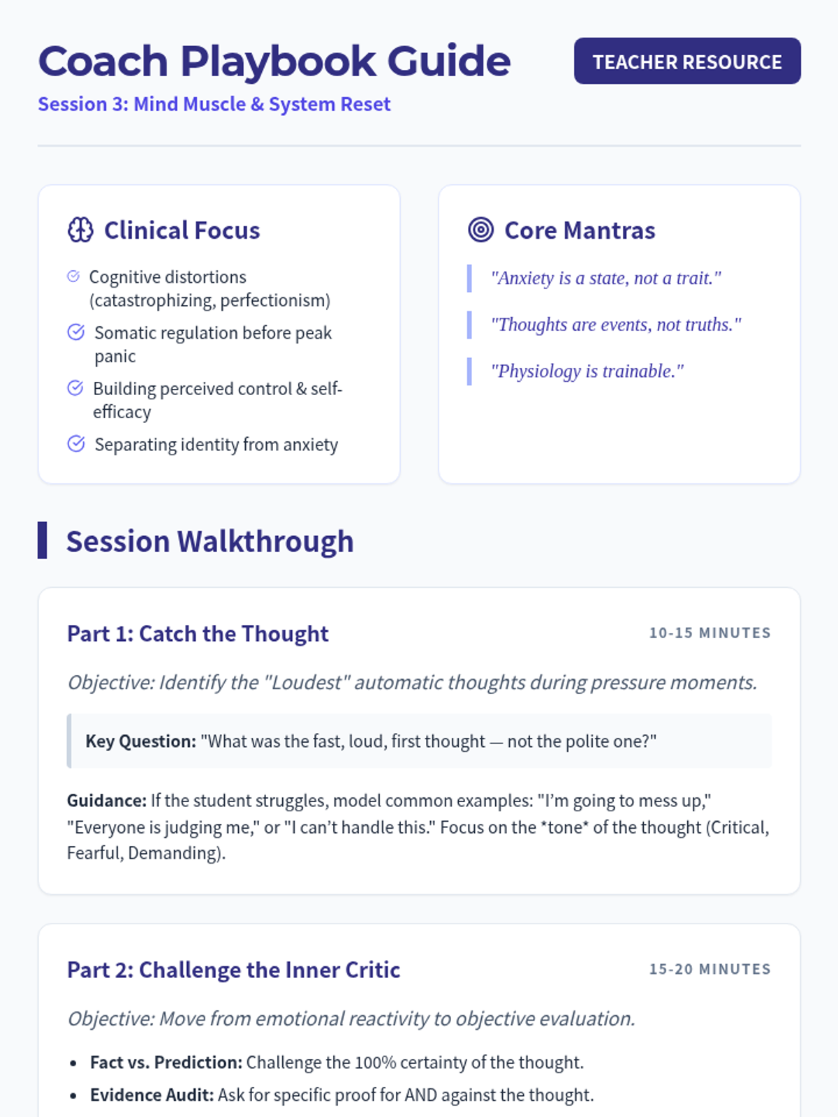 A session focused on identifying automatic thoughts, reframing self-criticism, and implementing physiological regulation skills to build empowerment and control over anxiety.