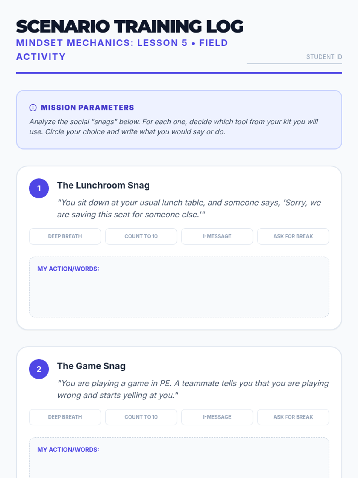 Applying self-talk and coping strategies to real-world social scenarios through role-play and choice-making activities.