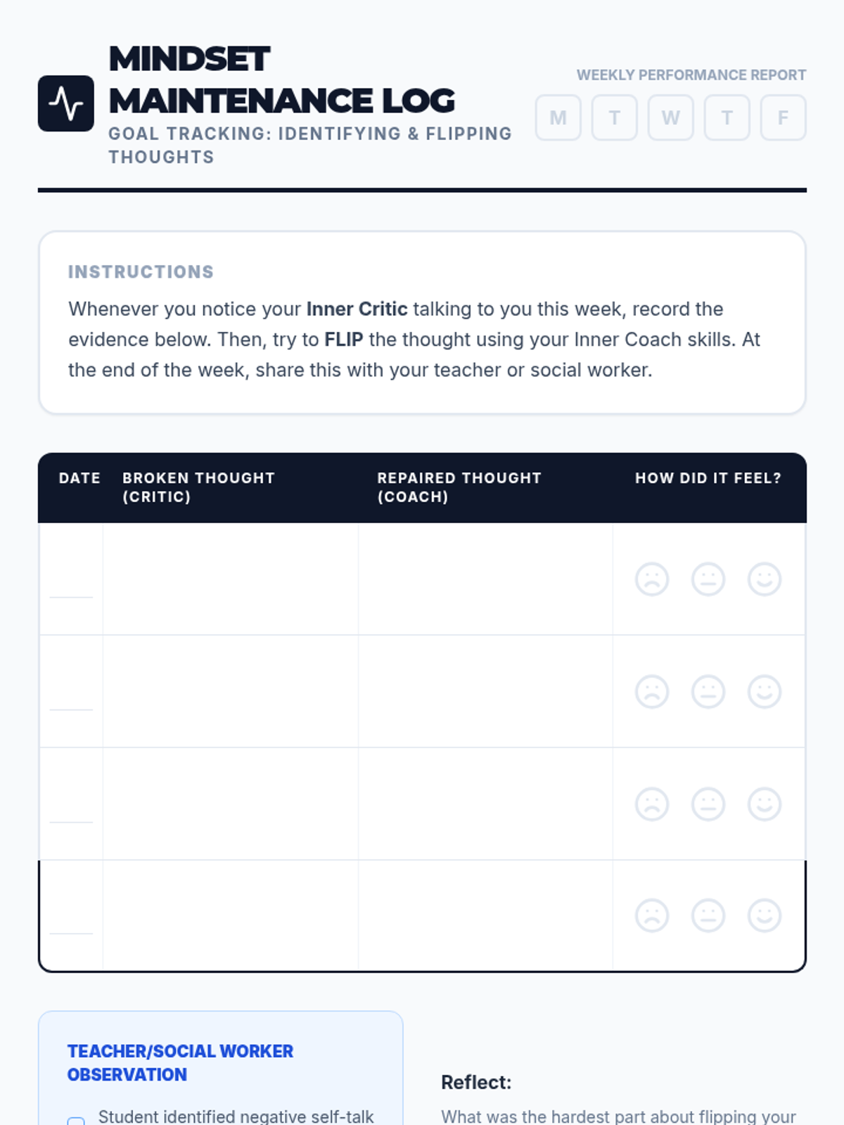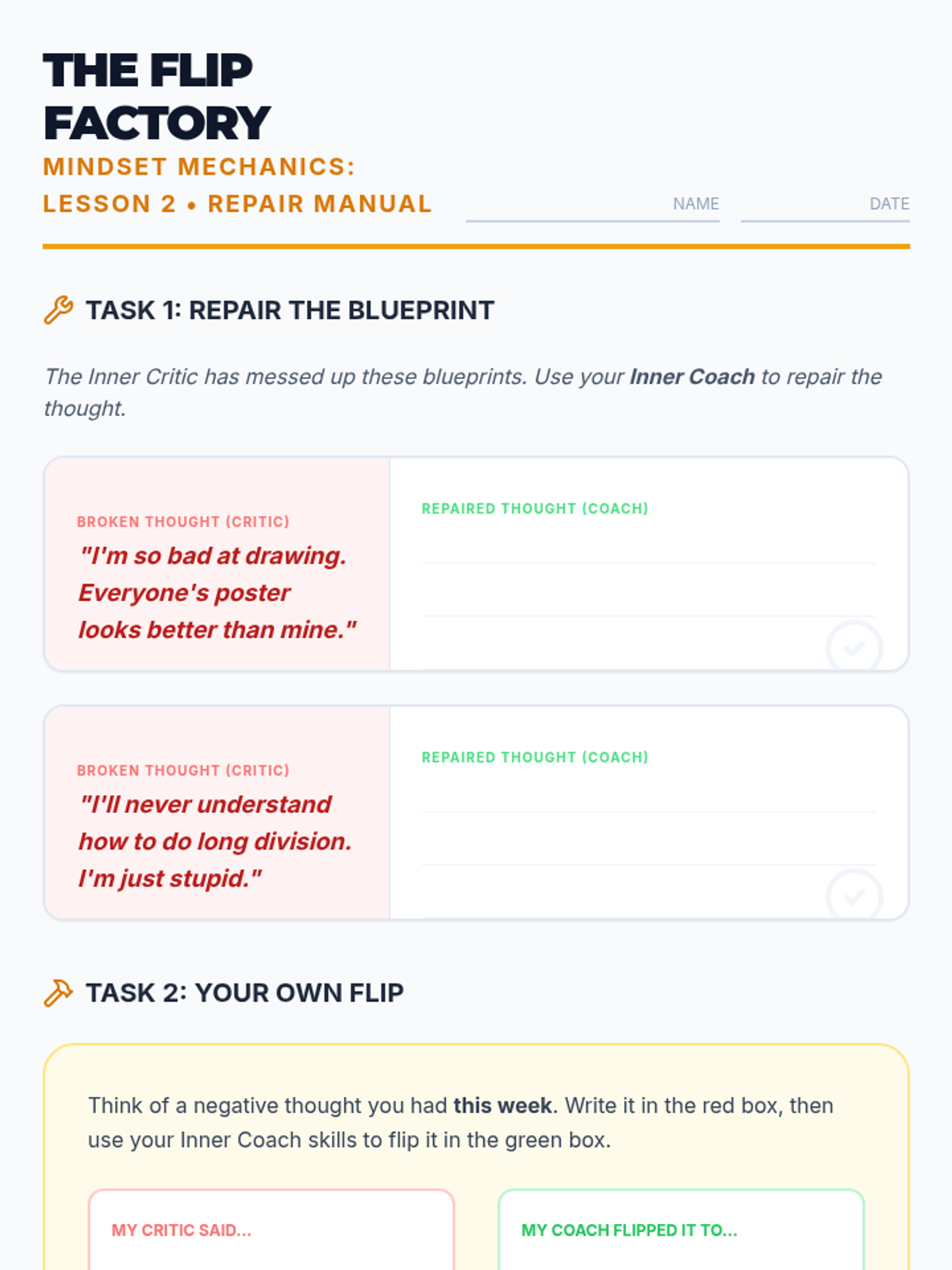 Students practice 'flipping' negative thoughts into positive, realistic statements to improve self-esteem and impulse control.