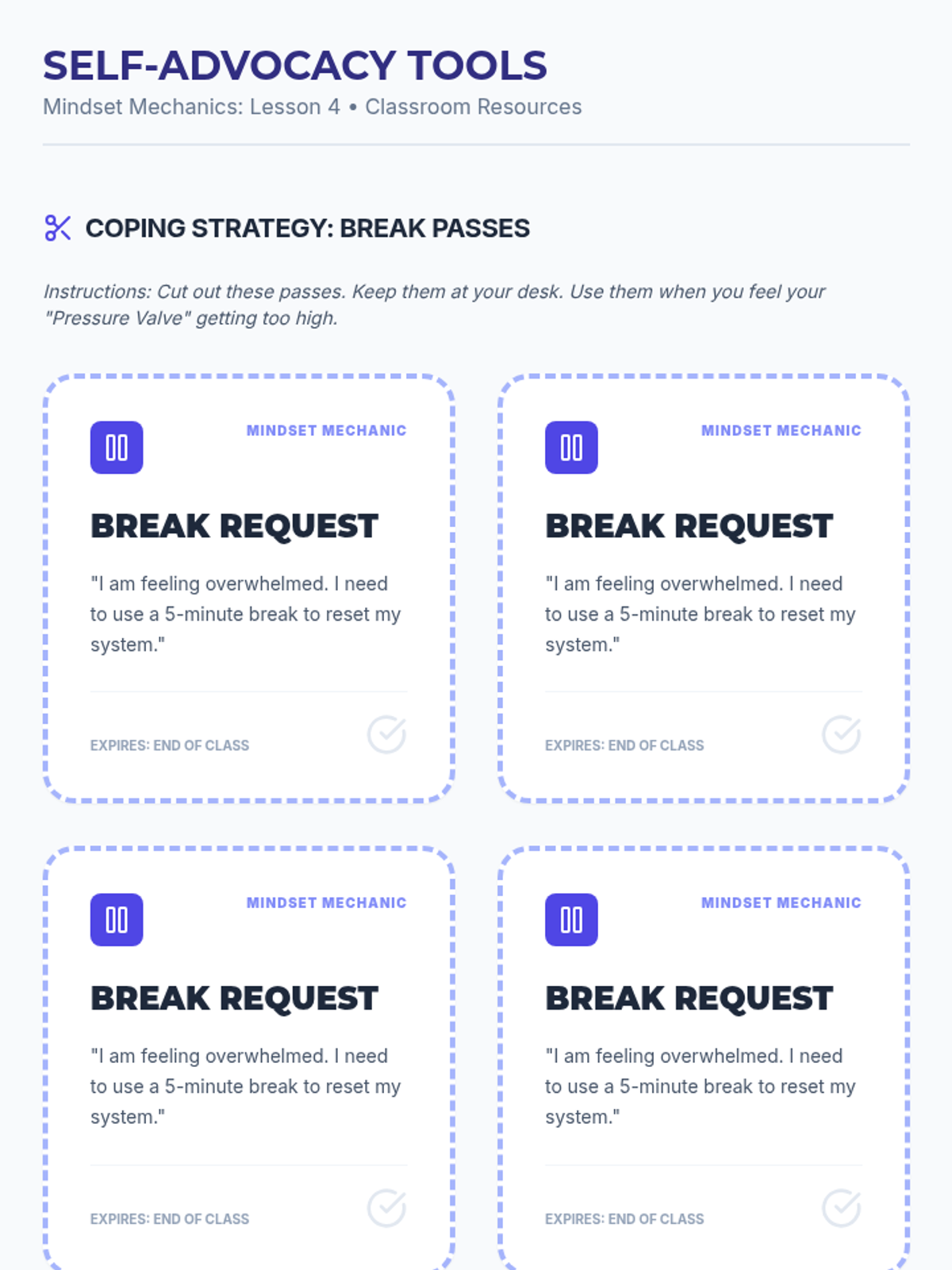Focus on self-advocacy through the use of 'I' messages and learning when and how to appropriately ask for a break.