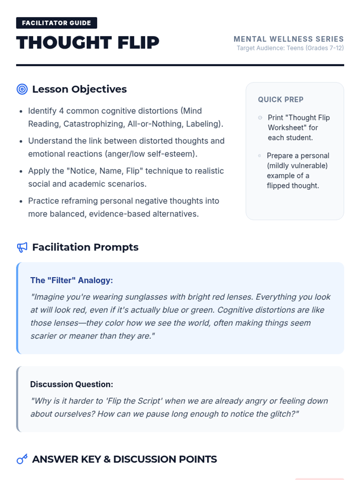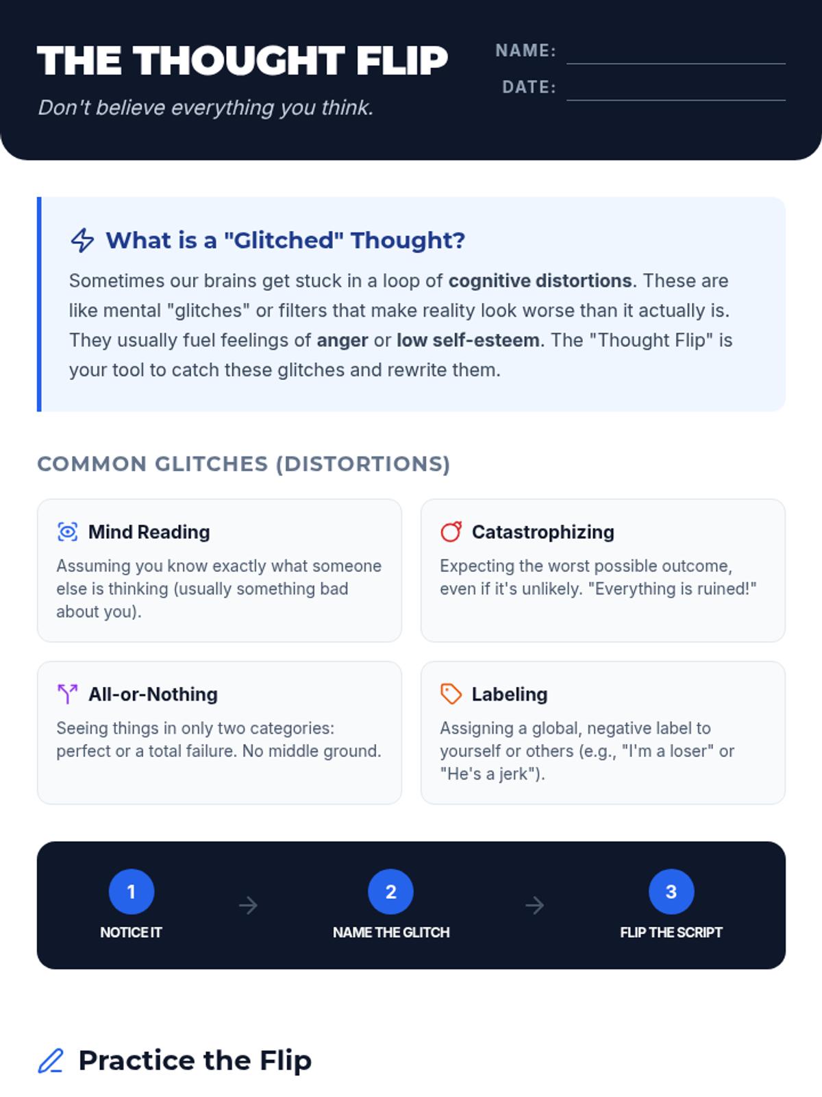A practical, teen-focused lesson on identifying and reframing cognitive distortions to manage anger and improve self-esteem using the 'Thought Flip' technique.