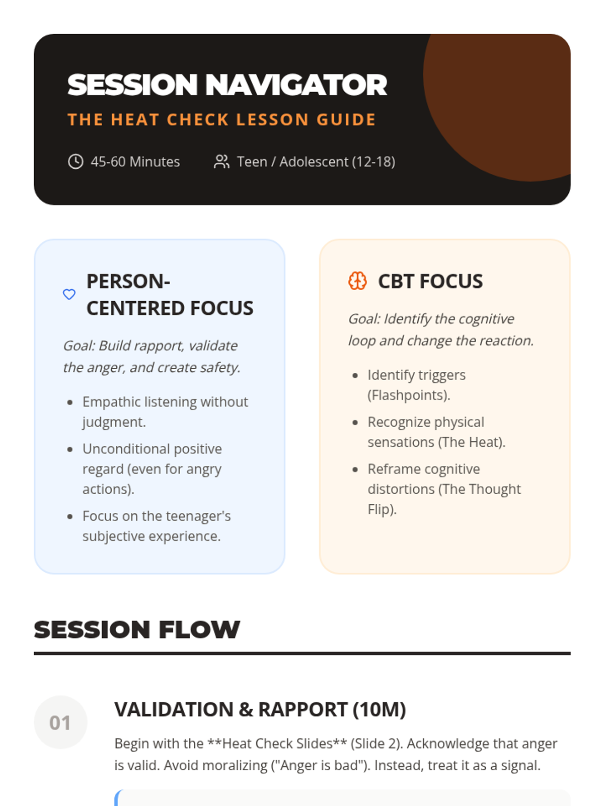 A counseling session focused on helping teenagers understand the mechanics of anger through a CBT lens while maintaining a person-centered, validating environment. This lesson includes psychoeducation, trigger identification, and concrete coping skills.