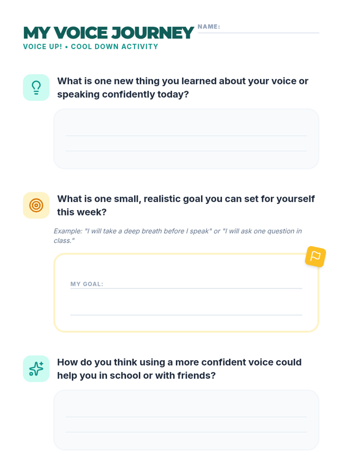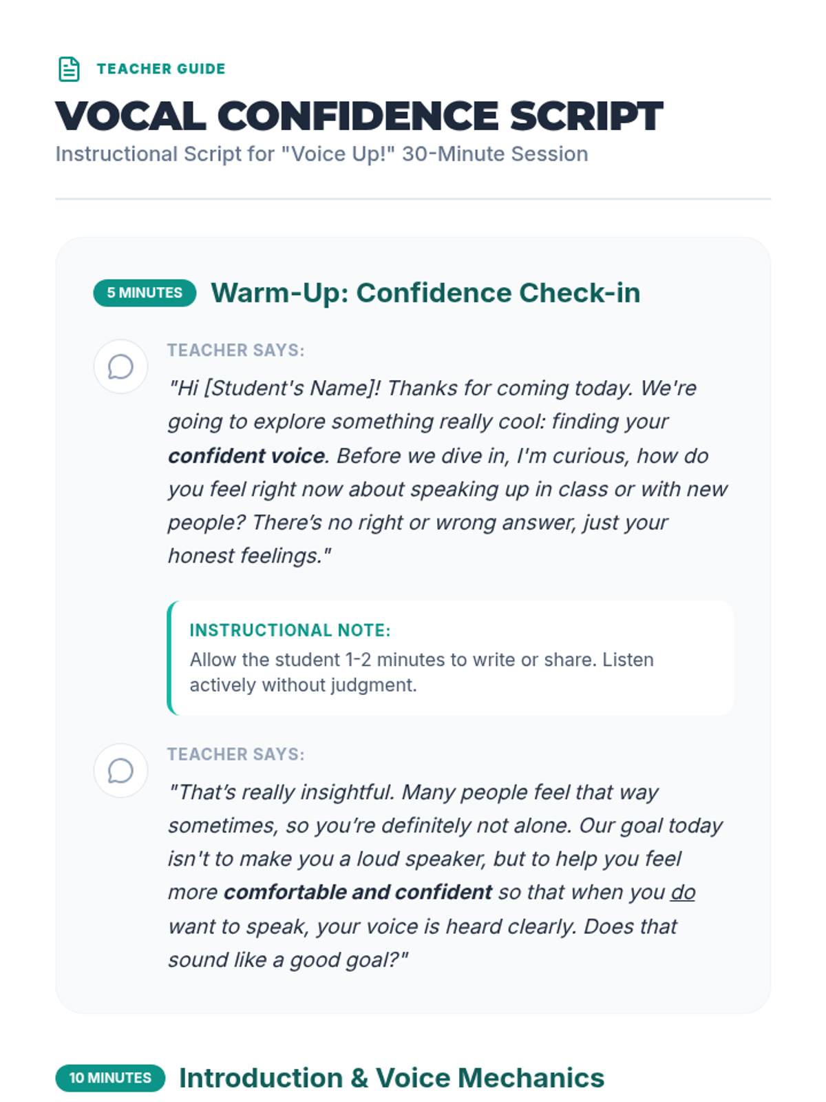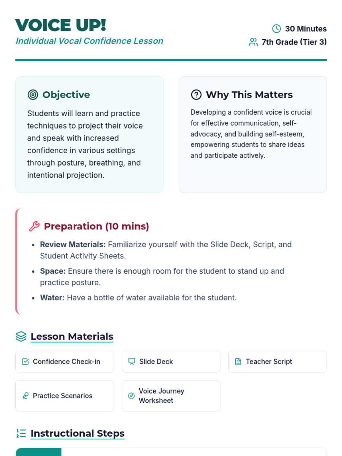 A 30-minute individual Tier 3 lesson designed to help 7th-grade students build vocal confidence through breathing techniques, posture, and guided practice.