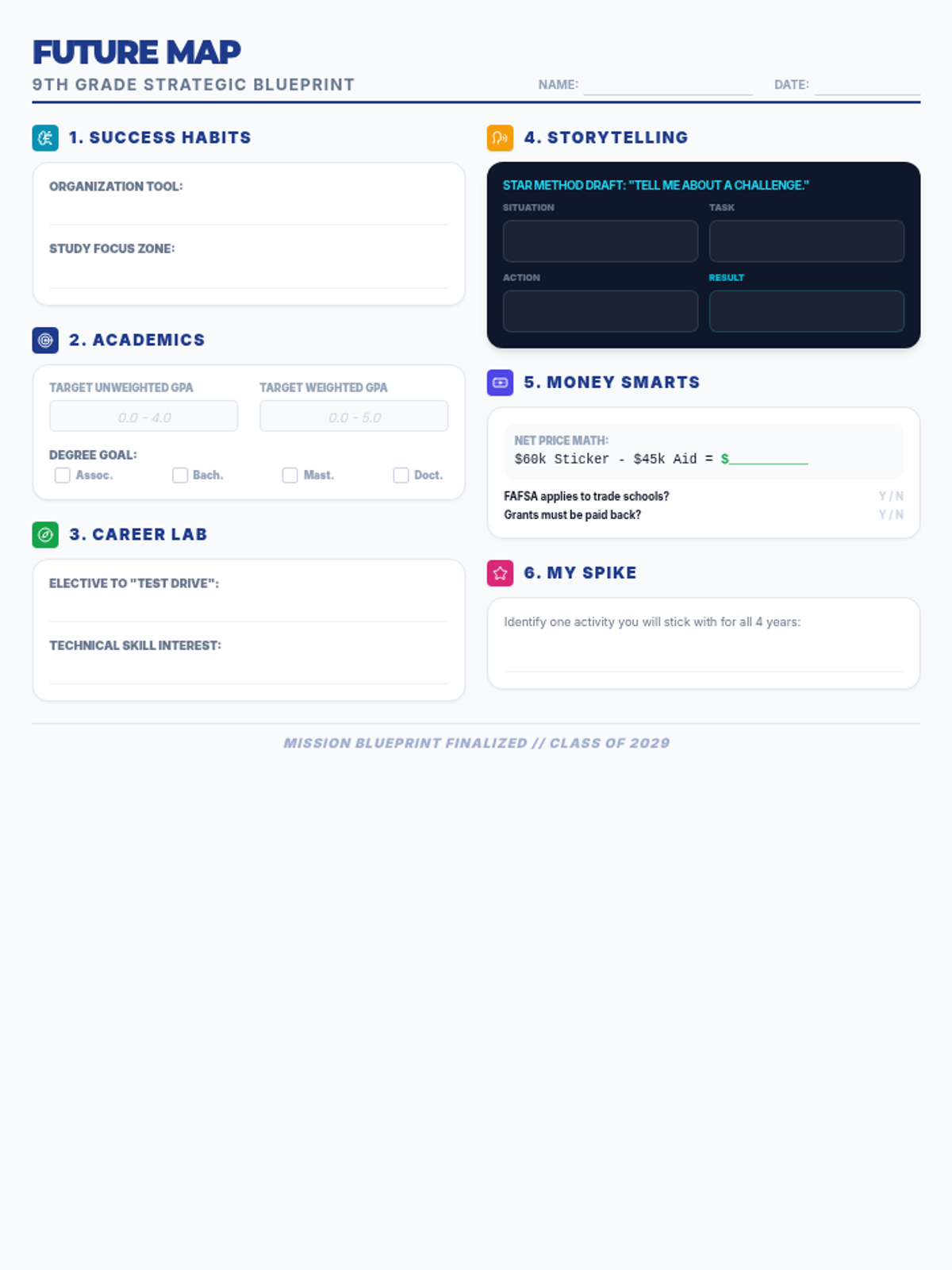 A hands-on planning session where students map out their specific courses from 9th through 12th grade to meet diploma requirements and personal goals.