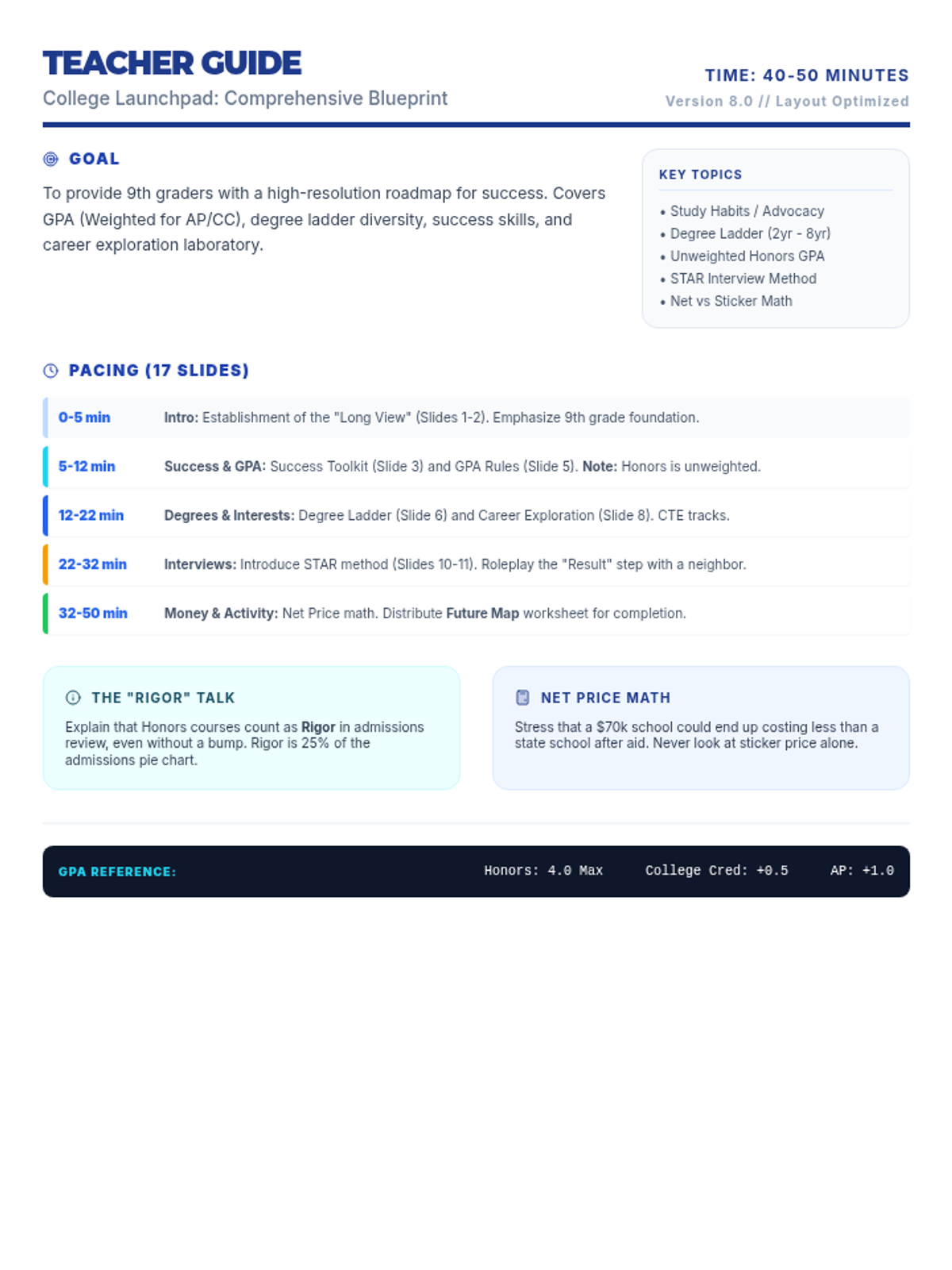 An introductory lesson for 9th graders to understand high school academics, college entrance requirements, and the basics of financial aid including GPA, FAFSA, and scholarships.