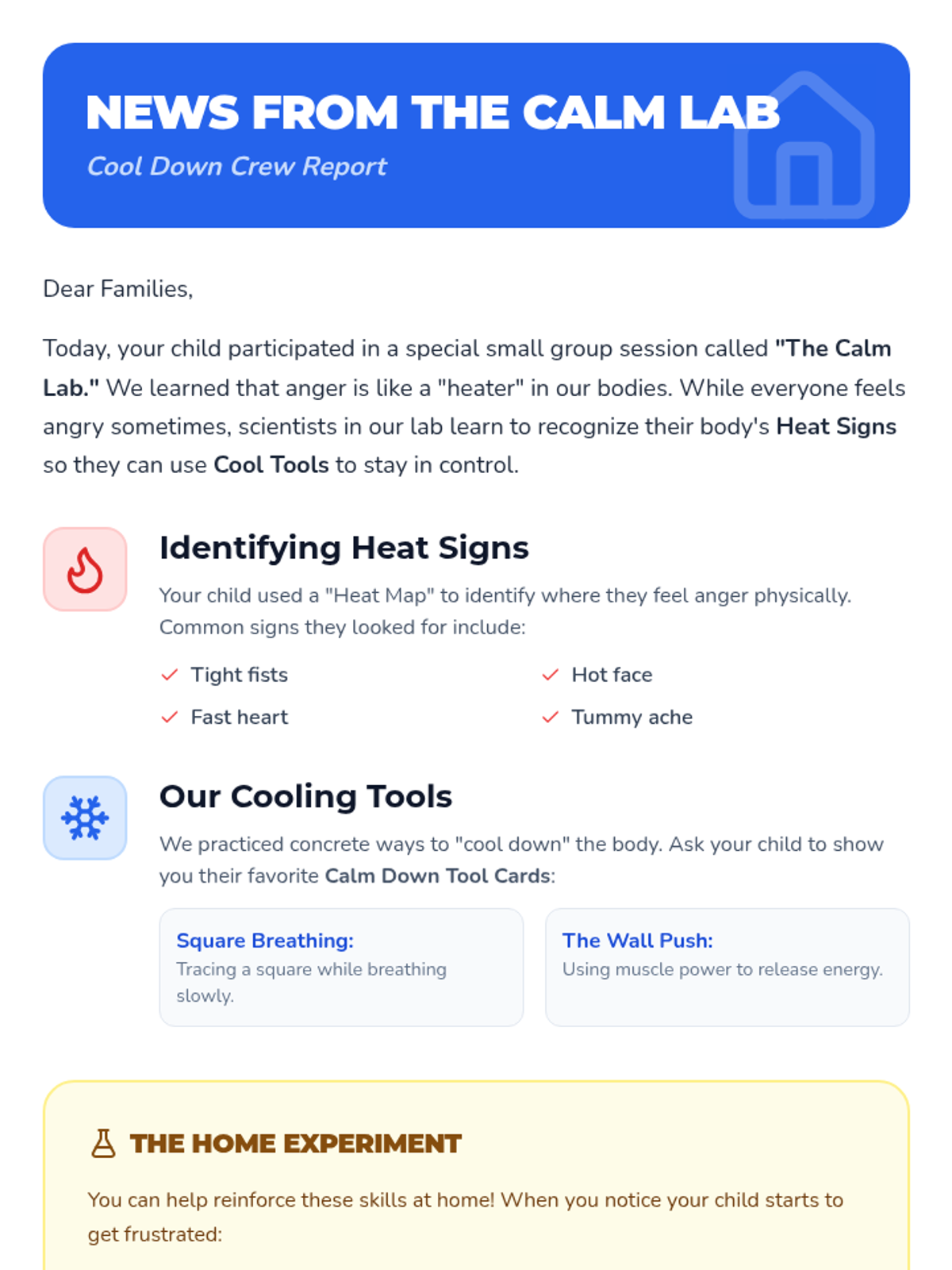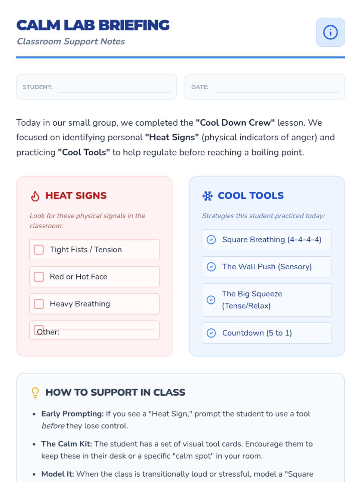 A 30-minute small group session focused on recognizing physical signs of anger and practicing concrete cooling strategies using visual and hands-on tools.