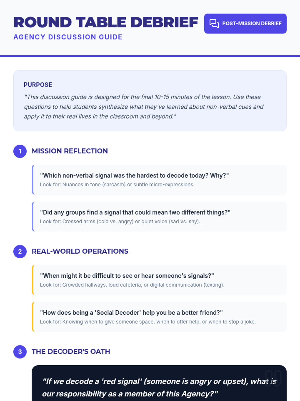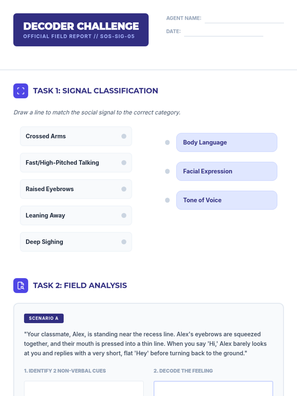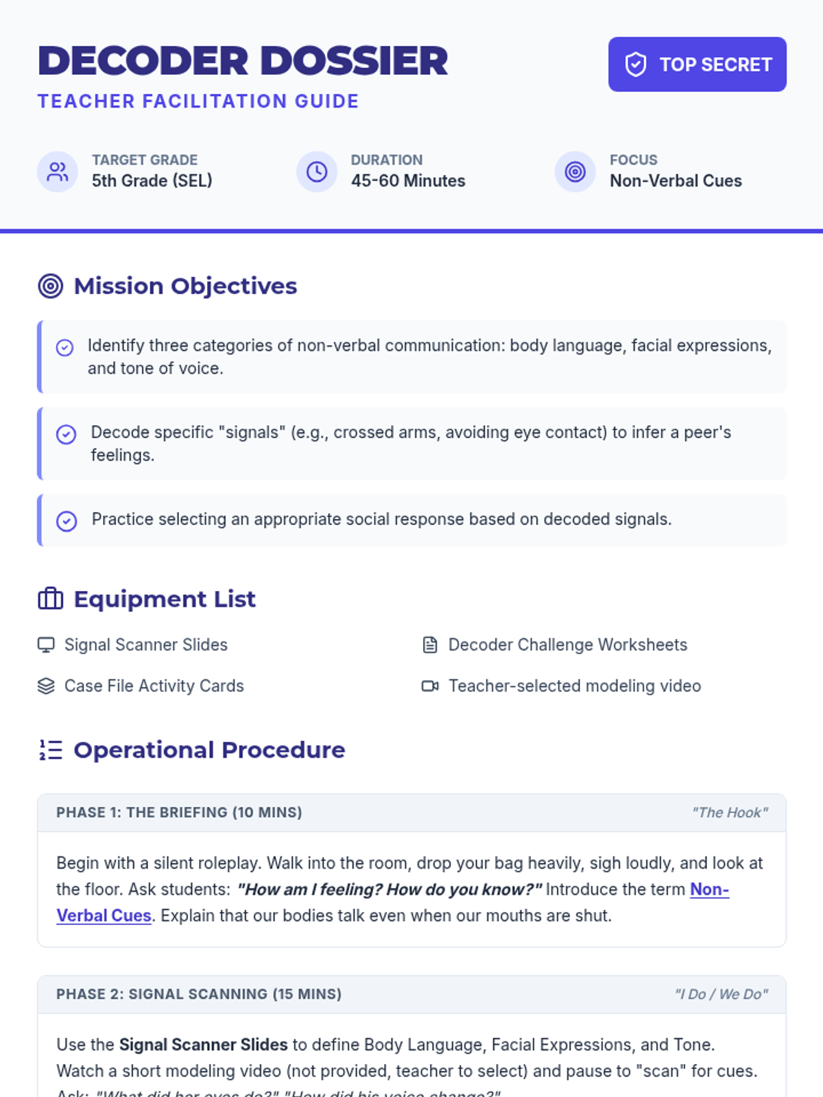 A comprehensive social-emotional learning lesson designed for 5th-grade students to master the art of interpreting non-verbal cues. Students act as 'Social Decoders' to analyze body language, facial expressions, and tone of voice through explicit instruction and guided practice.
