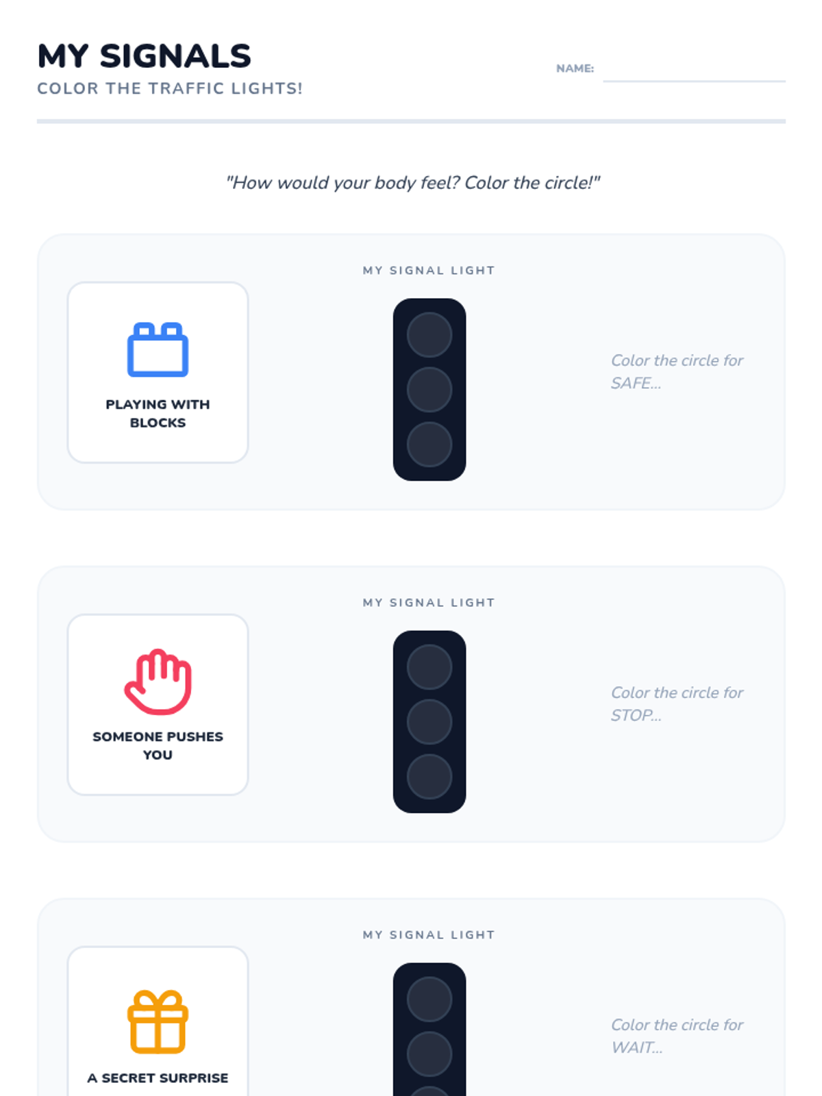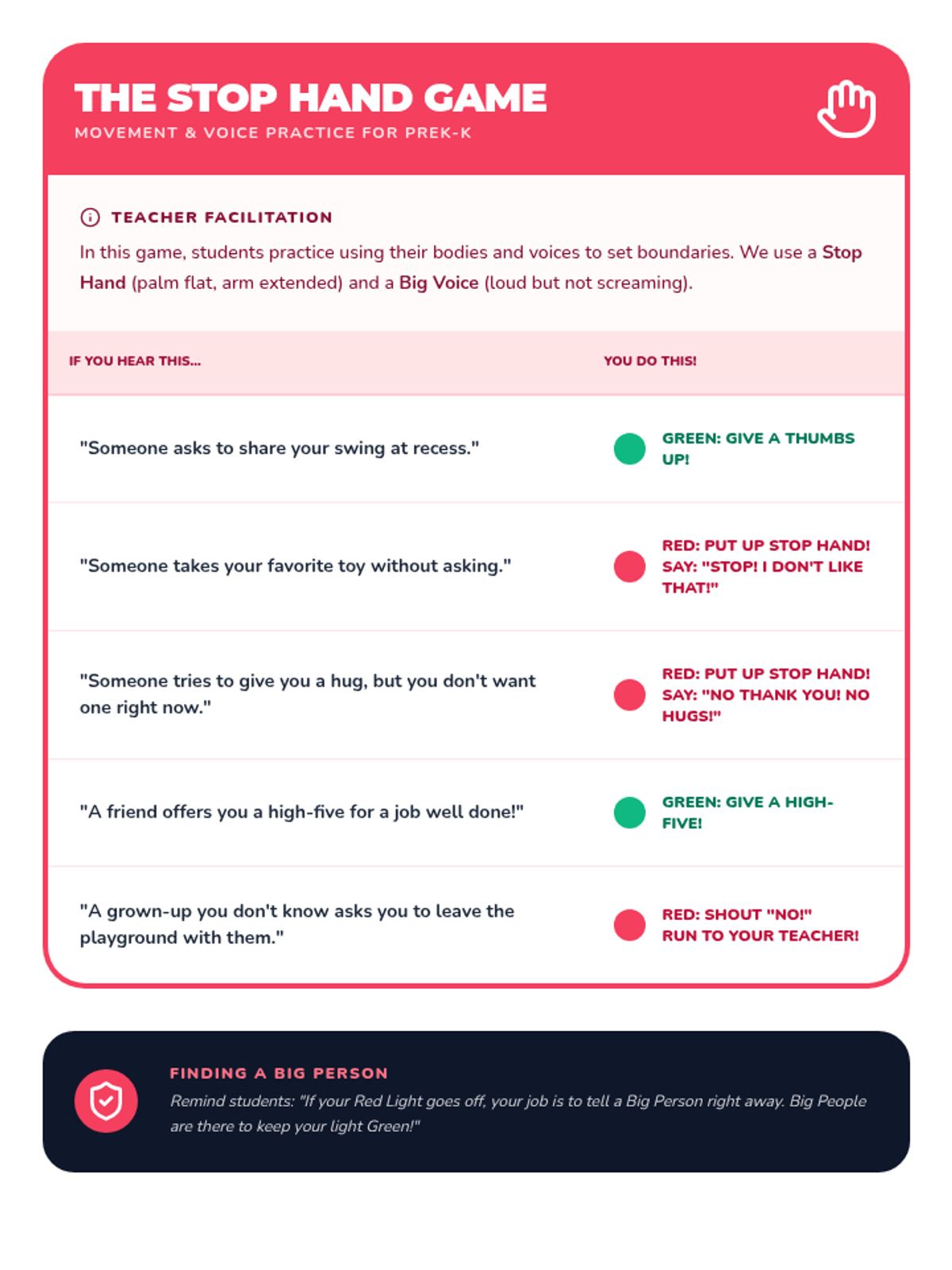 A foundational social-emotional learning lesson for PreK and Kindergarten students using a stoplight theme to teach body autonomy, safe touch, and asking for help from trusted adults.