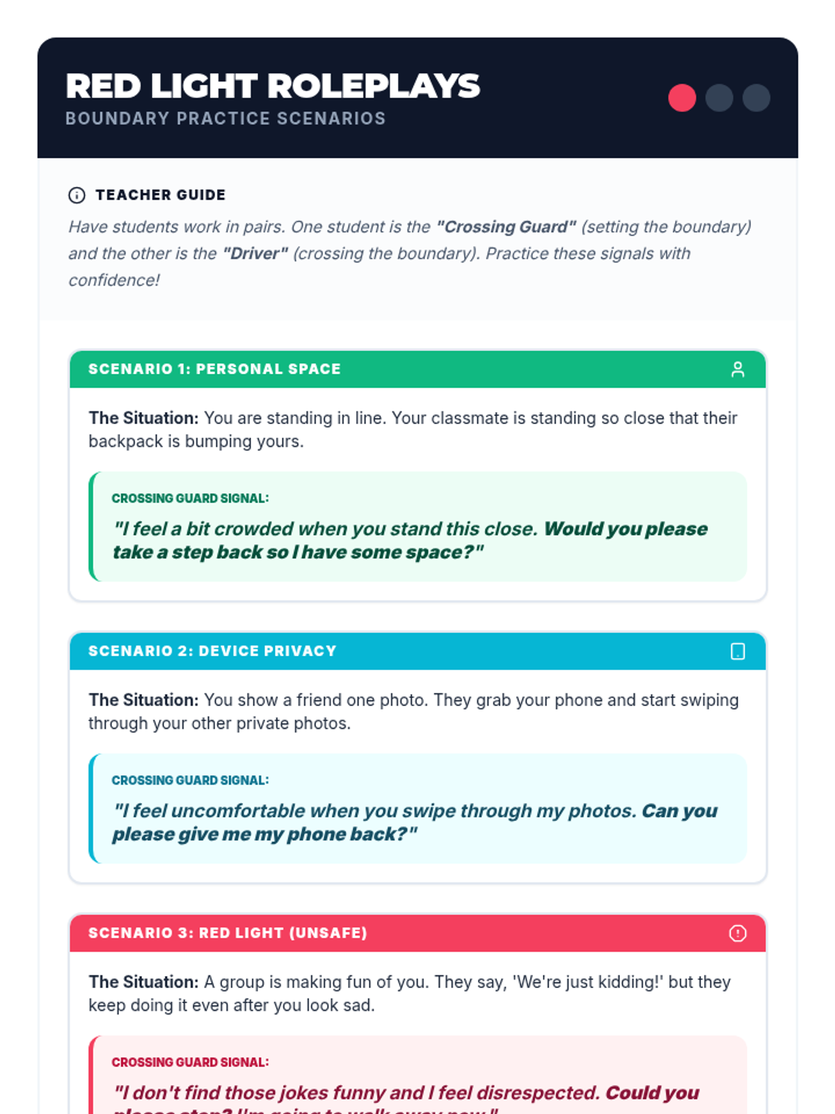 A safety-focused social-emotional learning lesson for 4th and 5th graders using a stoplight theme to identify safe, cautious, and unsafe boundaries in personal and digital spaces.