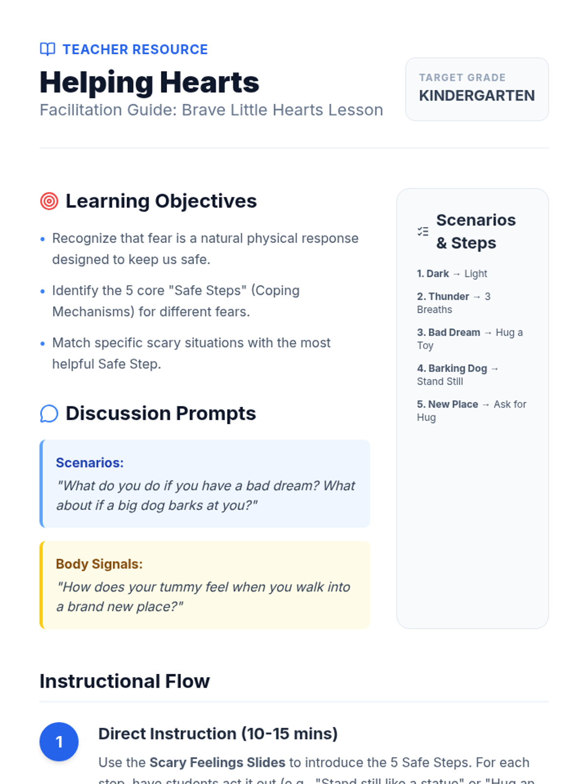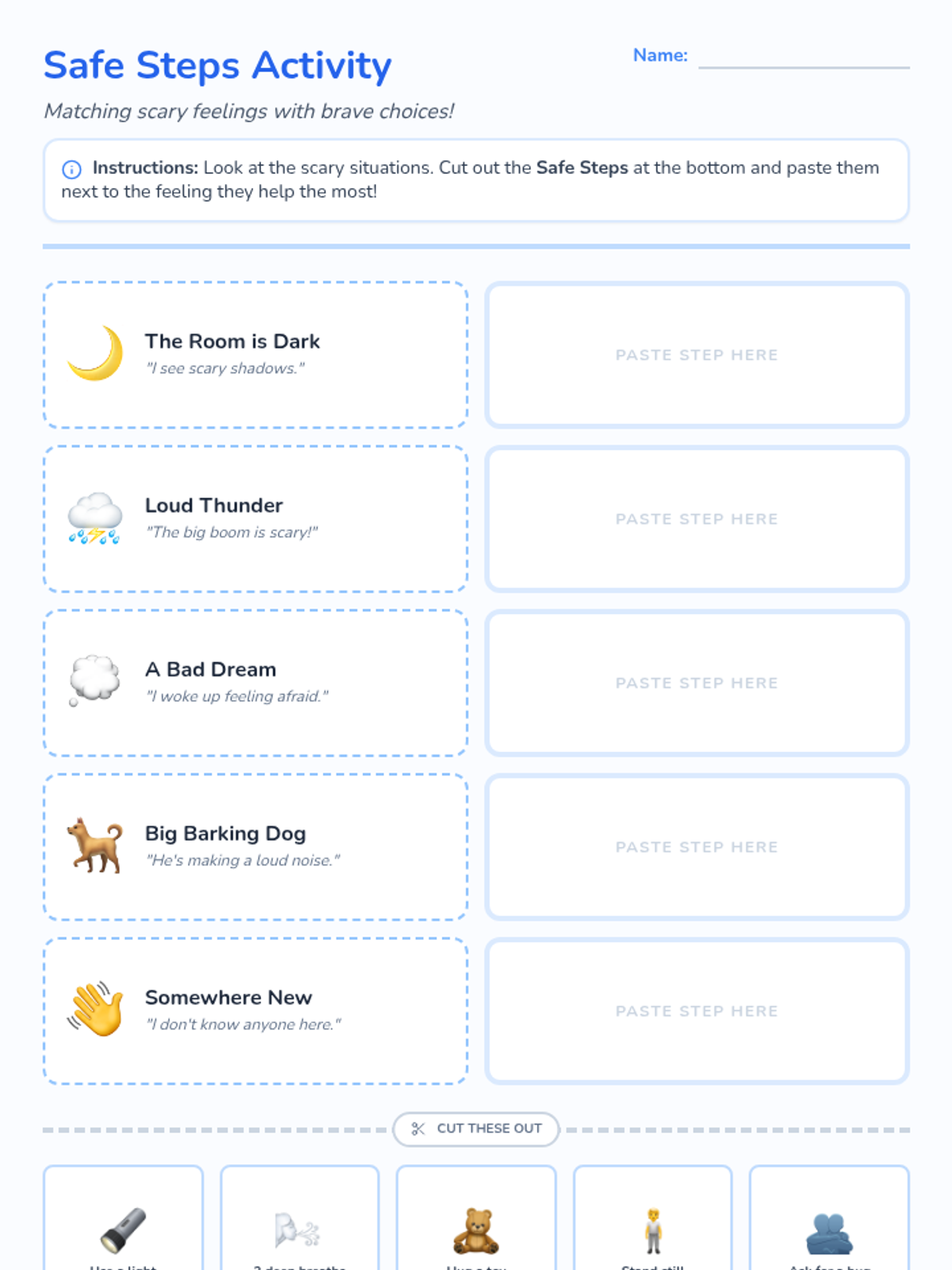 This lesson helps Kindergarten students understand that feeling scared is a natural response and introduces practical, healthy coping mechanisms to manage those feelings safely. Students will identify scary situations and match them with supportive 'Safe Steps' through discussion and a hands-on activity.