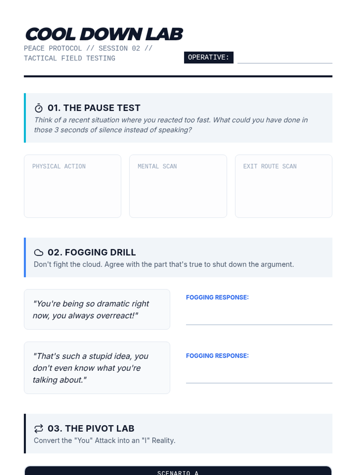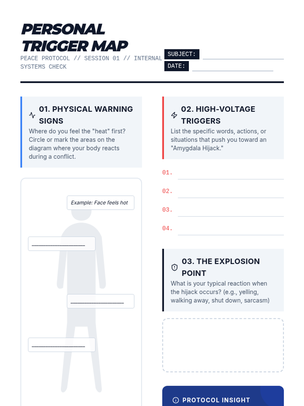 Identifies the biological "fight-flight-freeze" response and maps personal triggers to improve self-awareness during tension.