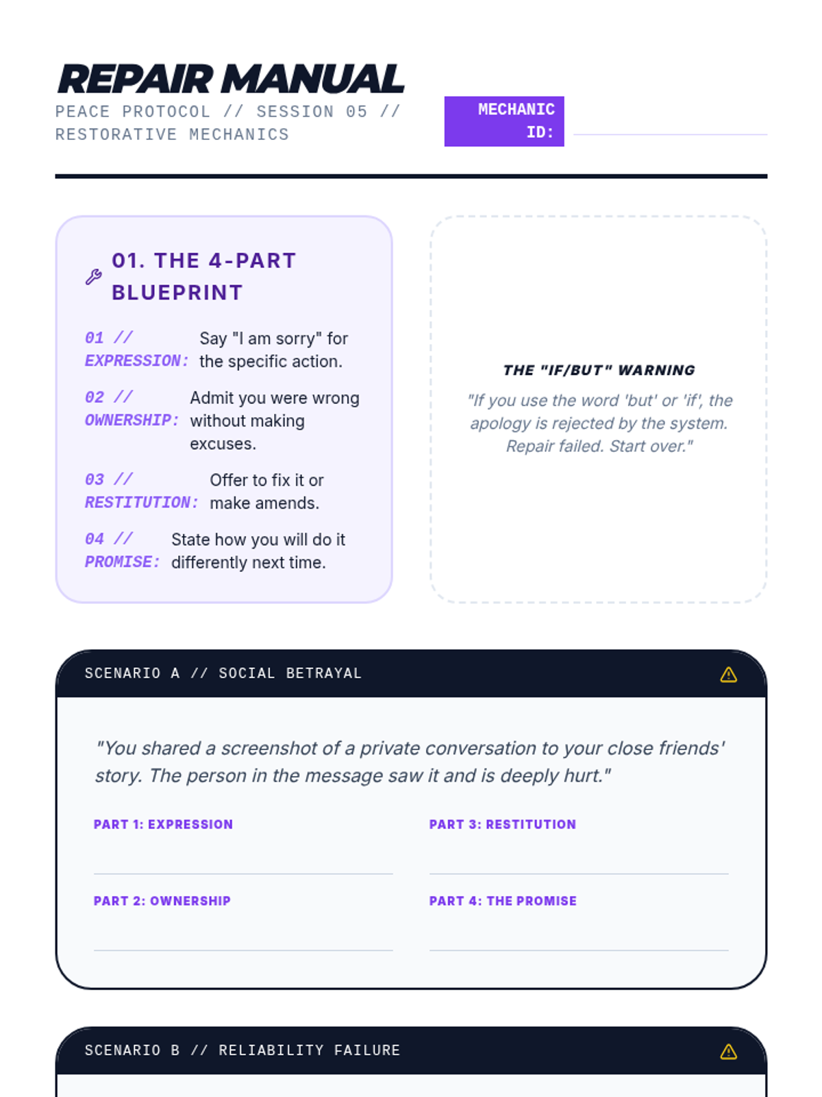 Teaches the 4-part effective apology and how to take accountability to repair damaged relationships.