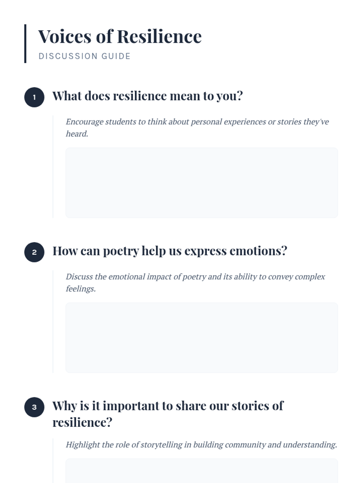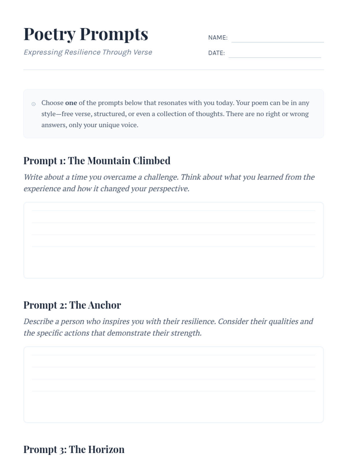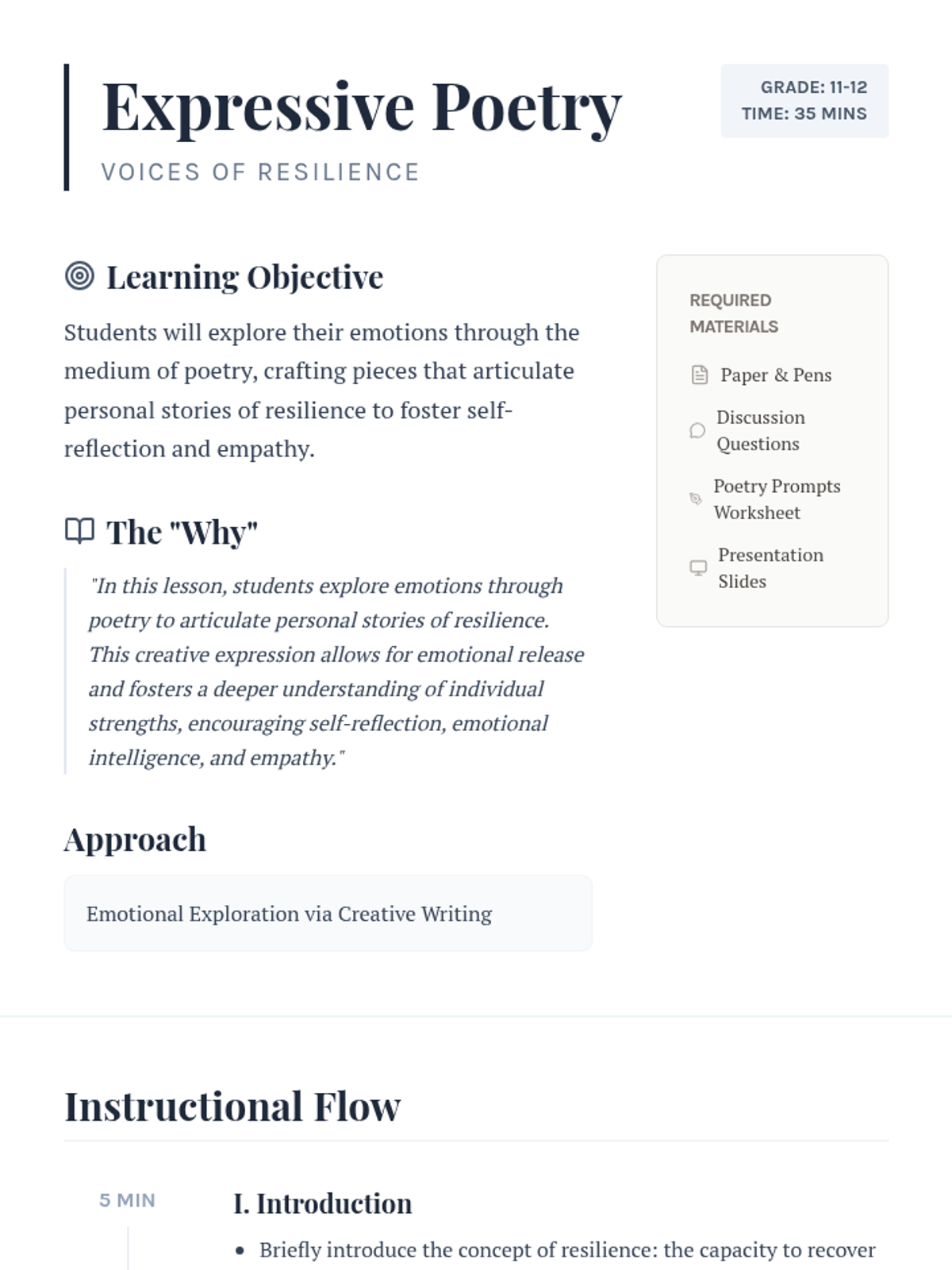 Students explore emotions and resilience through poetry, crafting personal stories that foster self-reflection, emotional intelligence, and empathy. This creative expression session helps students celebrate their inner strengths and connect with their peers.