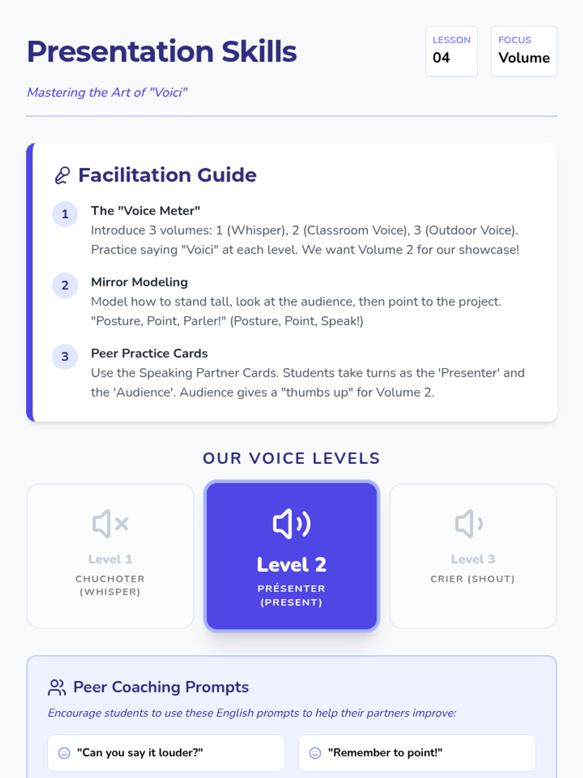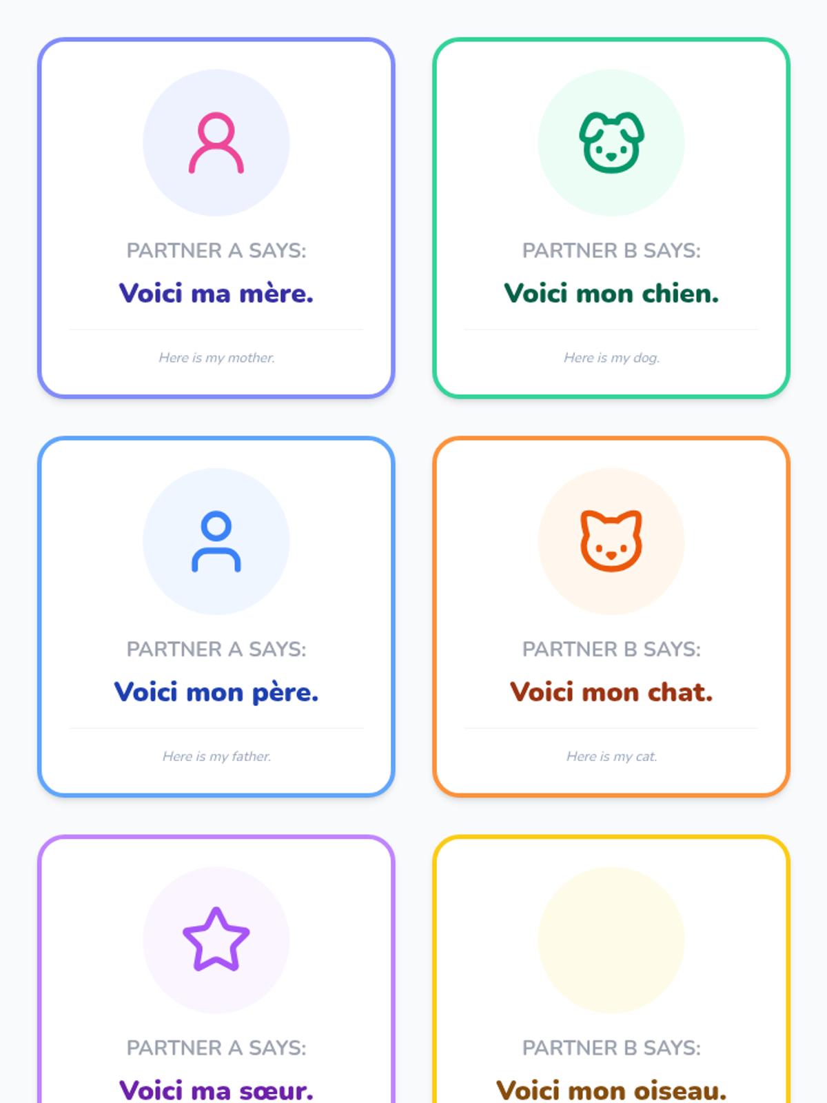 Students learn and practice the phrase 'Voici' (Here is) to introduce their family and pets, focusing on speaking volume and clarity through pair practice.