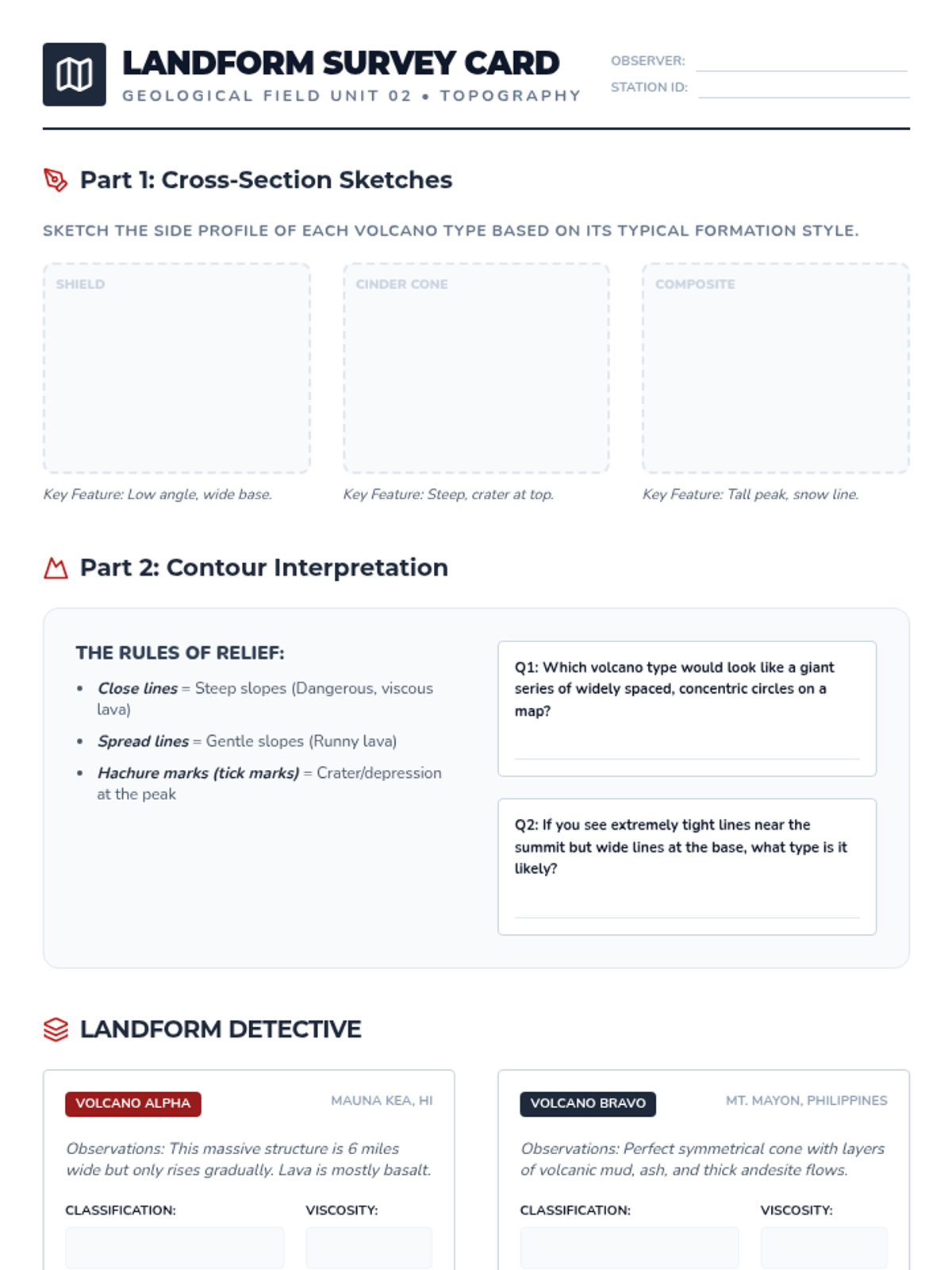 Learners categorize shield volcanoes, cinder cones, and composite stratovolcanoes by analyzing profiles, rock types, and topographic maps to correlate shape with formation history.