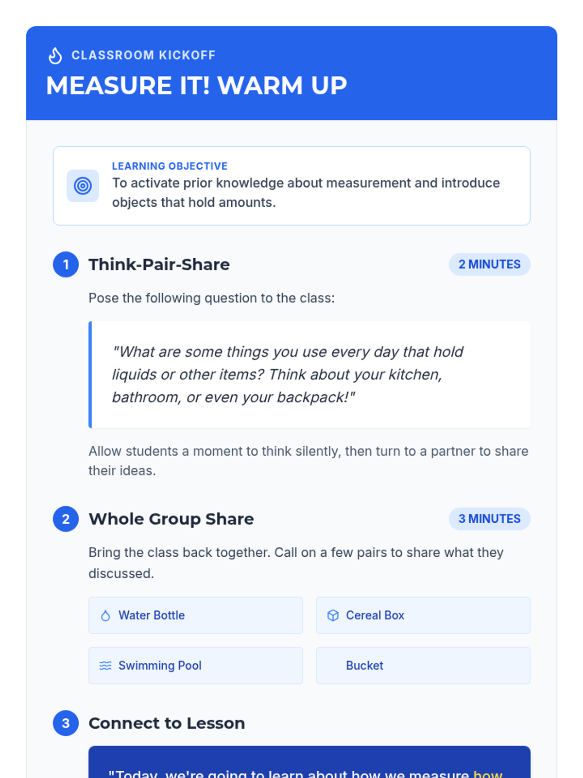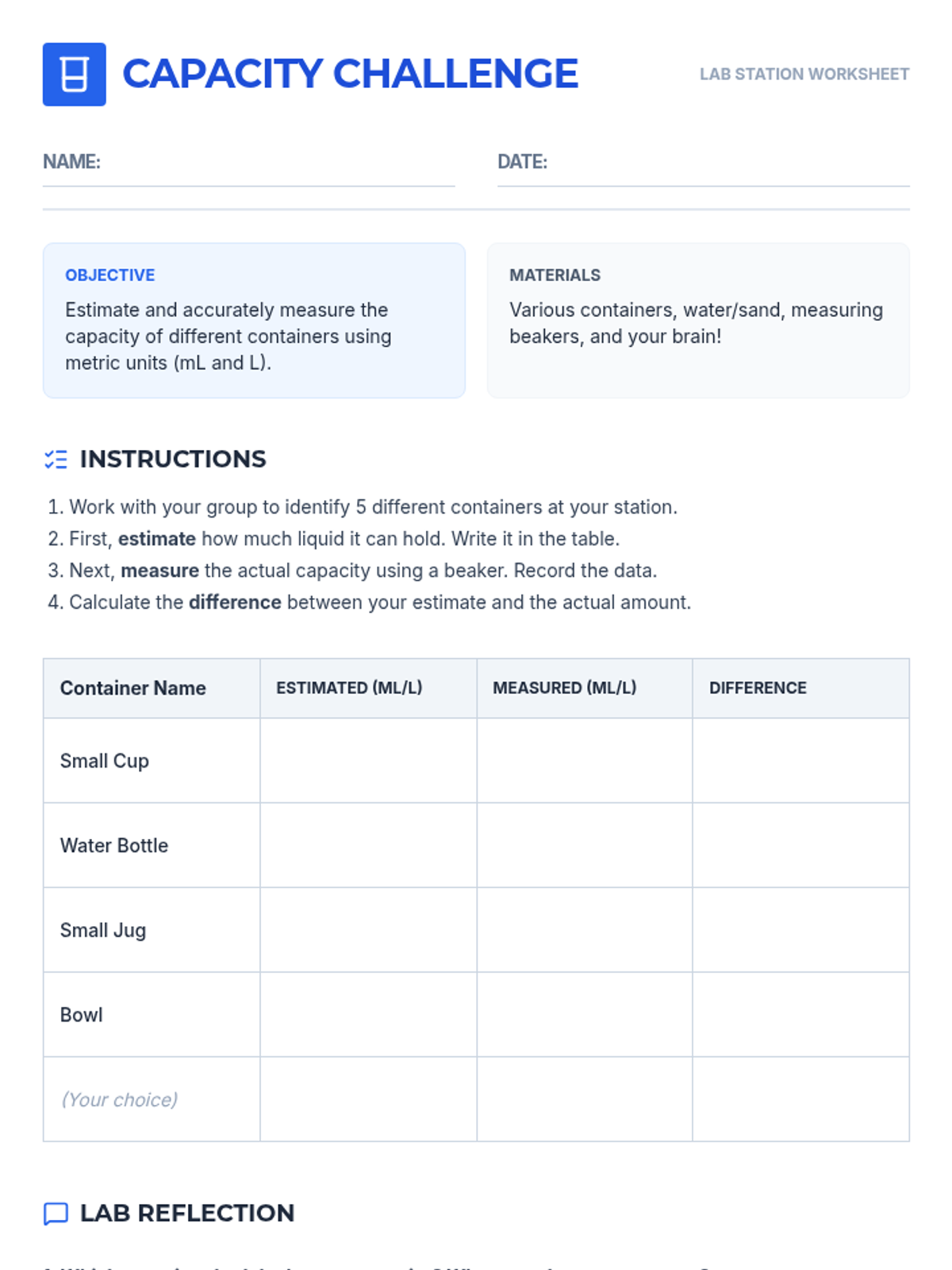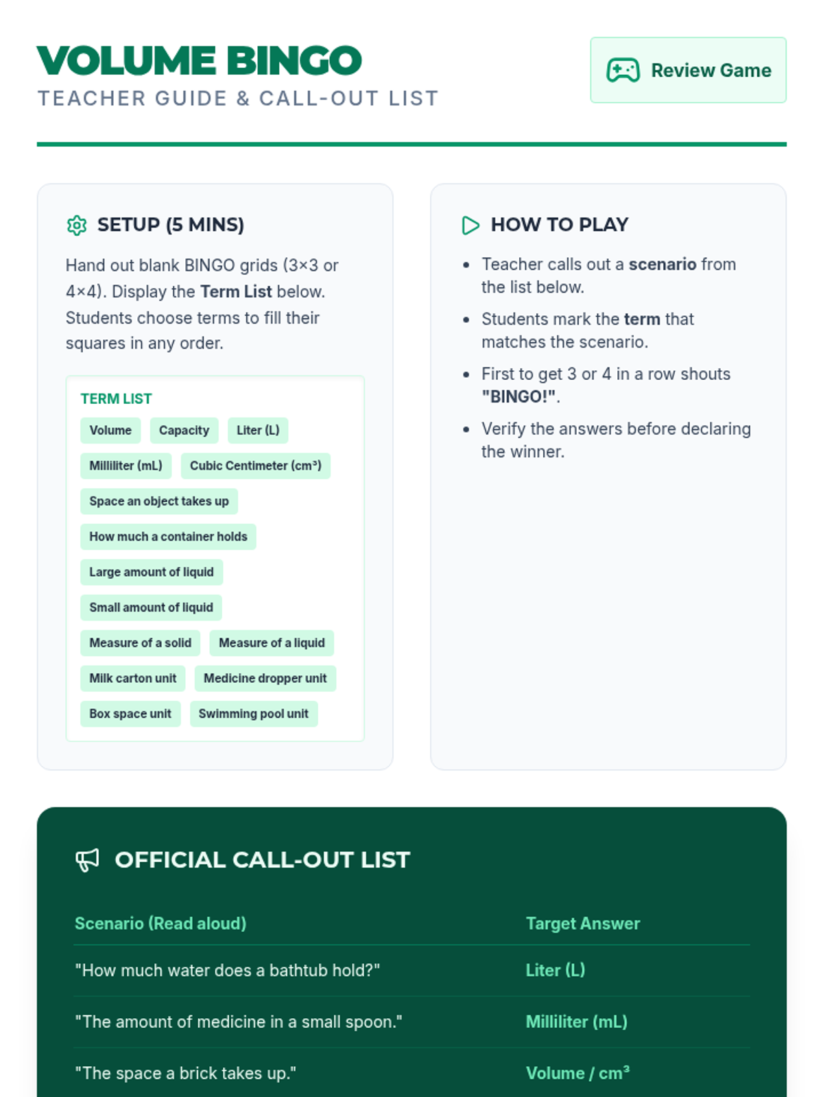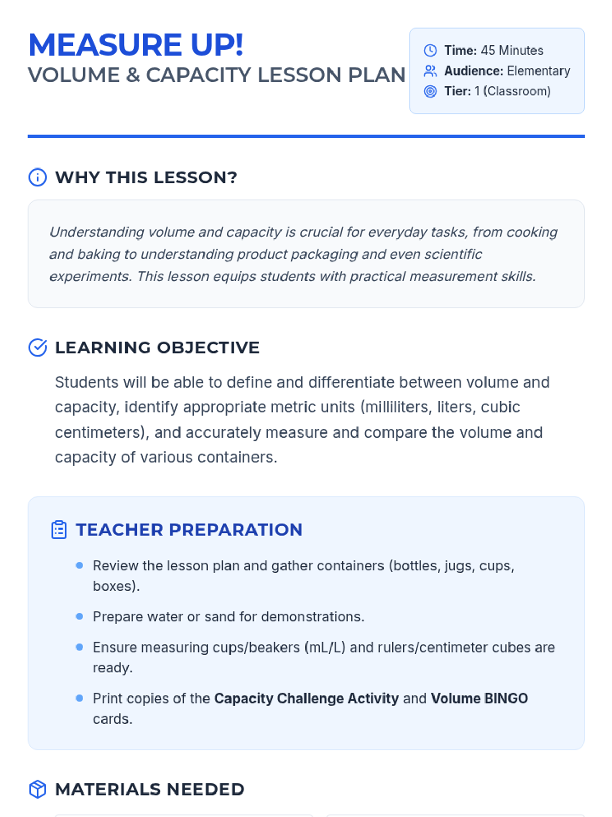 This lesson introduces students to volume and capacity using metric units (L, mL, cm³). It includes hands-on activities, a slide deck for instruction, and a review game.