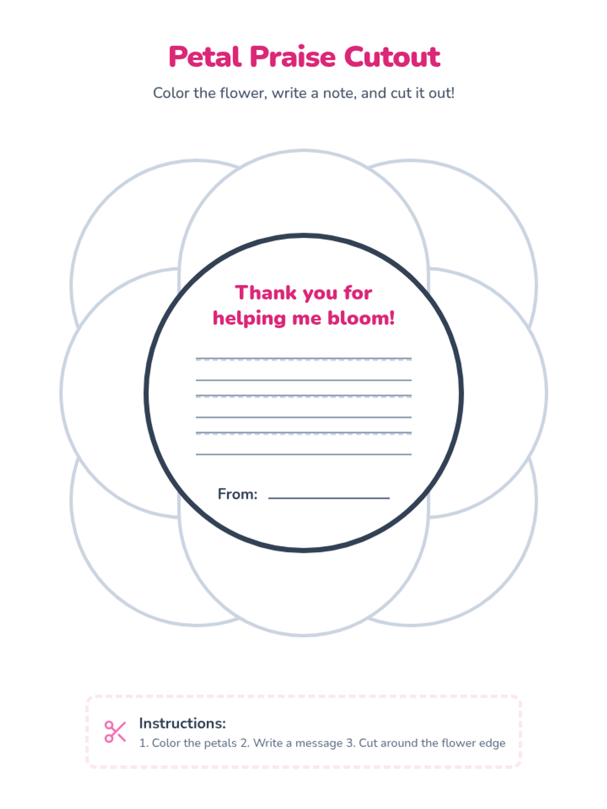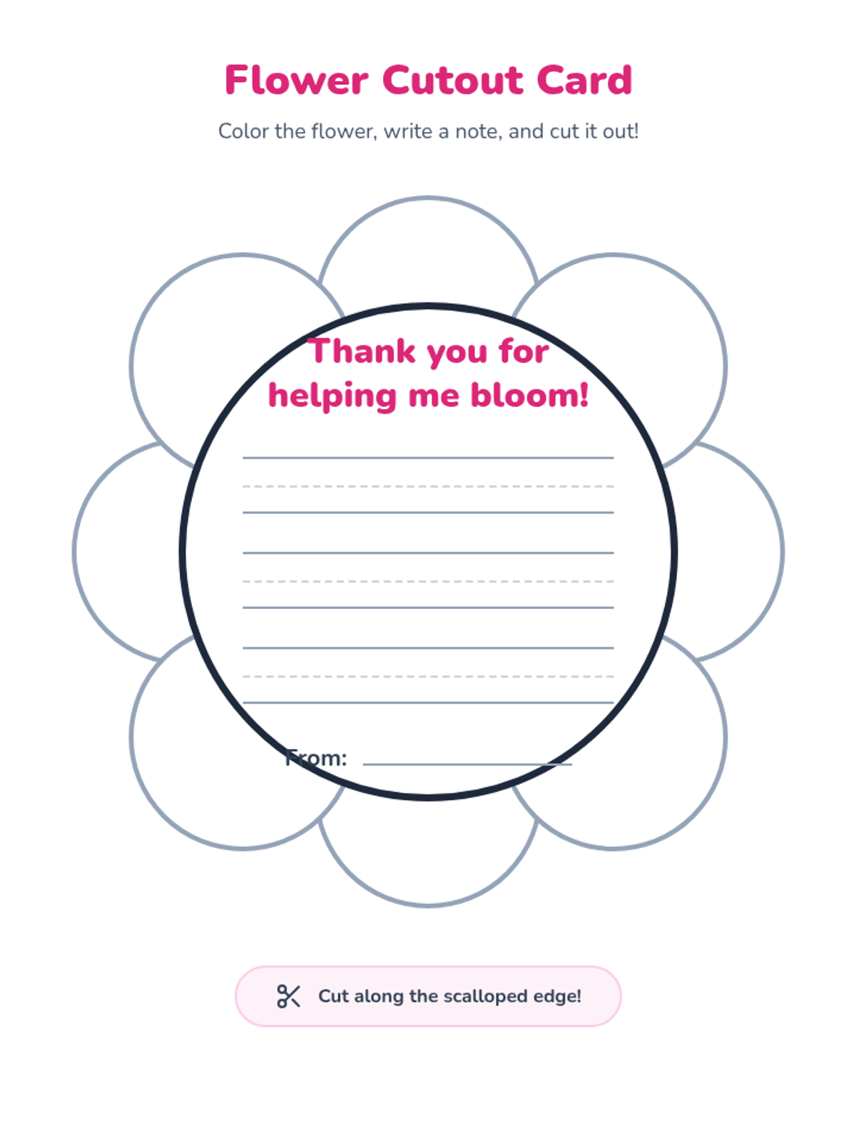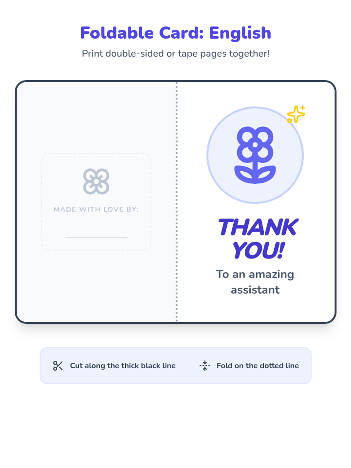 A collection of flower-themed thank you cards for Assistant Appreciation Week, featuring English and Spanish versions in both cutout and foldable formats. Includes primary dotted lines for student writing and whimsical illustrations for coloring.