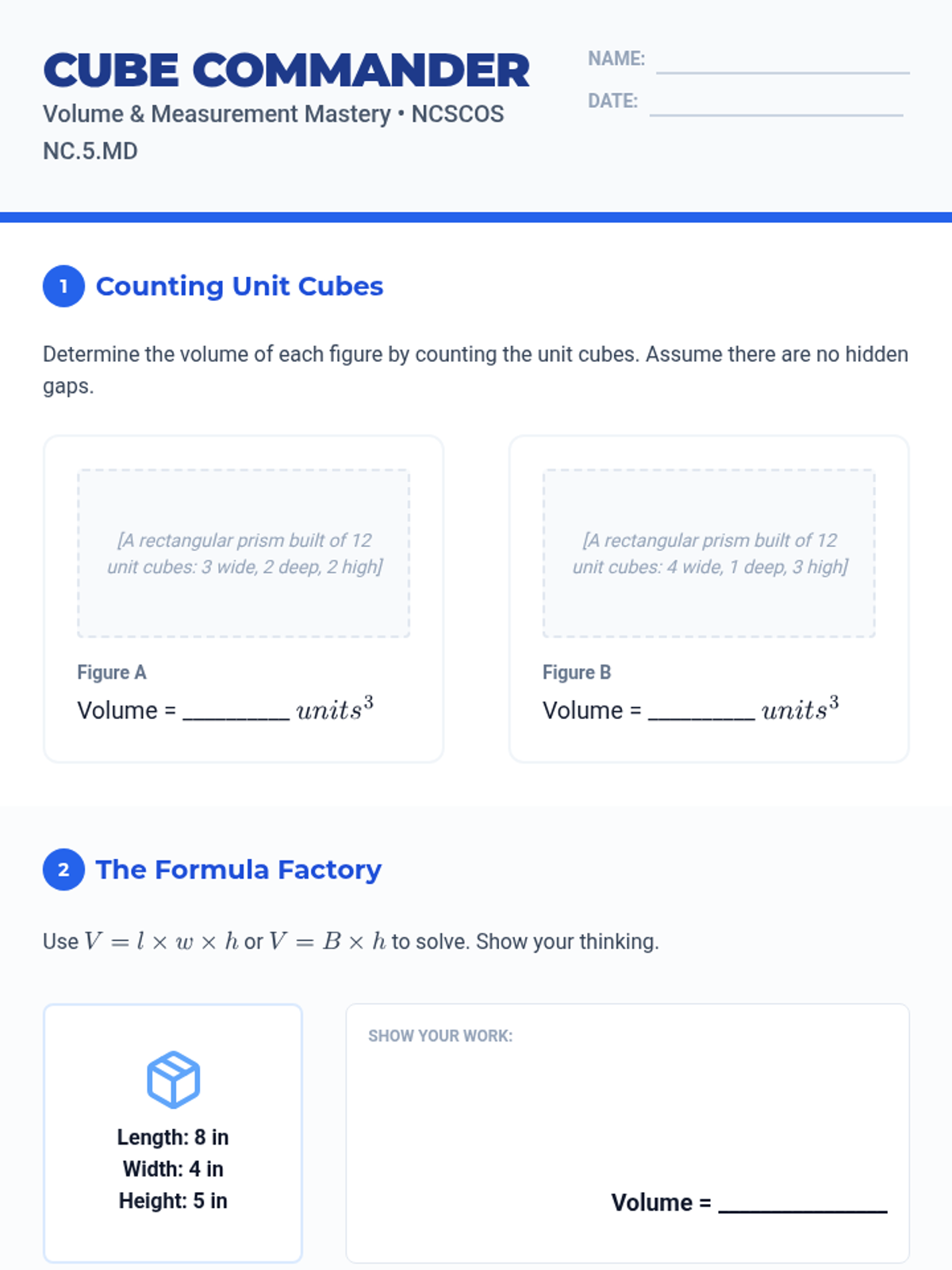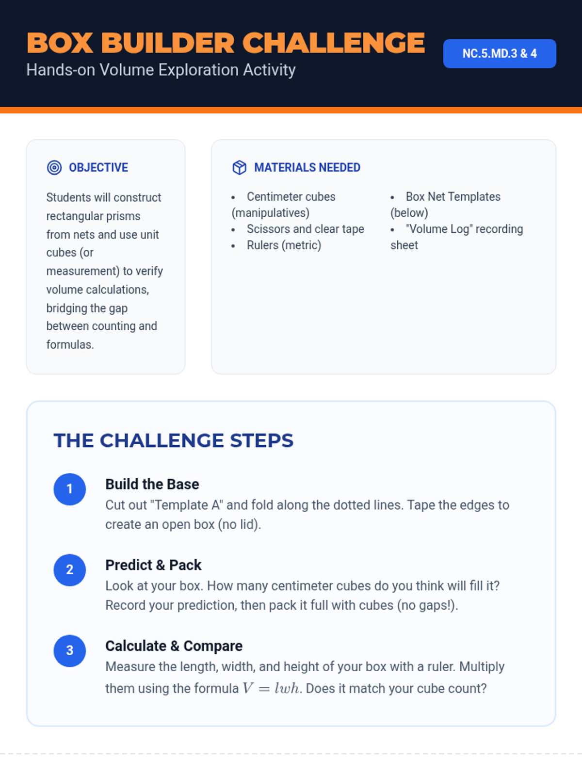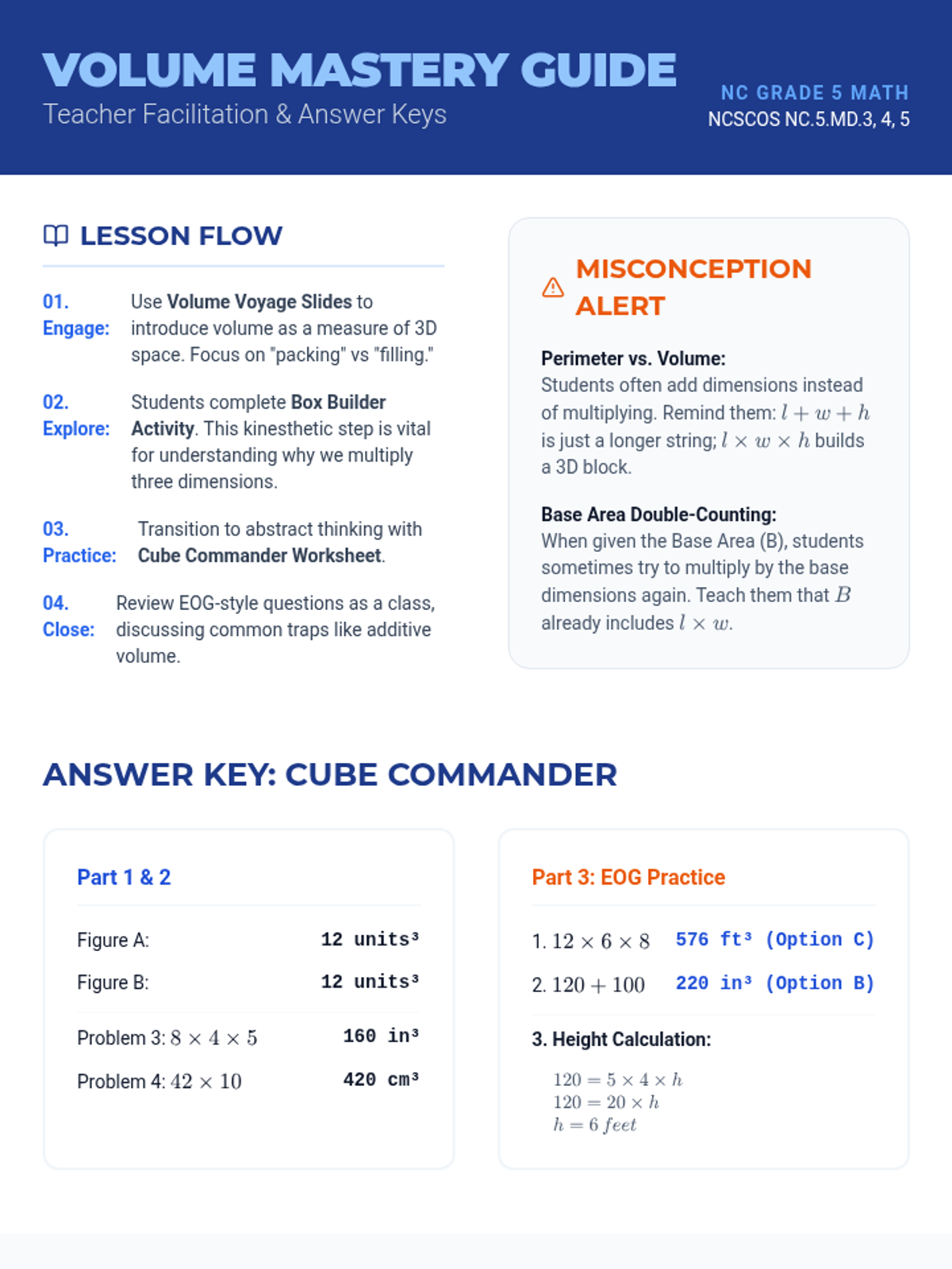 A comprehensive 5th grade math lesson focused on understanding and calculating volume of rectangular prisms, aligned to NCSCOS NC.5.MD standards. Includes visual models, formula application, and EOG-style practice.