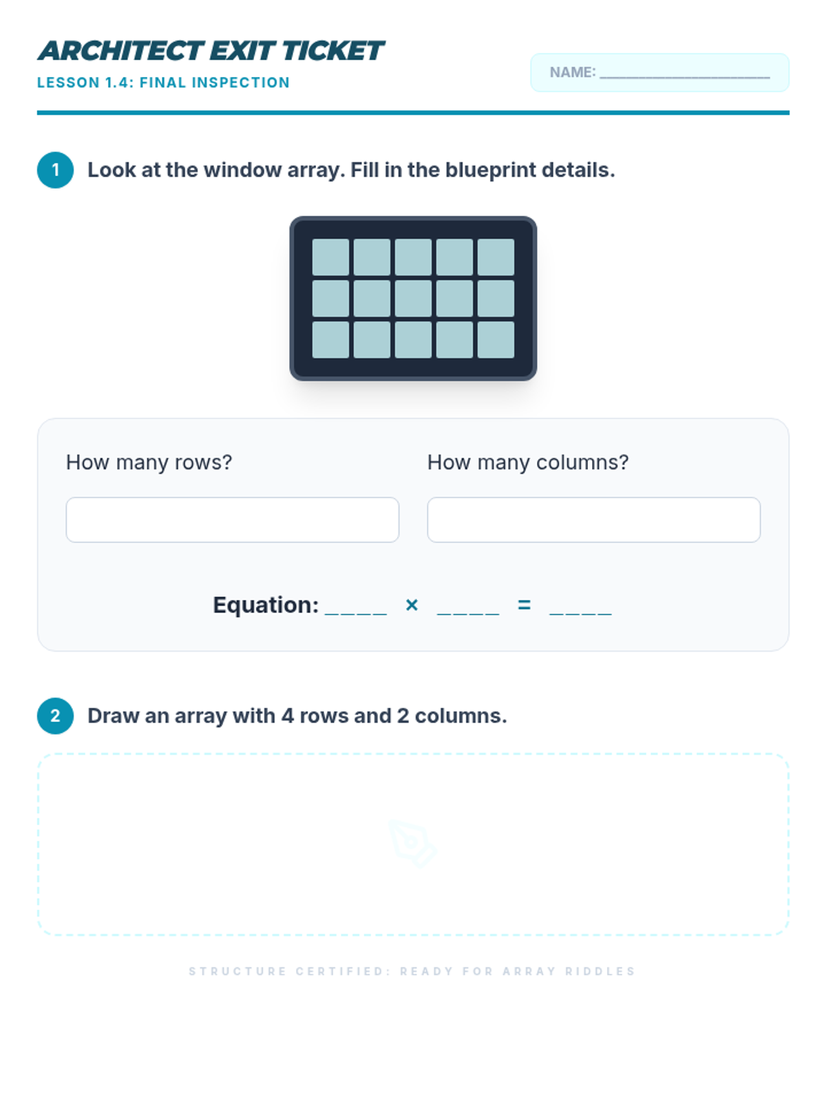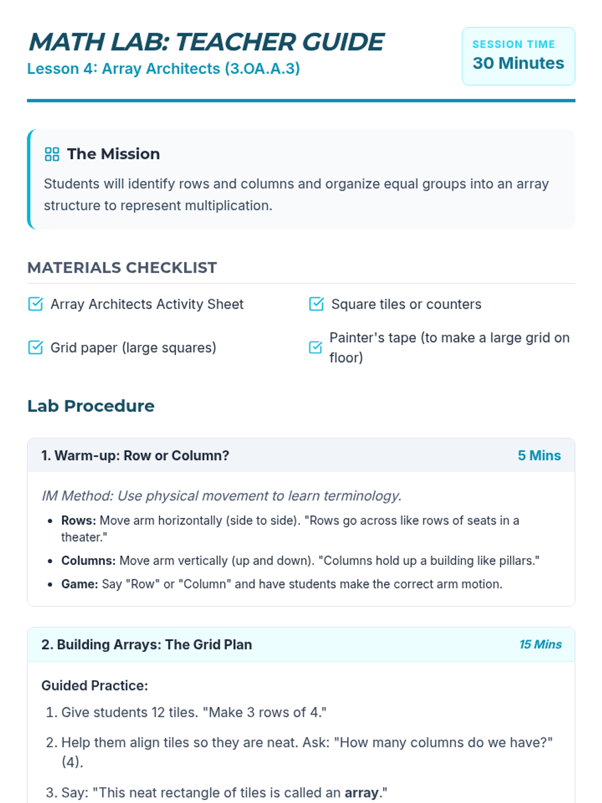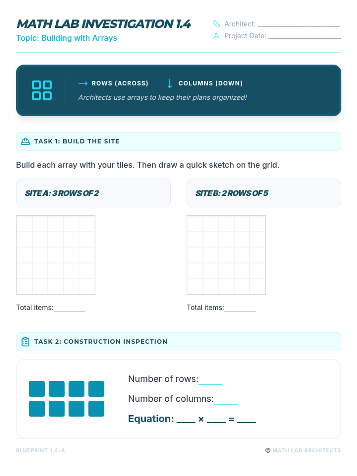 Students organize tiles into rows and columns to create arrays, building the foundation for the area formula.
