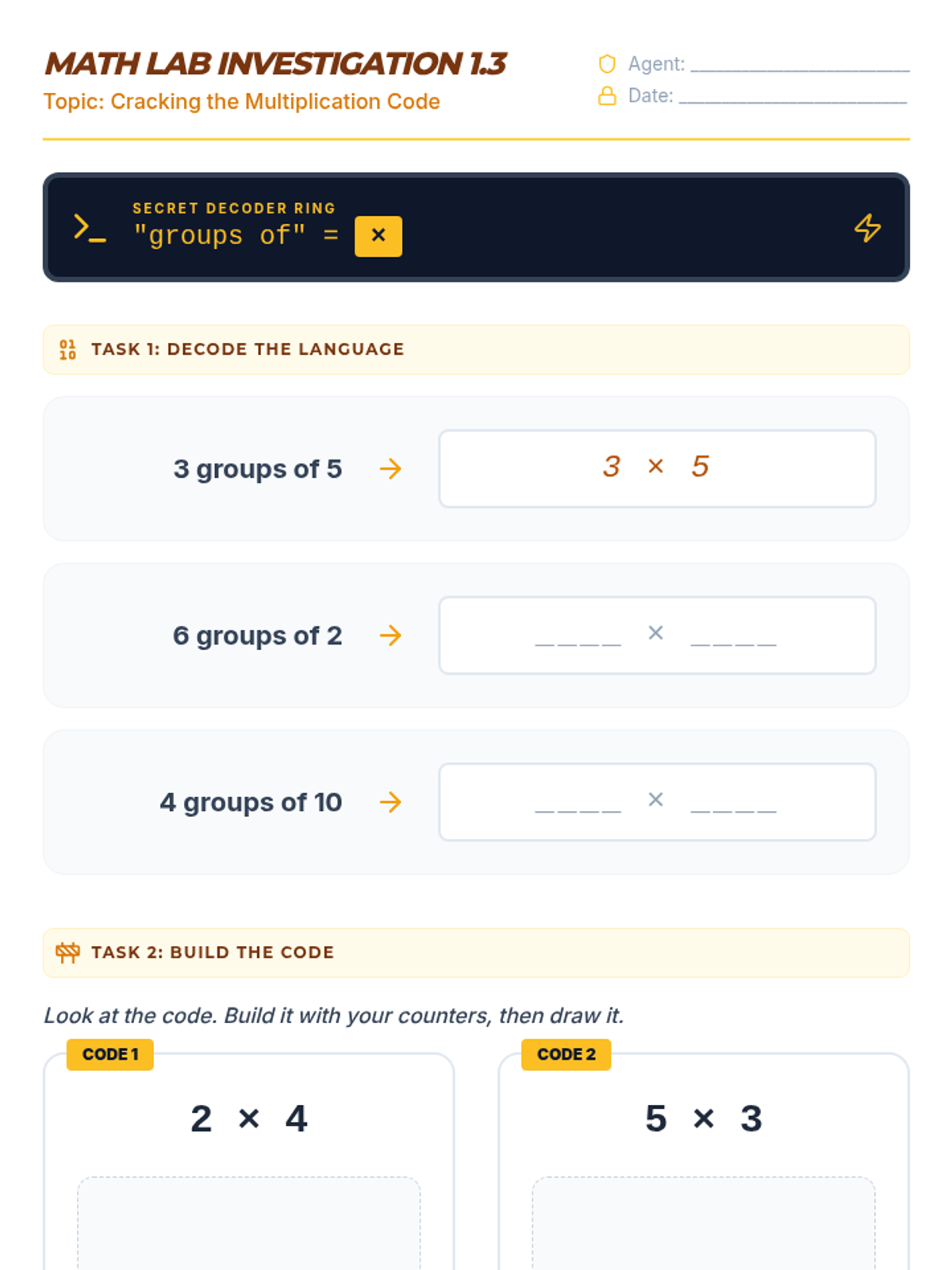 Students bridge the gap between 'groups of' language and the formal multiplication symbol (x) in equations.