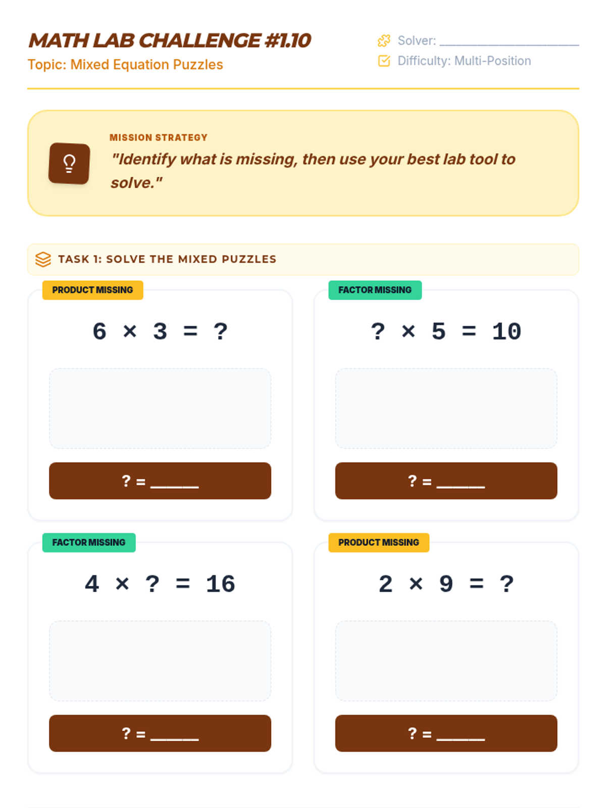 Solving mixed multiplication puzzles involving products, factors, and group counts.