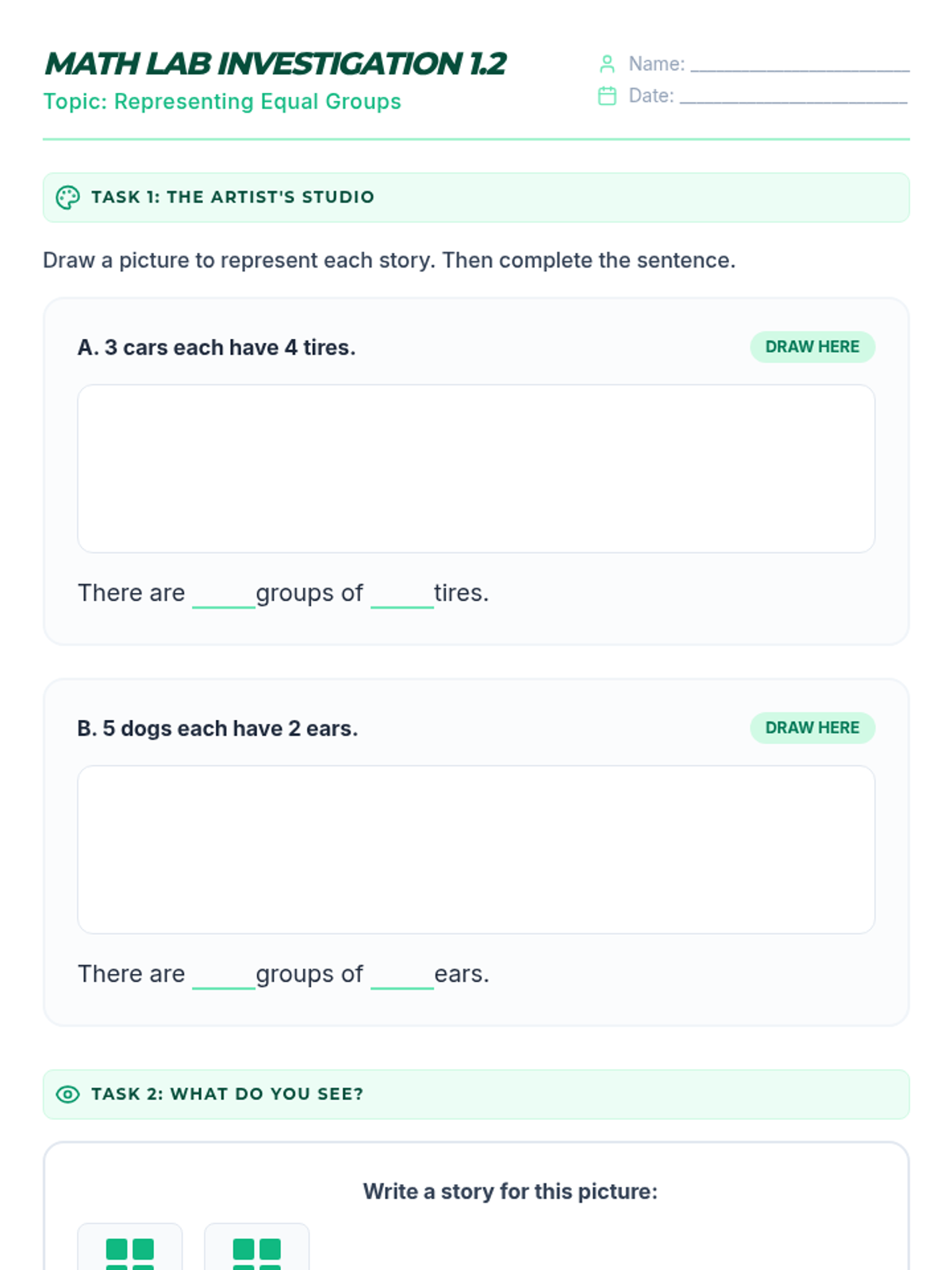 Students represent equal group situations using drawings and connect them to multiplication expressions.