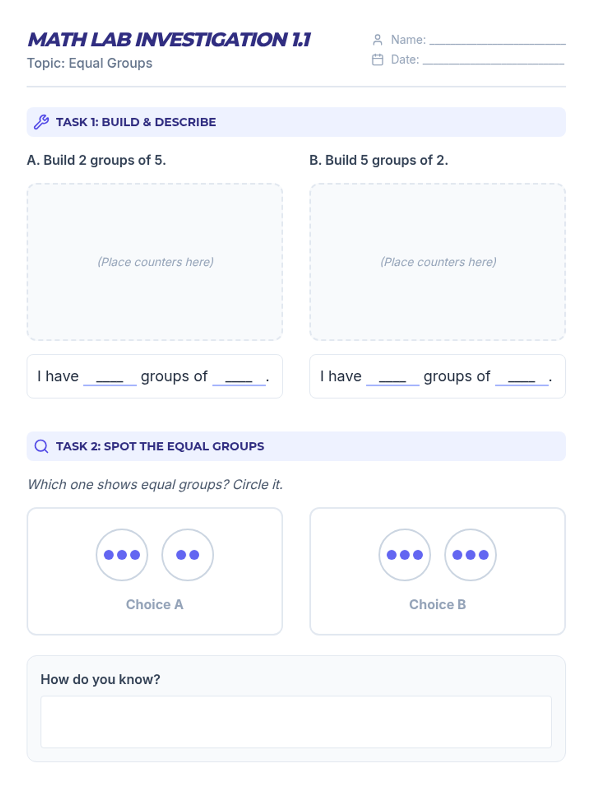 Students explore the concept of multiplication as 'groups of' through hands-on manipulation of counters and descriptive language.