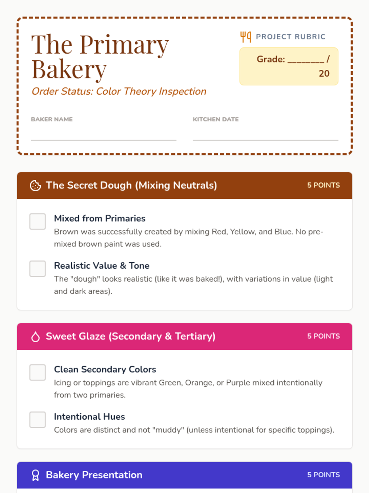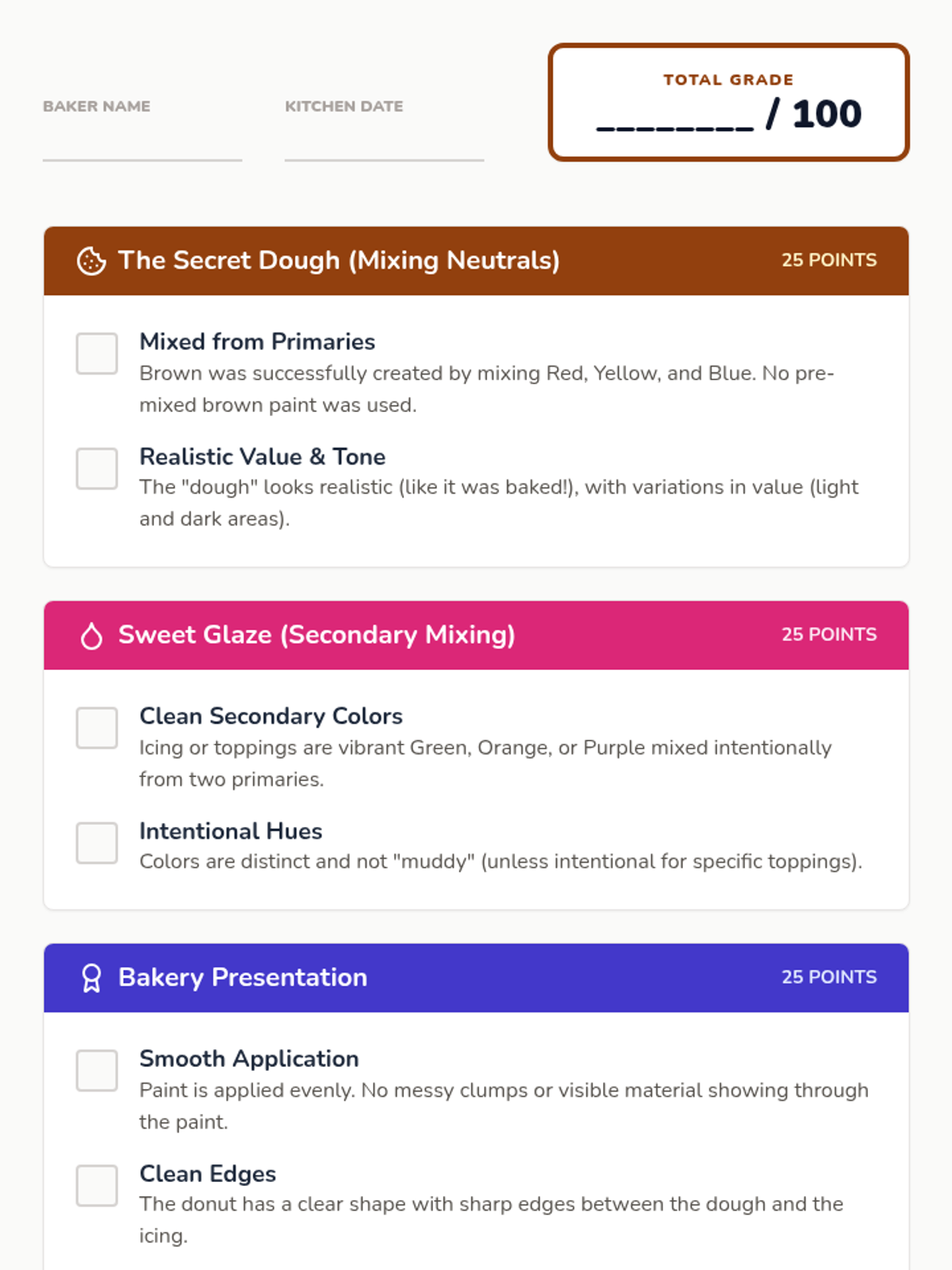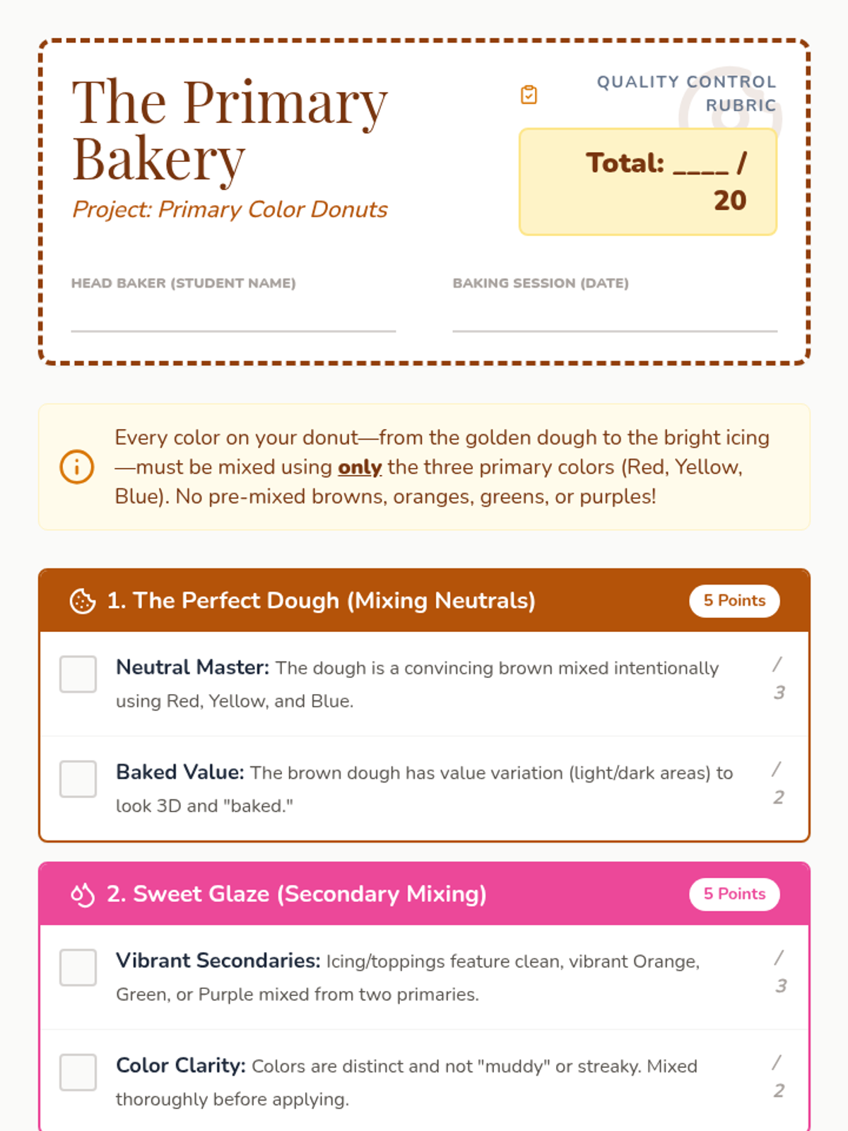 A hands-on color theory project where 7th-grade students learn to mix complex neutrals and vibrant hues using only the three primary colors to create a realistic 3D or 2D donut.