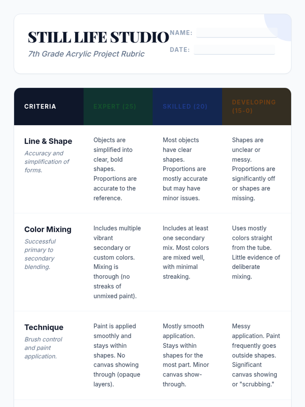 A fast-paced introduction to still life painting for 7th graders, focusing on translating physical objects into bold lines and shapes using acrylic paints and essential color mixing techniques.
