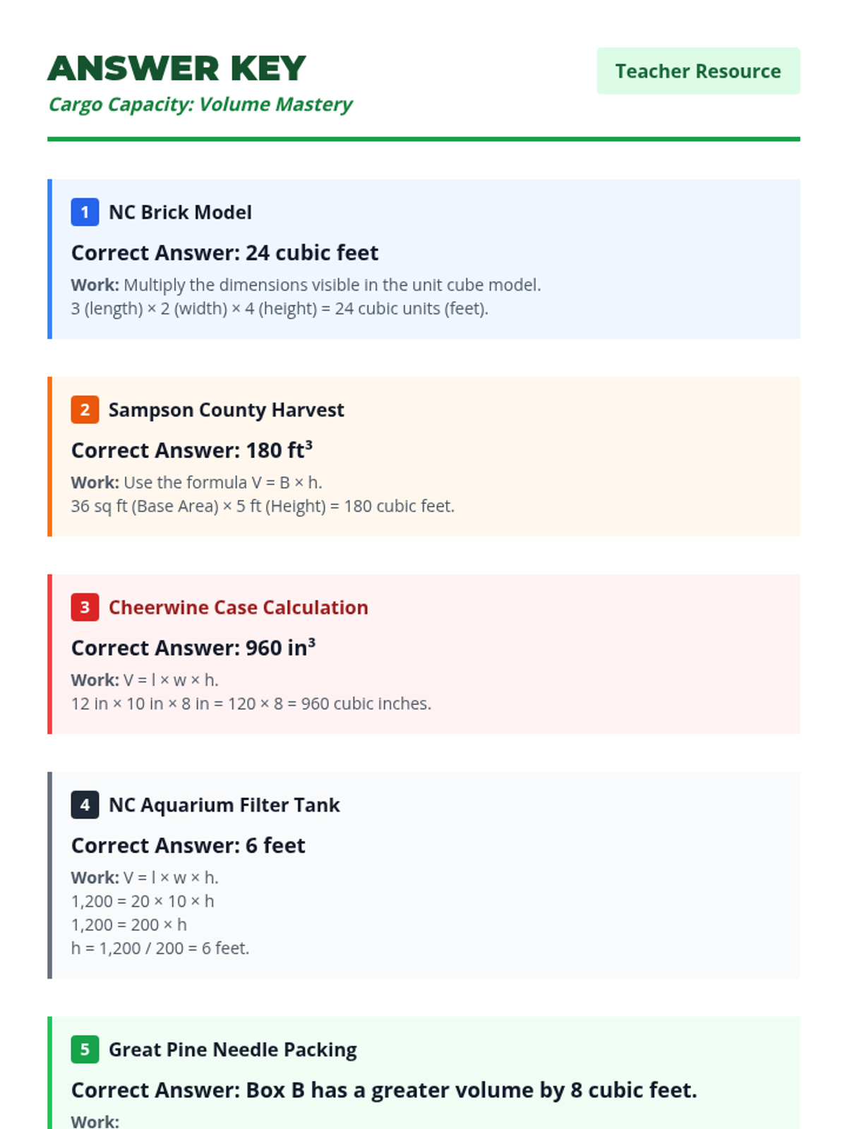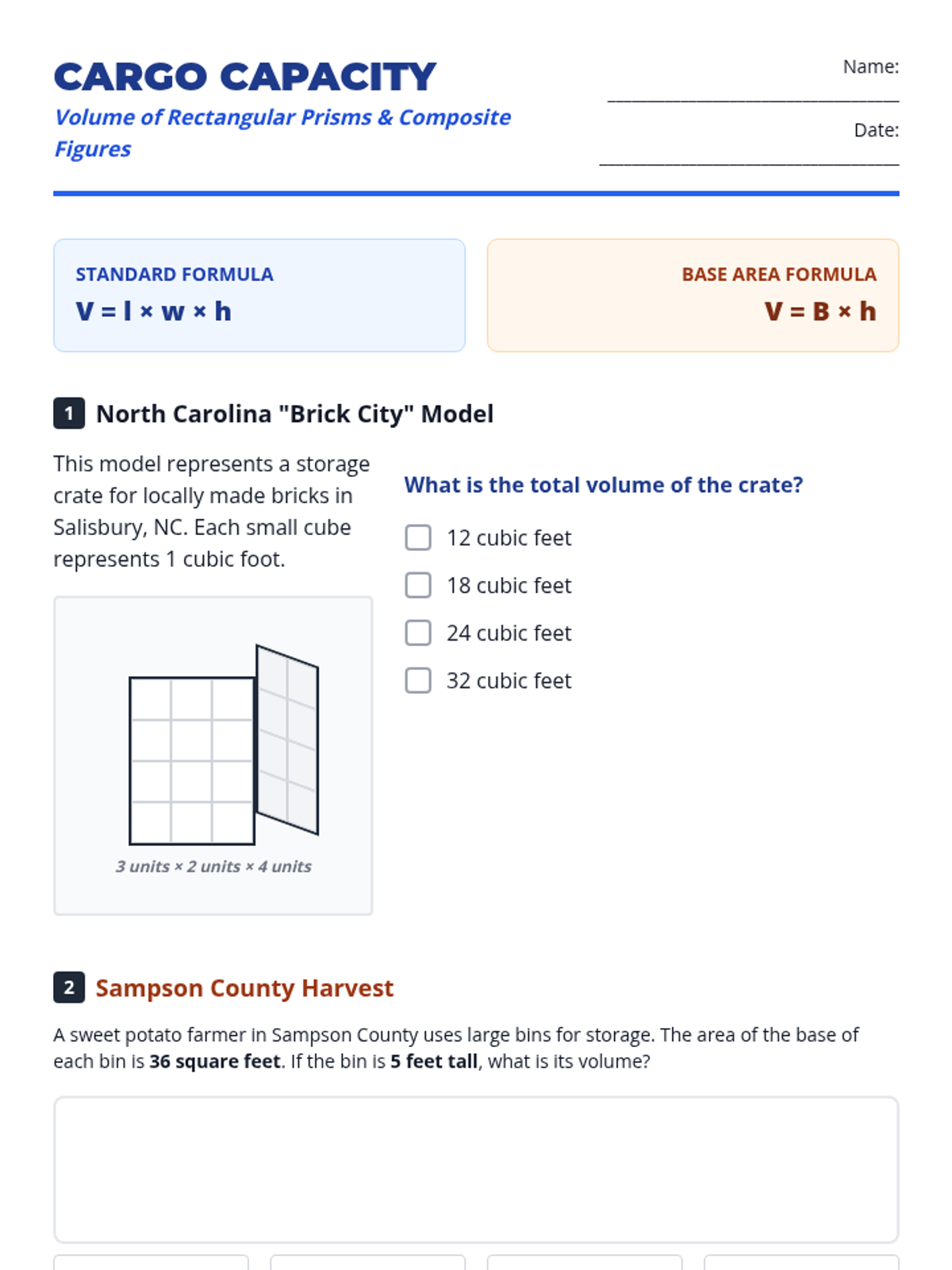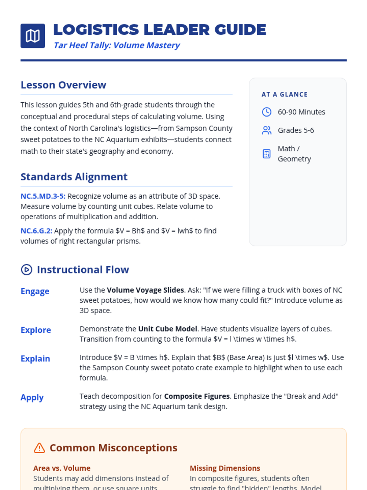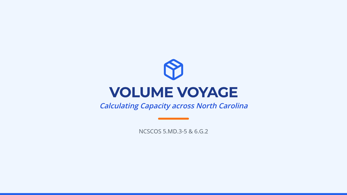A comprehensive math lesson on calculating the volume of rectangular prisms and composite figures using NC-themed contexts like sweet potato shipping and aquarium design. Students progress from unit cubes to formulas and decomposition, aligned with NCSCOS 5th and 6th-grade standards.