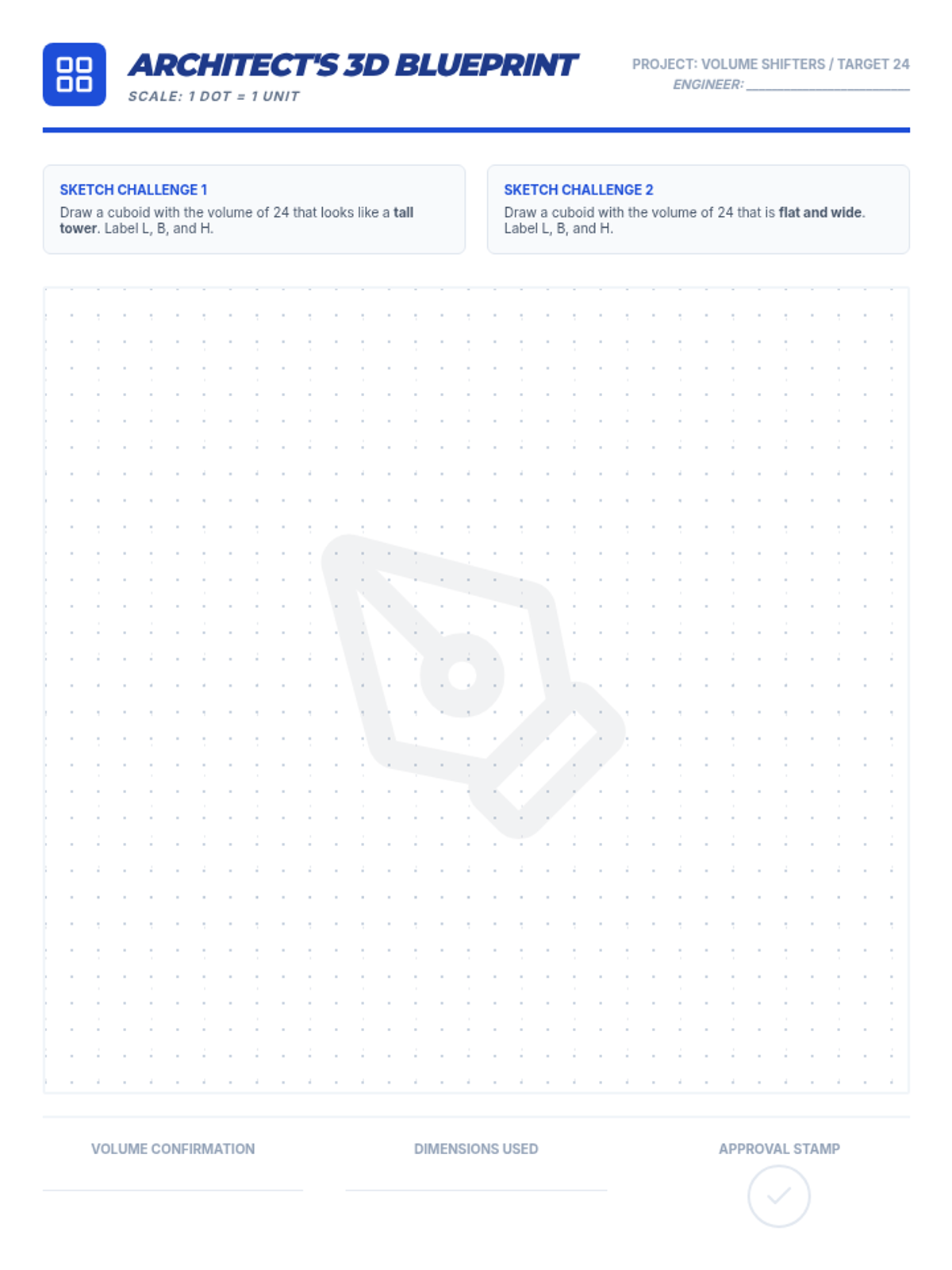 A lesson focused on solving real-world area and perimeter problems, including finding unknown side lengths and comparing rectangles with different dimensions but shared properties. Students act as junior architects to design and analyze blueprints.