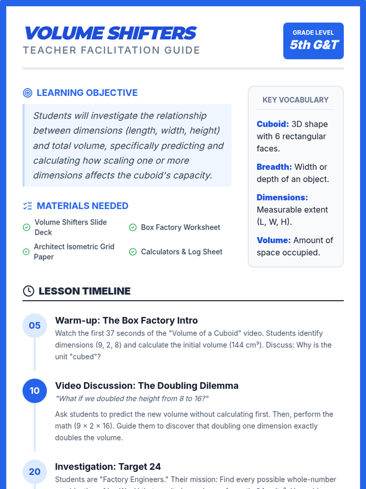 An advanced 5th-grade lesson exploring the relationship between dimensions and volume, featuring a 'Box Factory' theme where students investigate how doubling dimensions affects capacity.
